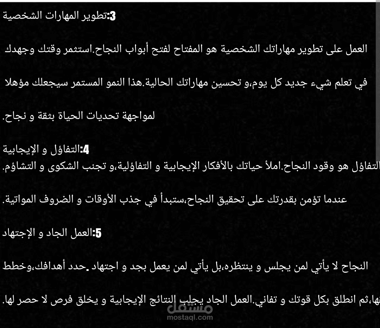رسمت خمسة عوامل مهمة تسهم في النجاح وتجذب اهتمام القراء. هذه النقاط تشمل وجود رؤية واضحة، واستقبال التحديات، وتطوير المهارات الشخصية، وتعزيز التفاؤل، والعمل الجاد والتفاني.