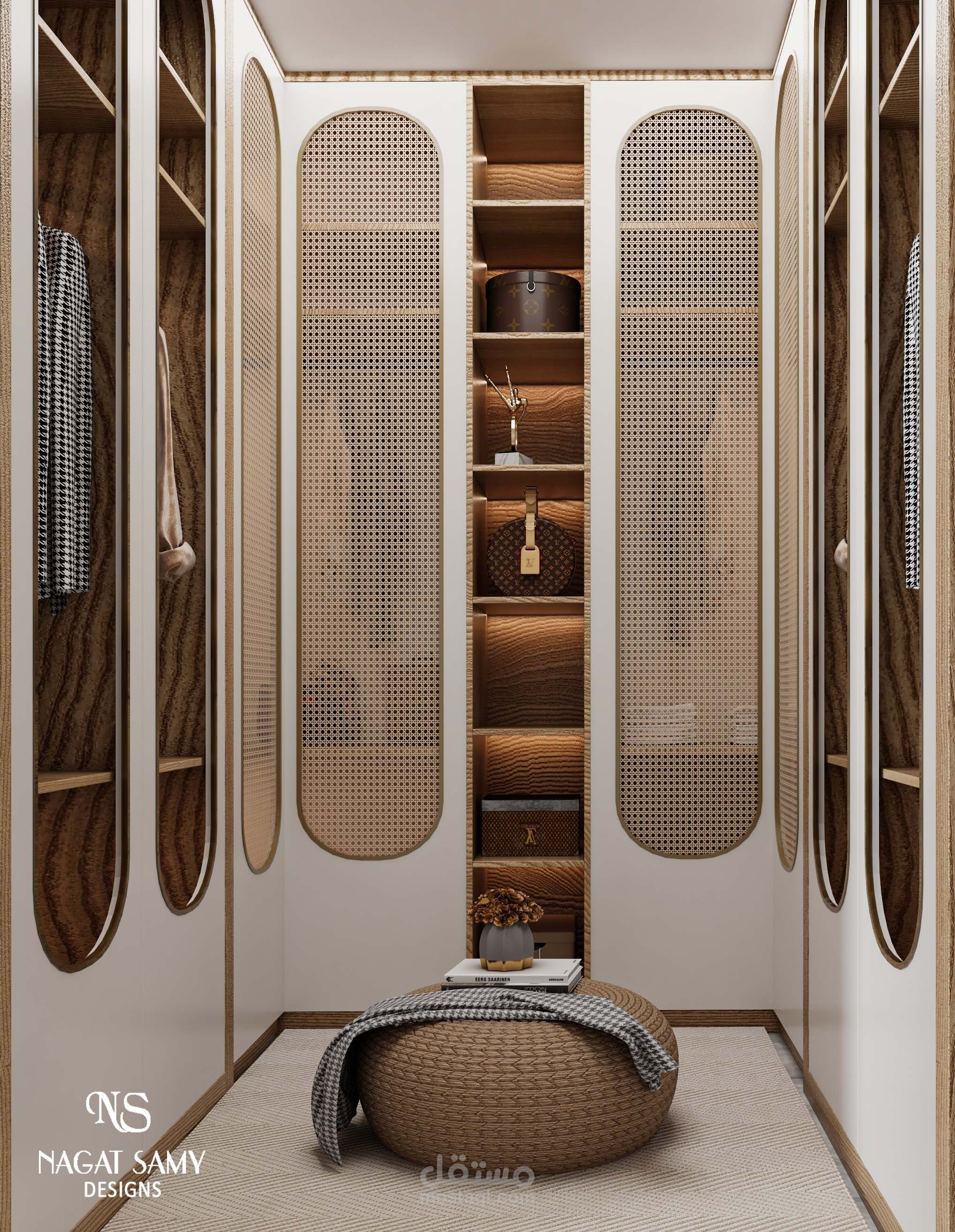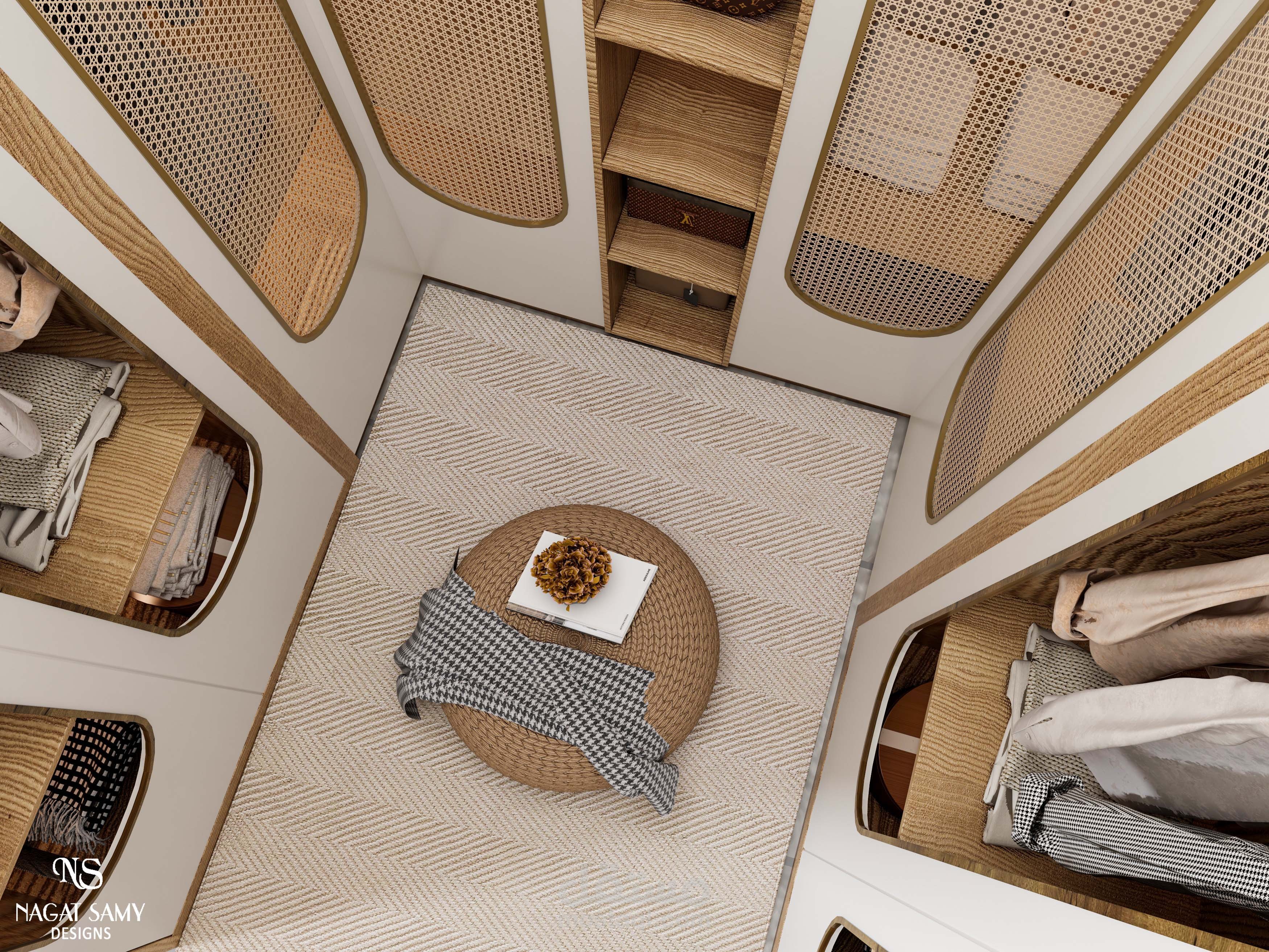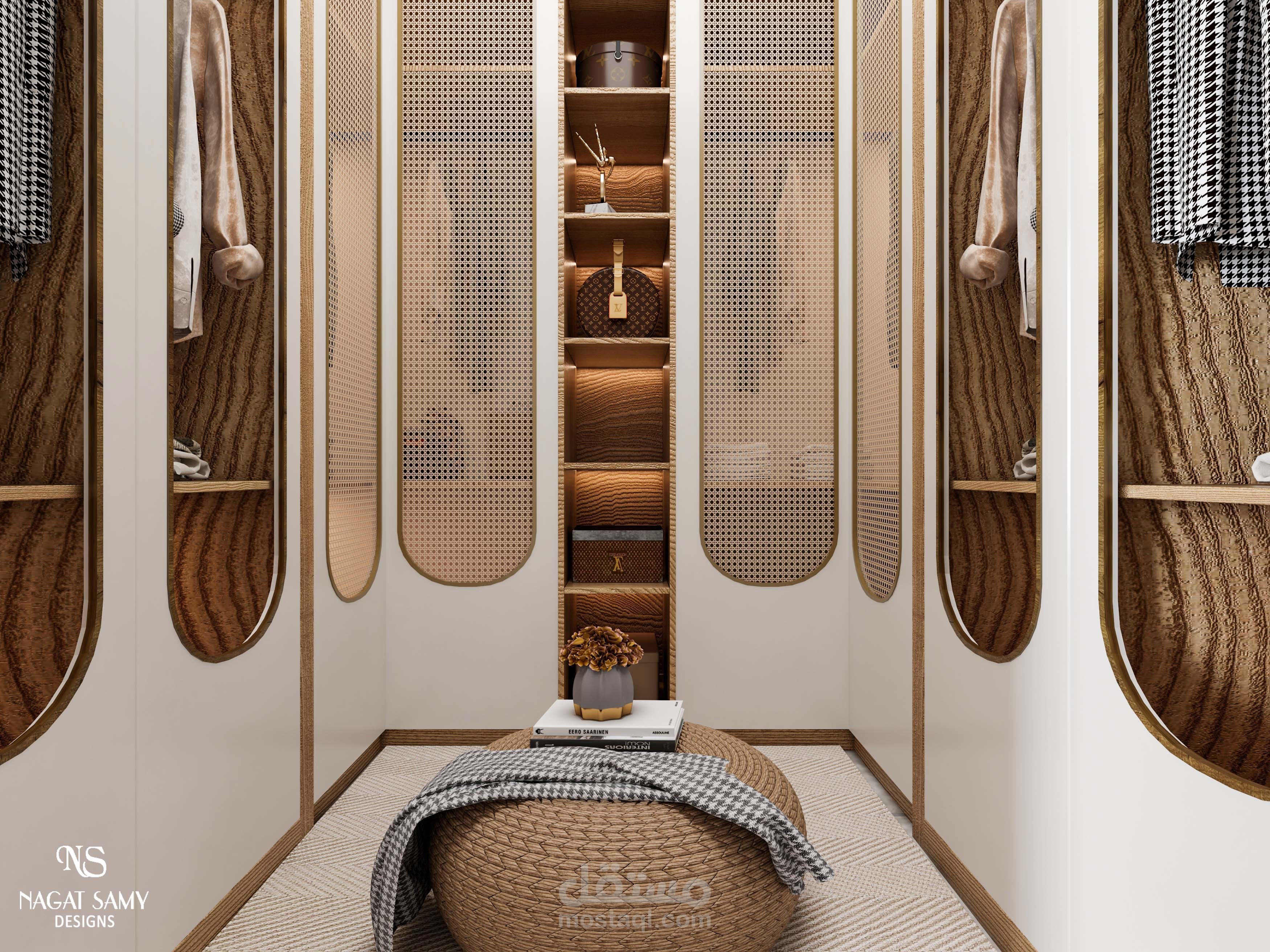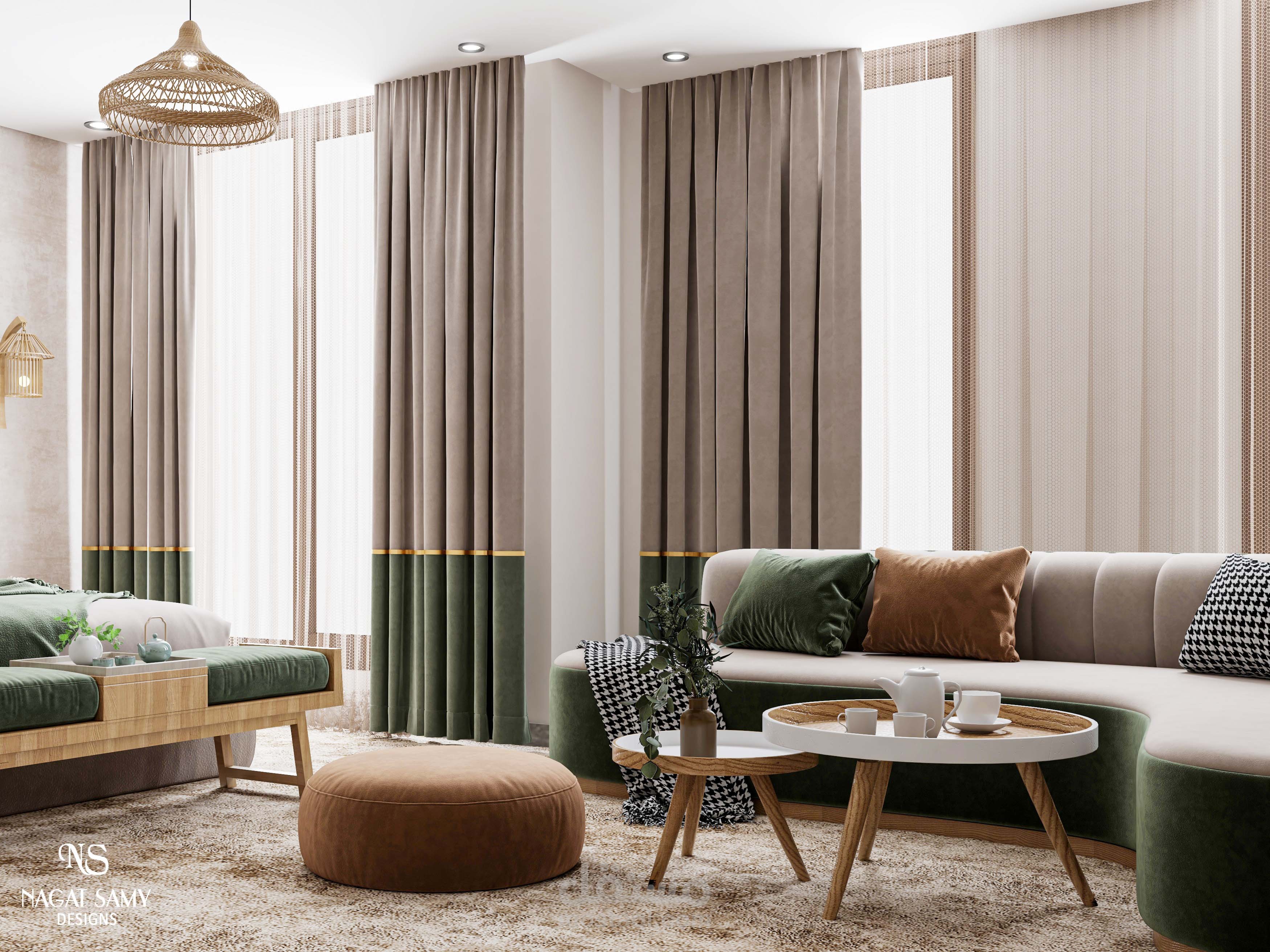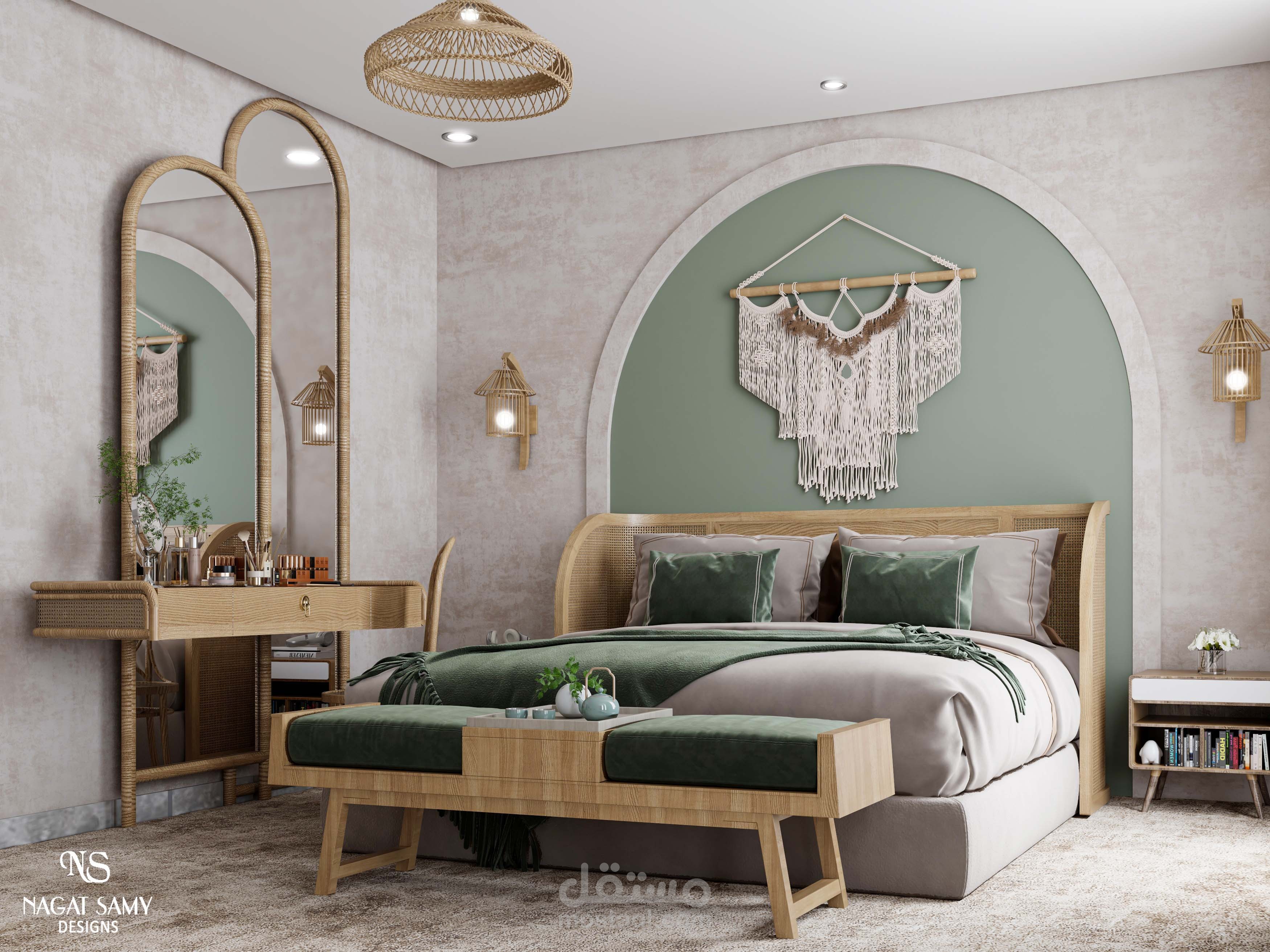 غرفة نوم رئيسية على الطراز البوهيمى يوحى بالبساطه واستخدام عناصر من الطبيعه