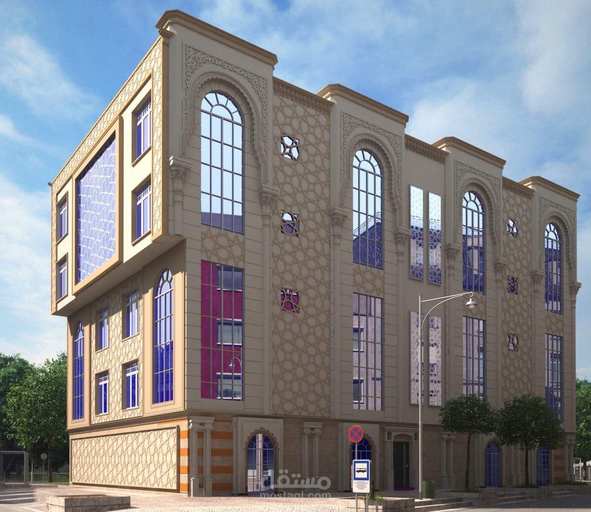 تصميم عمارة على الطراز الاسلامى واستخدام عناصر وتنسيطها والوان هادئة وزجاج ليدل على الحداثة يعطى المكان قوة وتميز