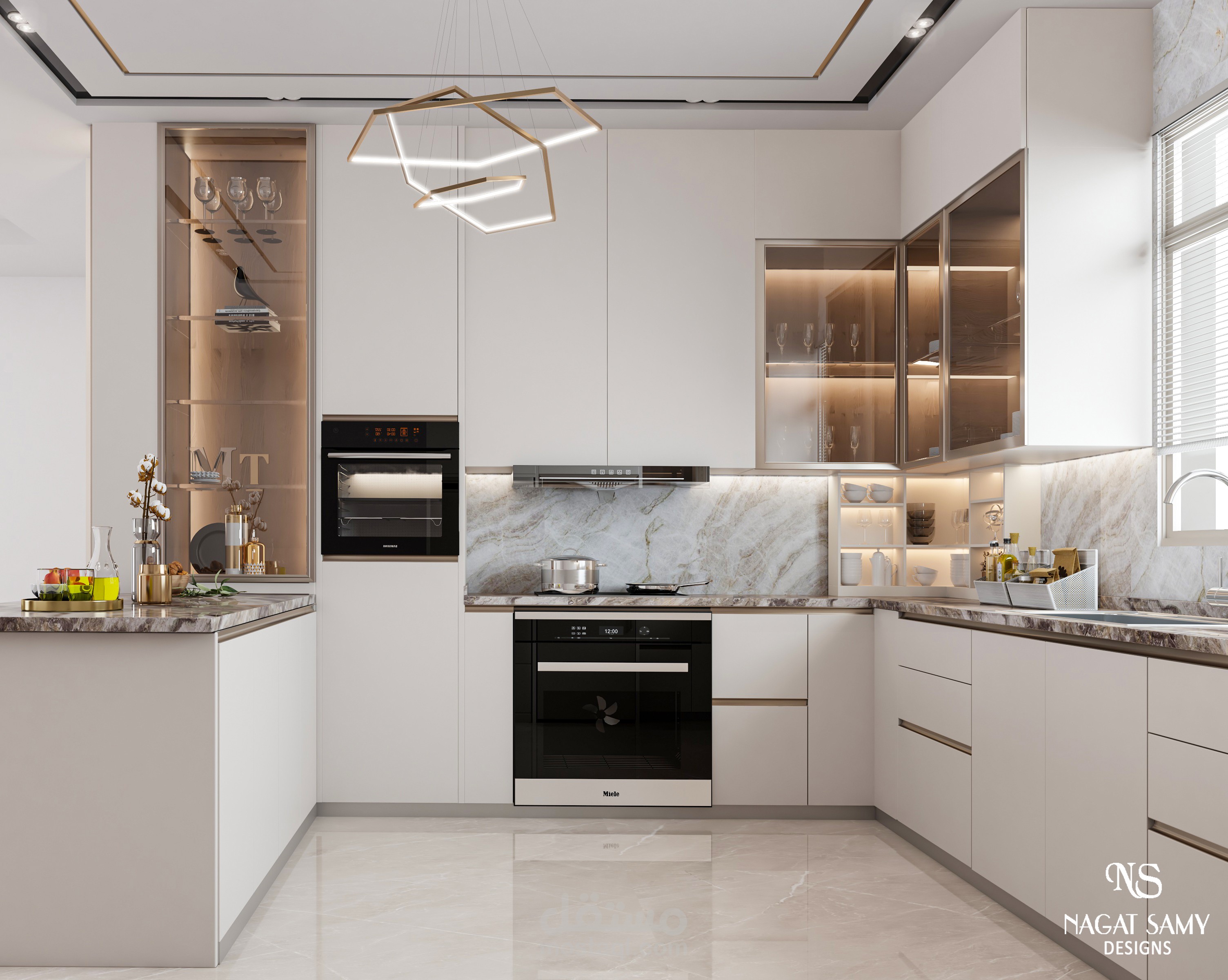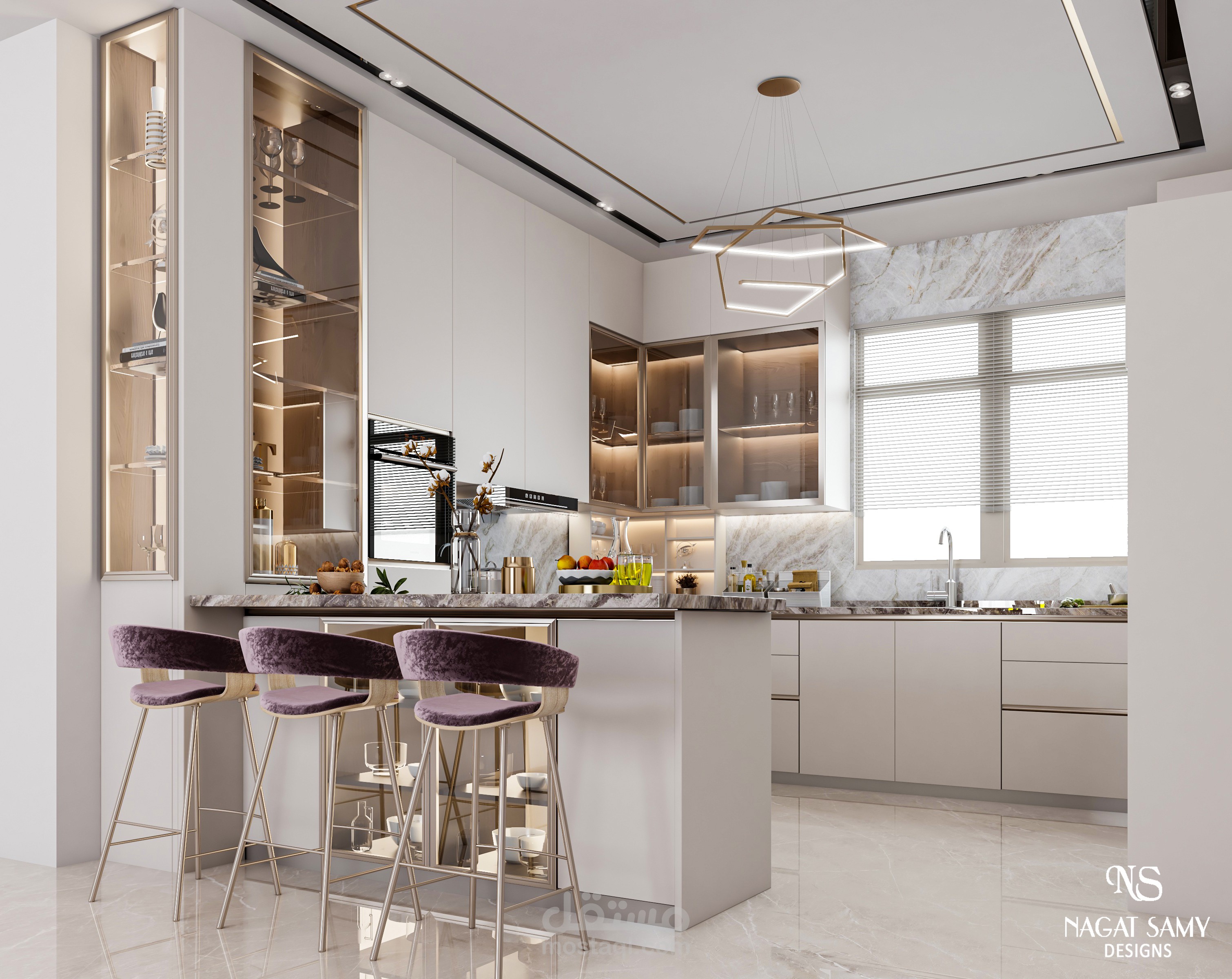 تصميم مطبخ مودرن بالوان فاتحه عطى وسع للمكان واضافة بهجة وهدوء