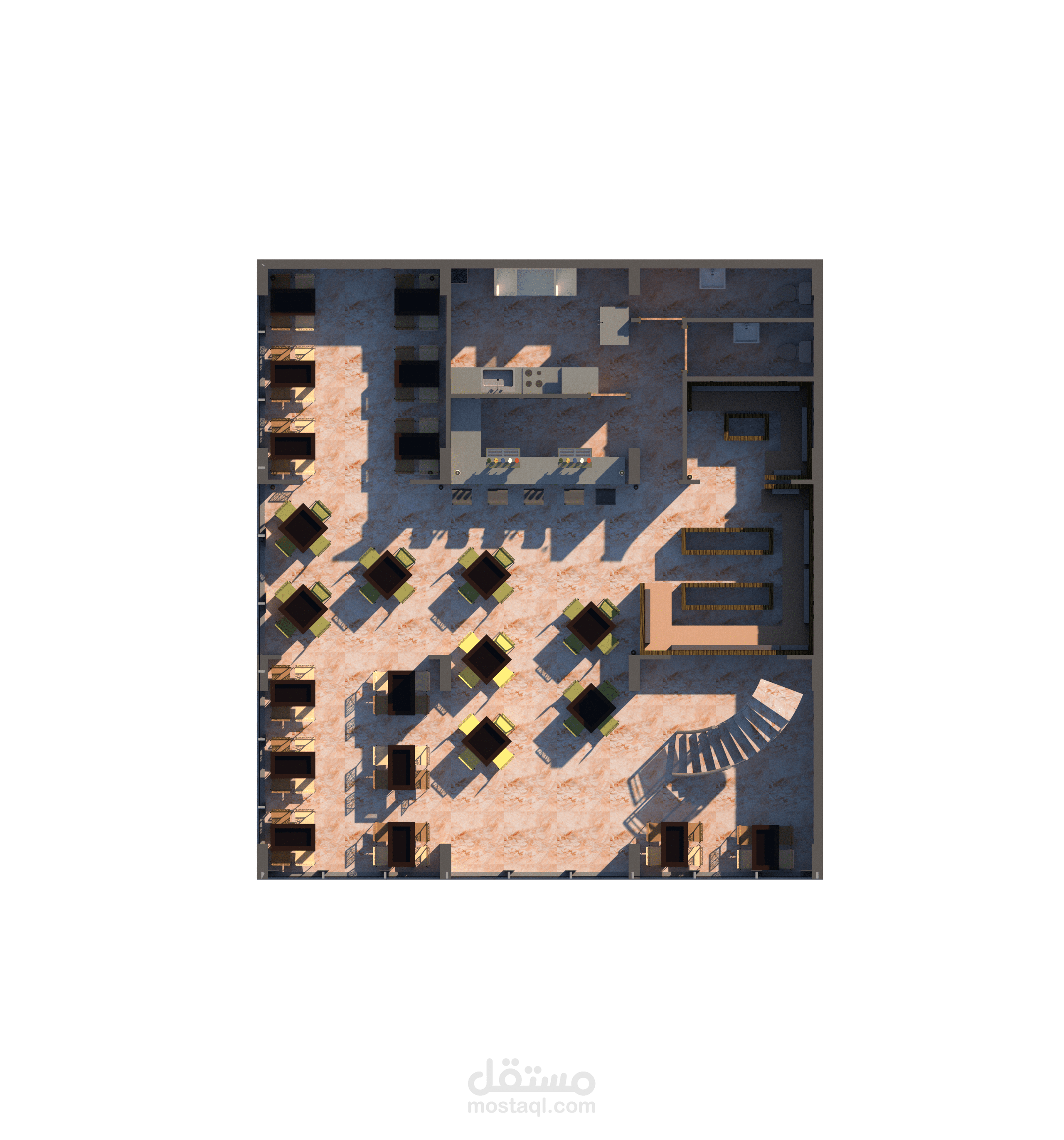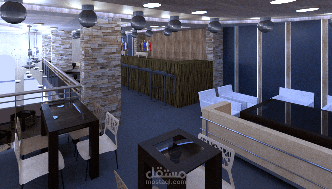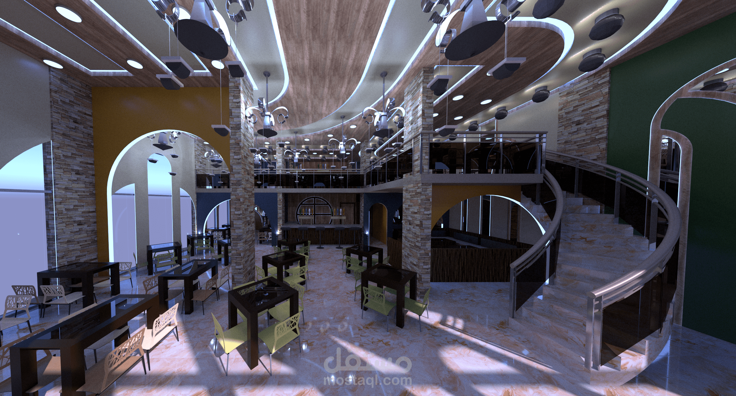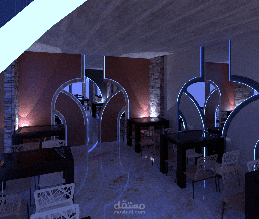 تصميم كفتريا بالوان هادئة واستخدام عمارة ال boho في التصميم من ناحية عناصر والوان الاكساء وشكل التصميم بشكل عام