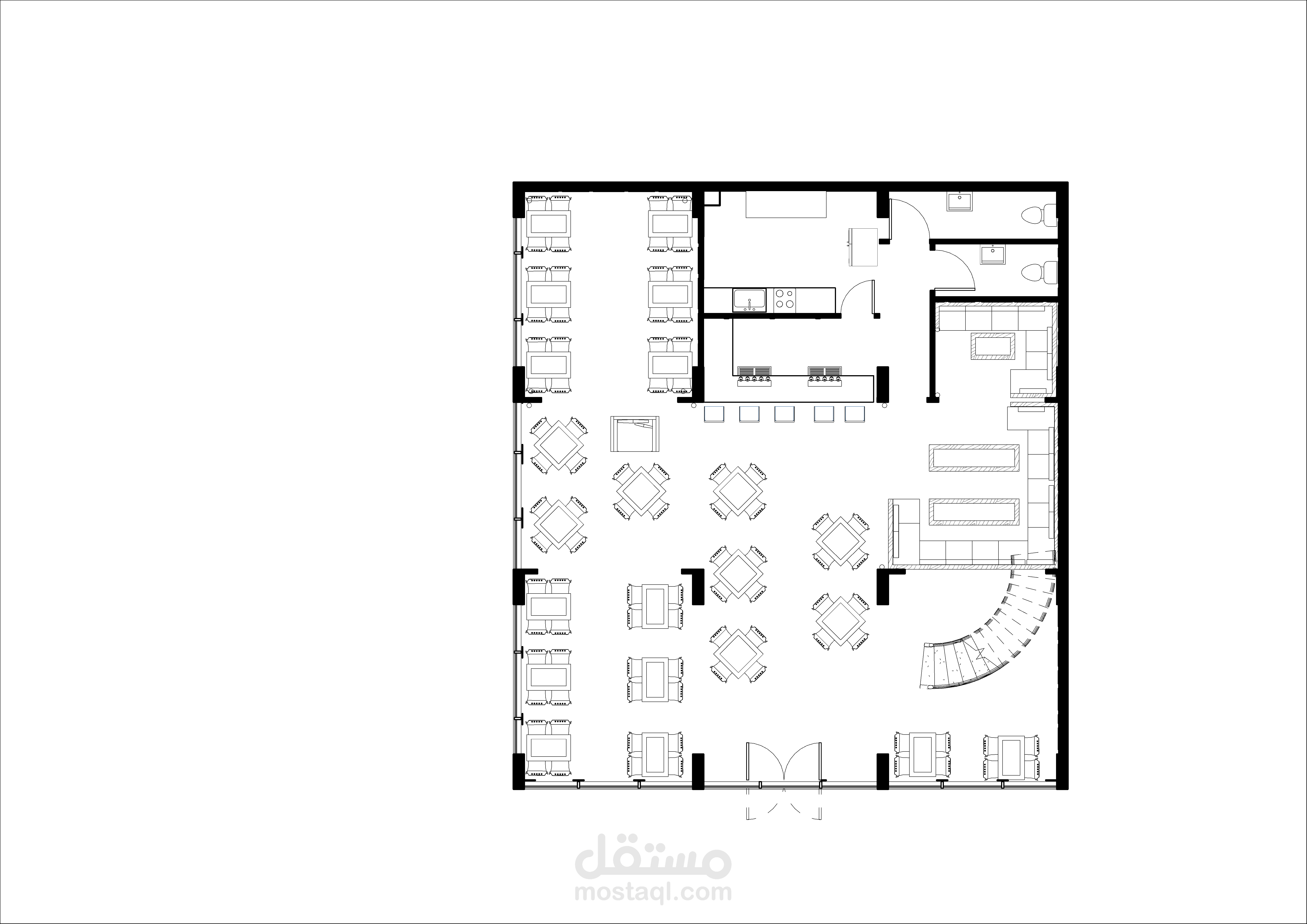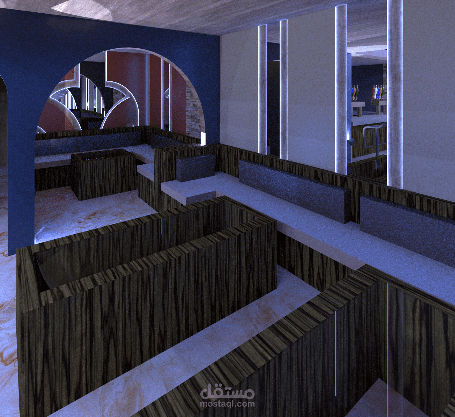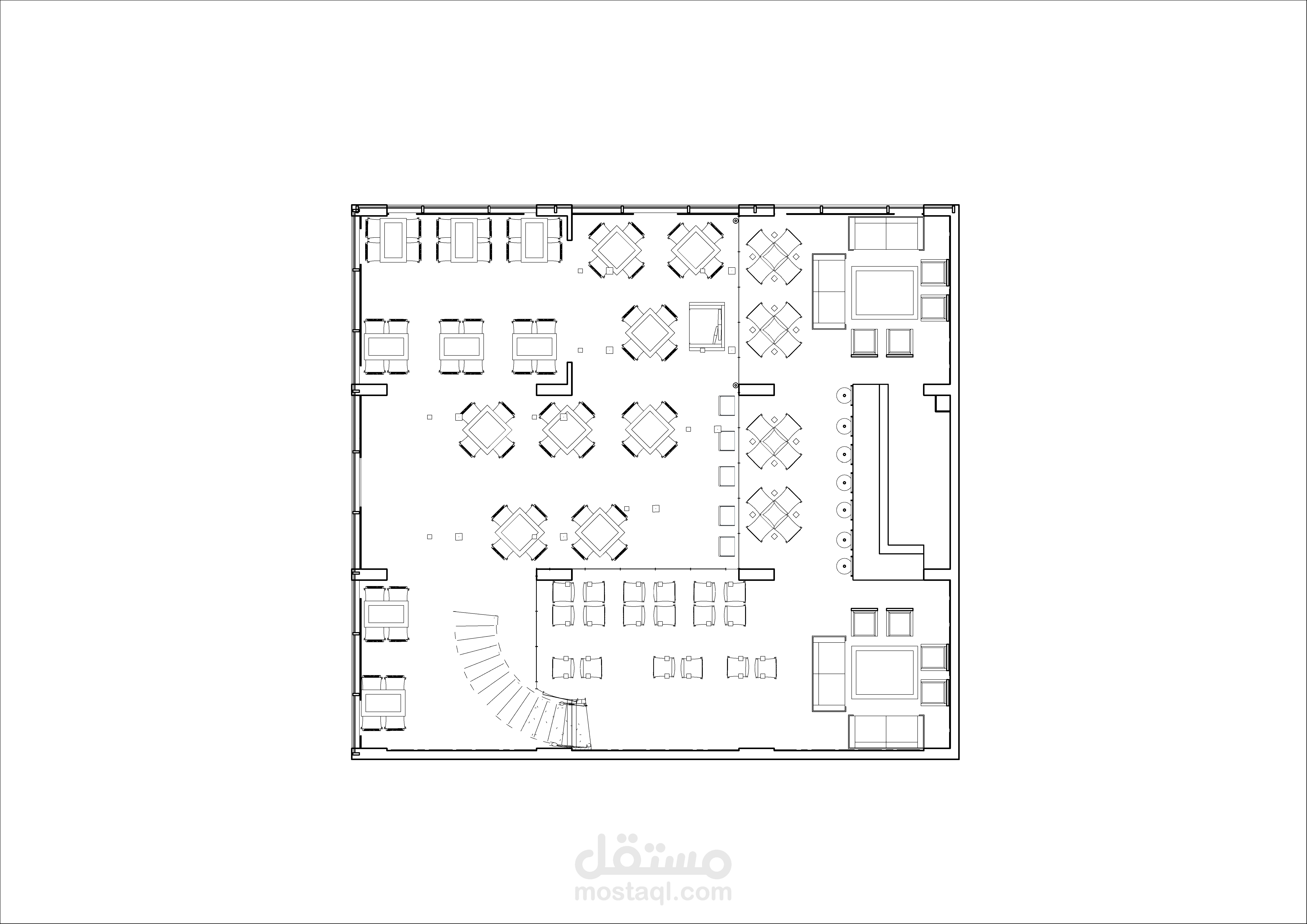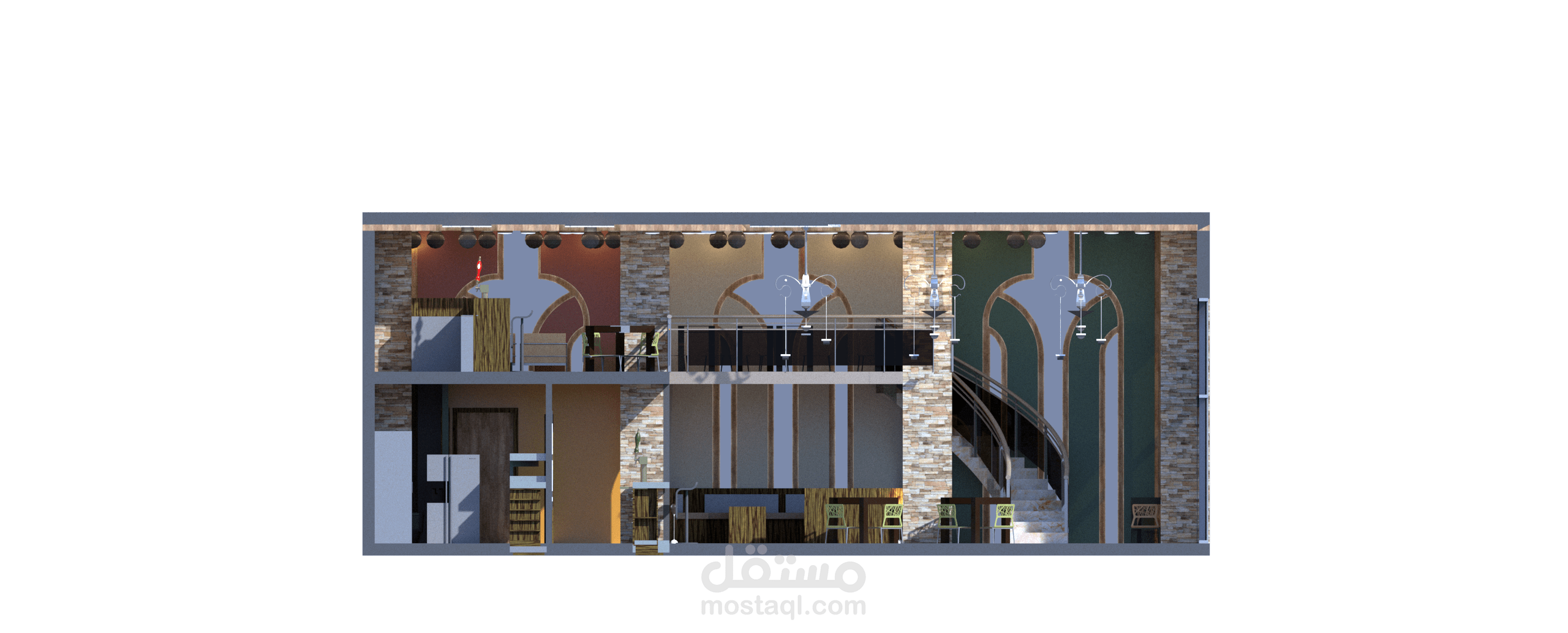 تصميم كفتريا بالوان هادئة واستخدام عمارة ال boho في التصميم من ناحية عناصر والوان الاكساء وشكل التصميم بشكل عام