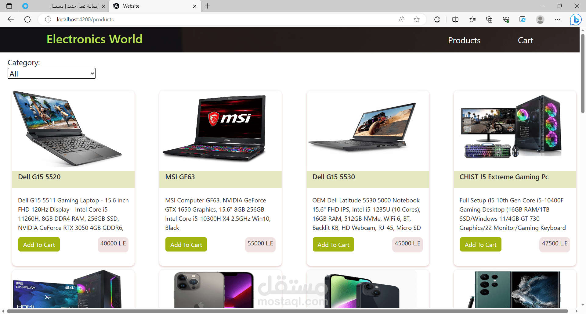 متجر الكترونى لبيع اجهزه الكترونيه واختيار الصنف و اضافة المنتج الى السله و عرض تفاصيل المنتج