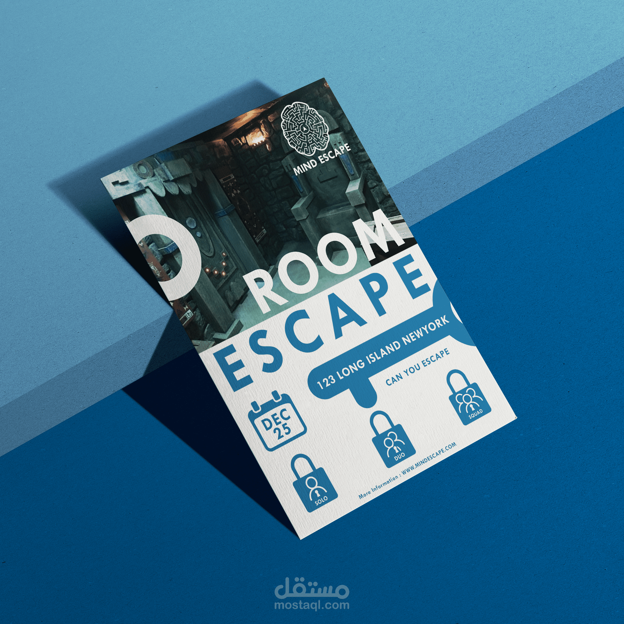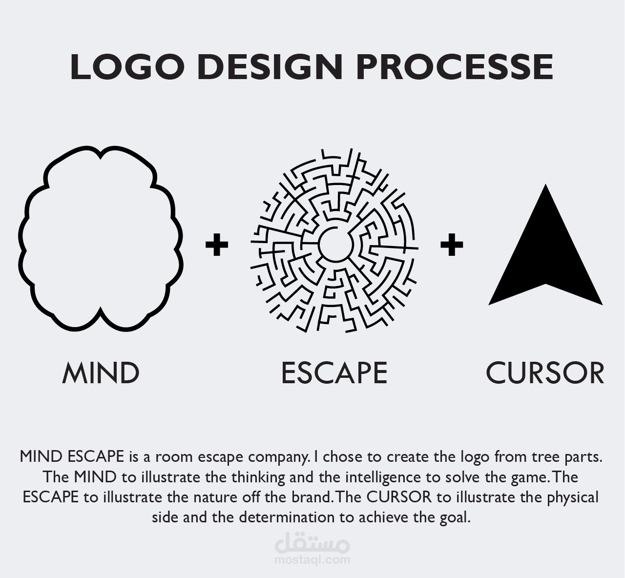 MIND ESCAPE هي شركة متخصصة في ألعاب الهروب من الغرفة من اختراعي. لقد قمت بإنشاء الشعار من ثلاثة أجزاء. العقل لتوضيح جانب التفكير و الذكاء لحل اللعبة. الهروب لتوضيح طبيعة العلامة التجارية. المؤشر لتوضيح الجانب الجسدي والعزم على تحقيق الهدف.