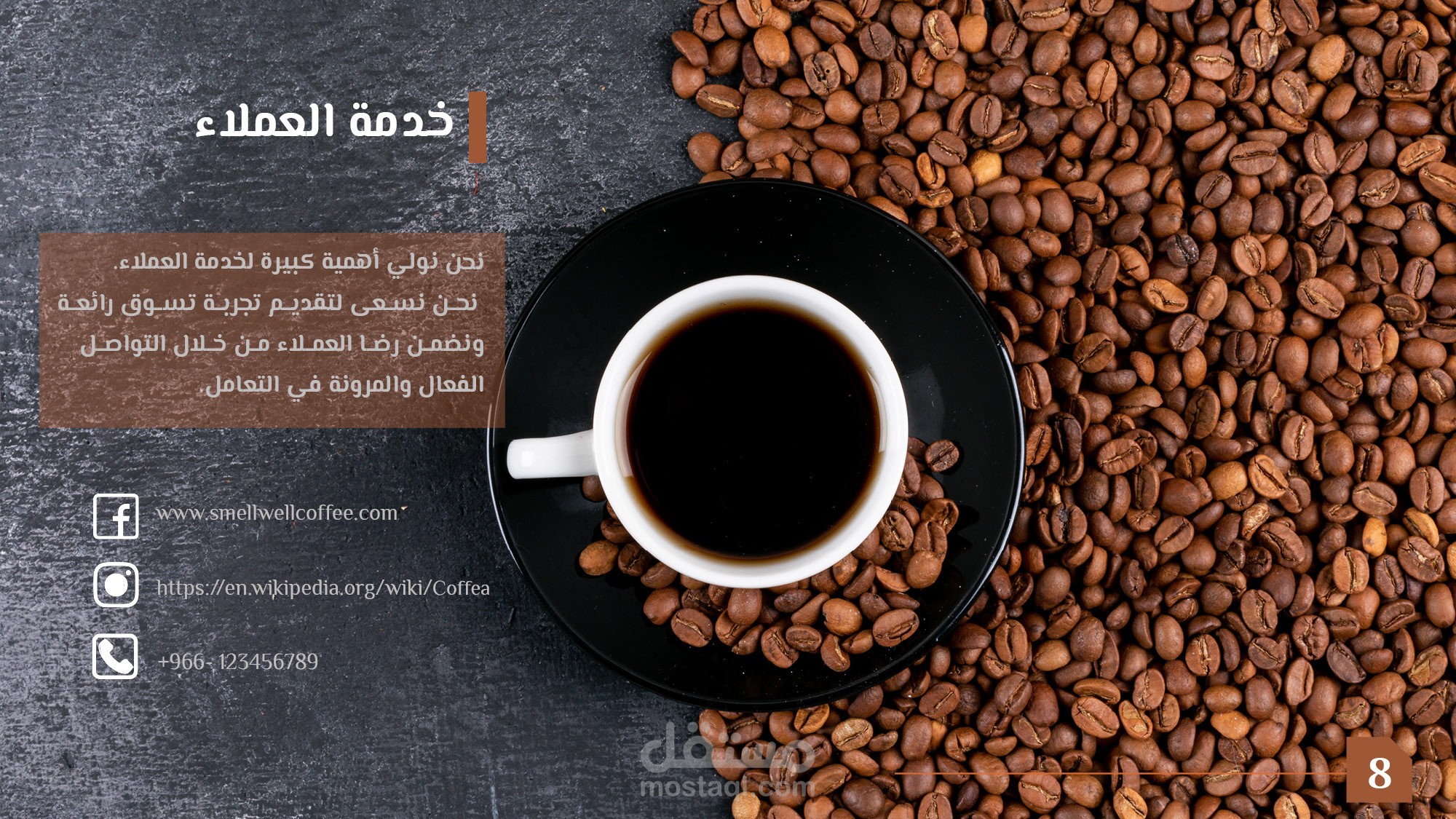 تصميم بروفايل شركة Smell Well للقهوة بروفايل إلكتروني بطريقة مميزة والوان مناسبة وتنسيق الفقرات وإدراج التنسيق المناسب لكل البروفايل وعمل فهرس إلكتروني ووجود إرنباطات