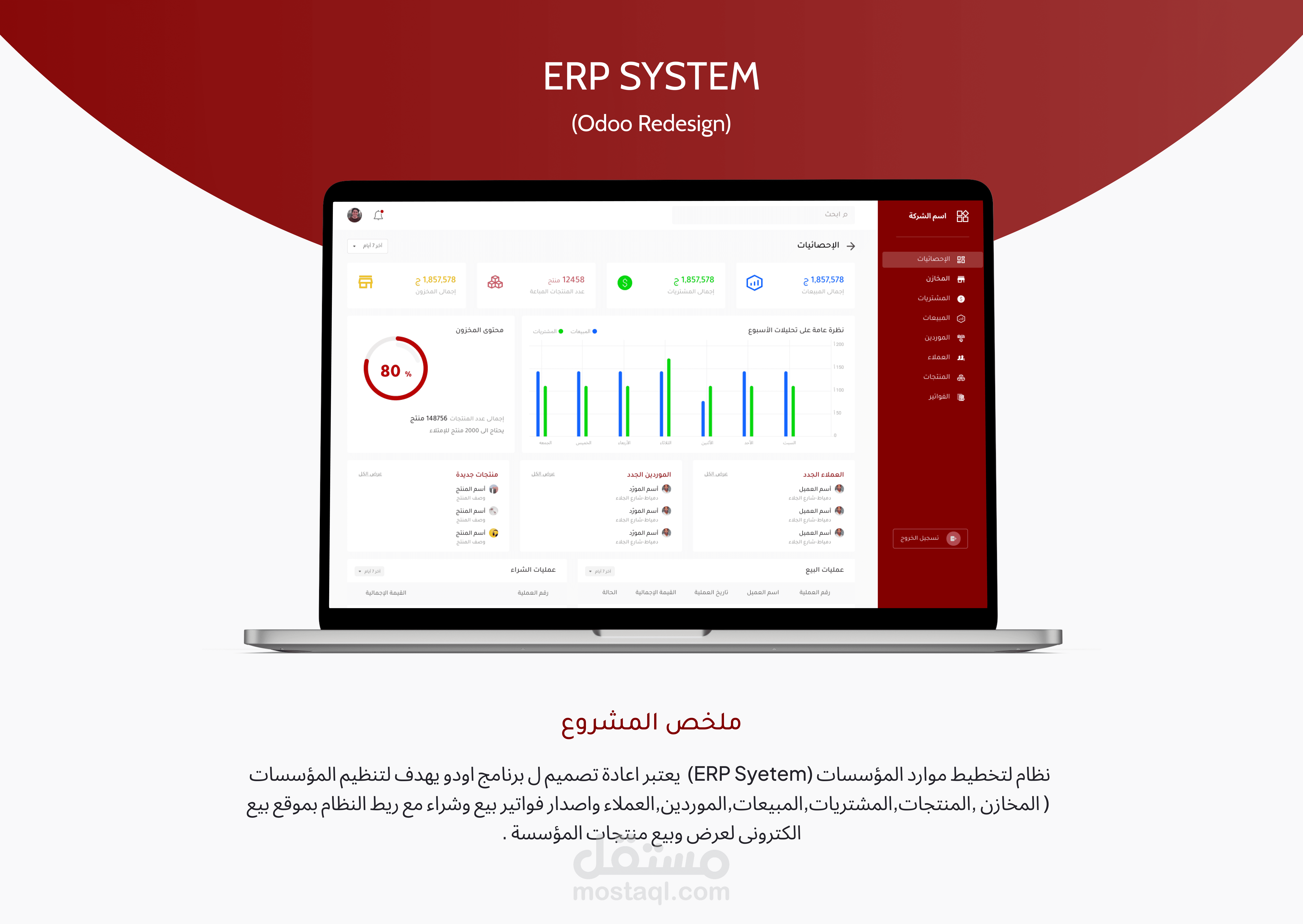 Enterprise Resource Planning System (ERP Syetem) is a redesign of the Odoo program that aims to organize institutions (warehouses, products, purchases, sales, suppliers, customers) and issue purchase and sale invoices with .inking the system to an electronic selling site to display and sell the organization's products