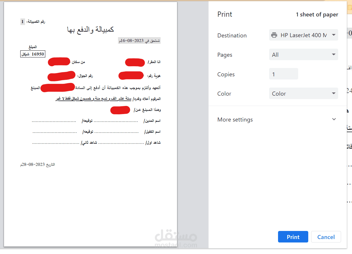 طباعة الملفات وتوقيعها من قبل المدين والكفيل والشاهد وغيره حسب الطلب