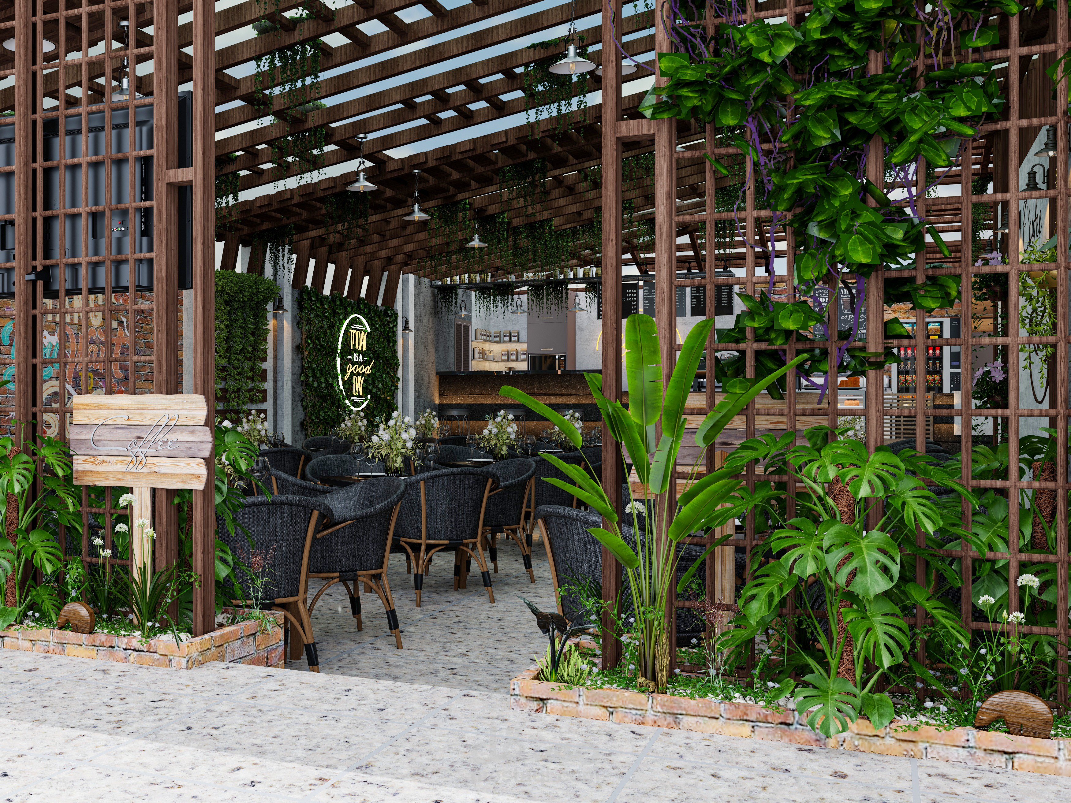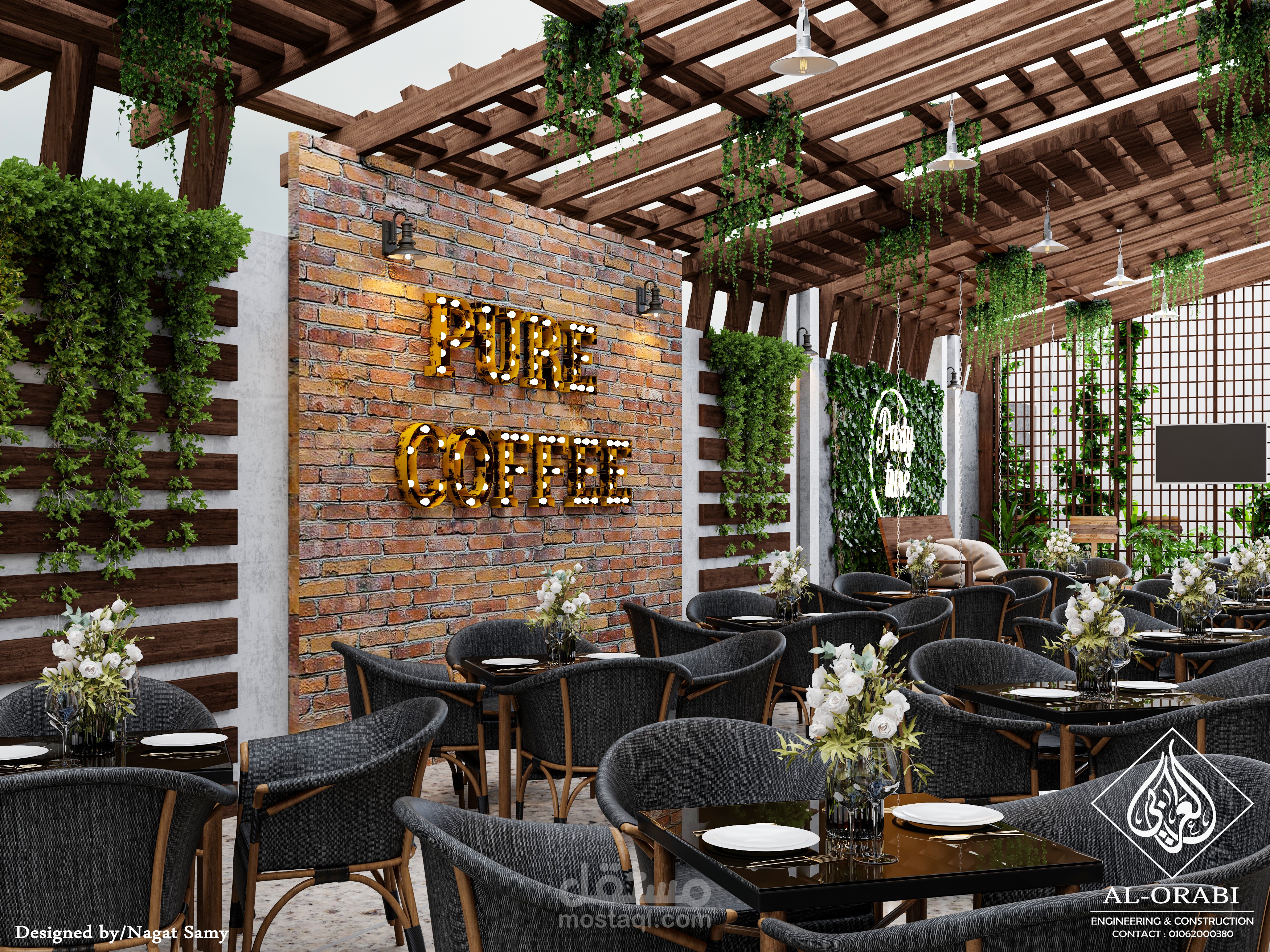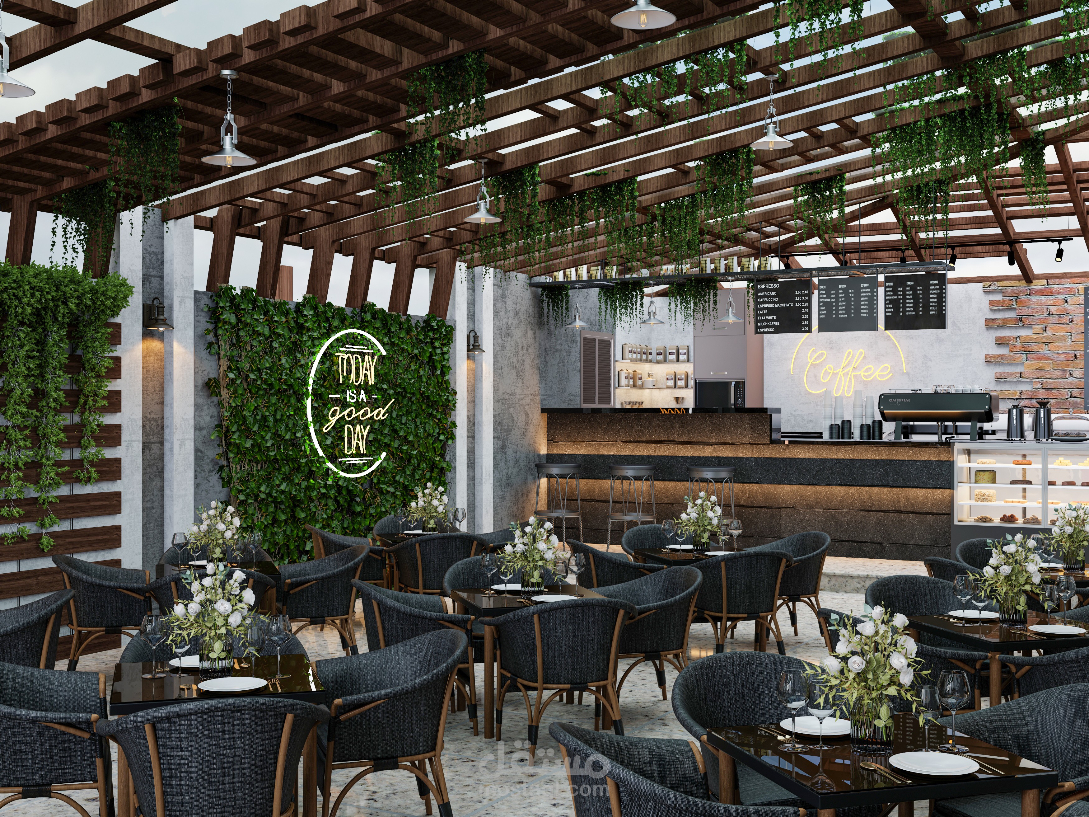 تصميم كافية باستخدام خامات بسيطه ومحببه للطبيعه والوان عصرية توحى بالراحه والهدوء