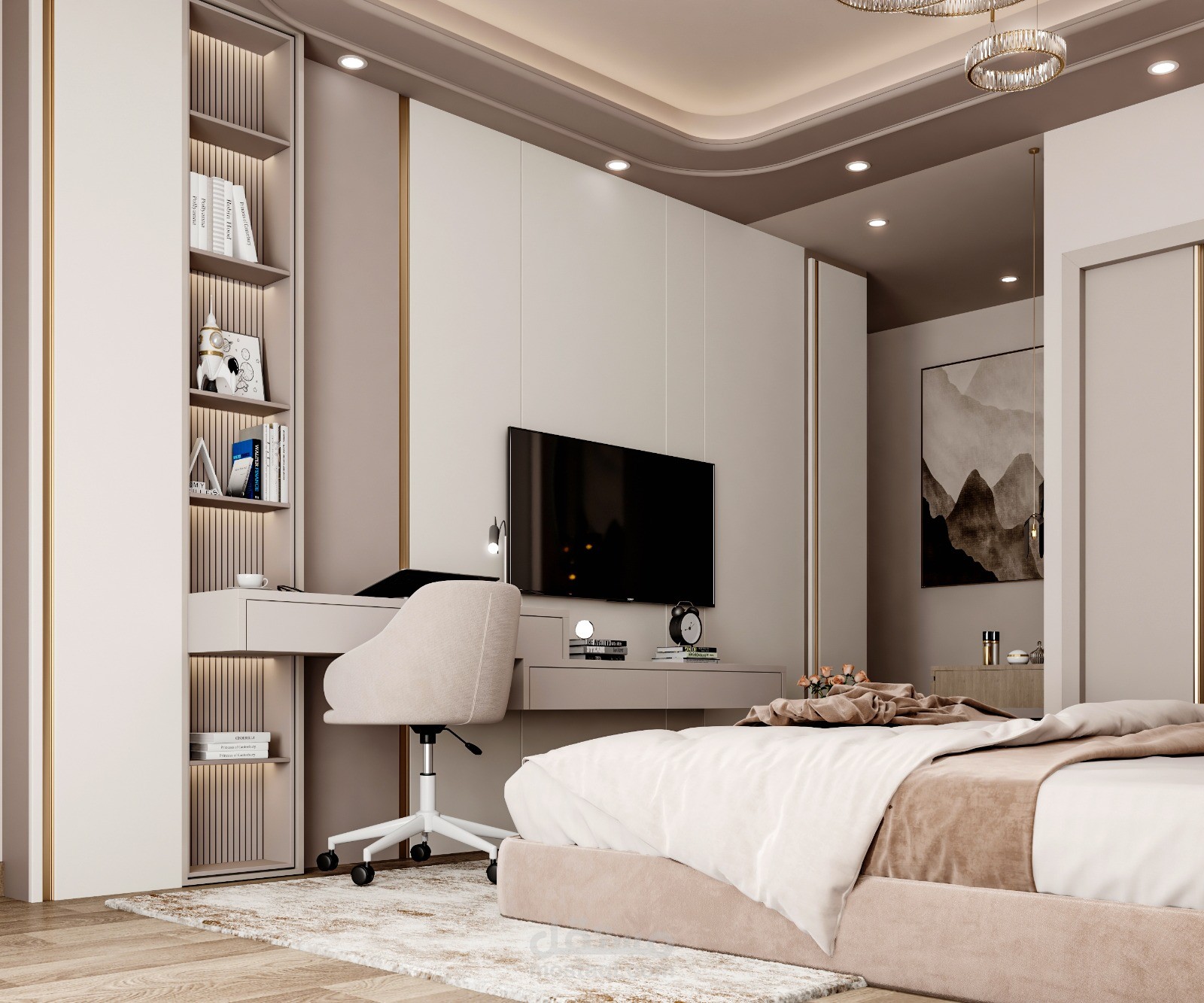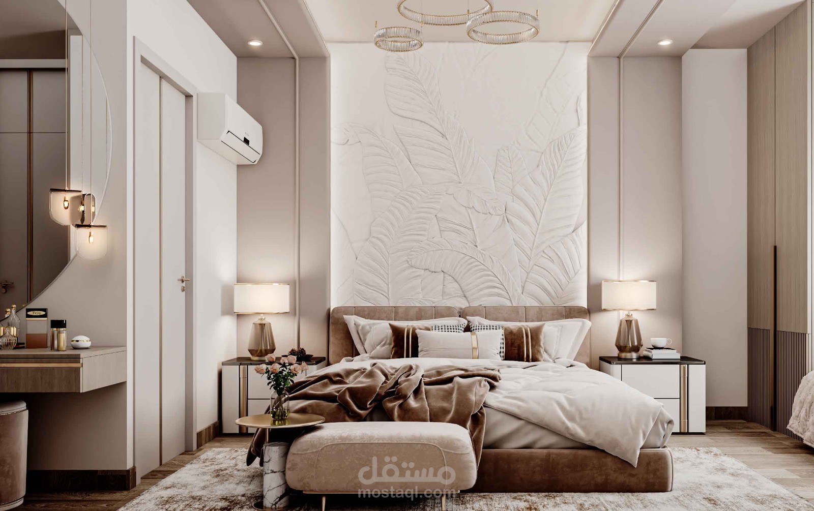 تصميم غرفة نوم رئيسية بالوان جذابة توحى بالبهجه واعطت نعومه للمكان وراحة