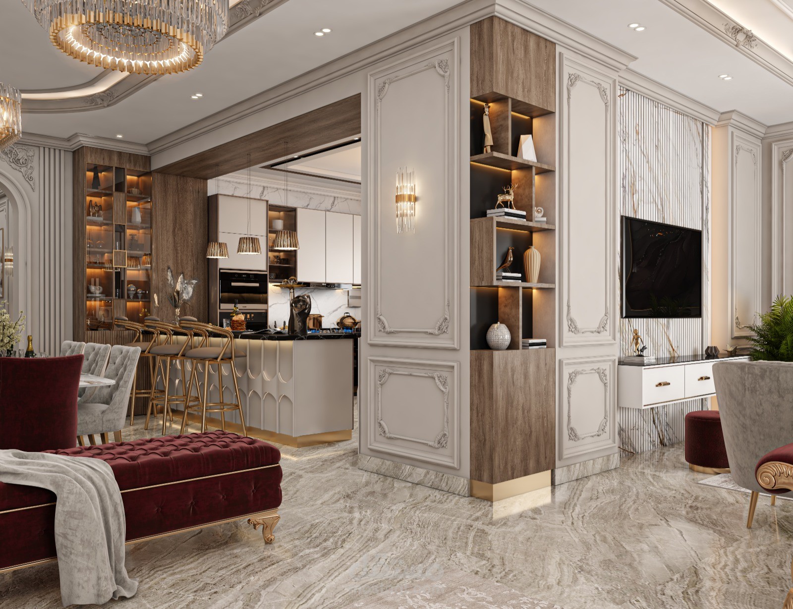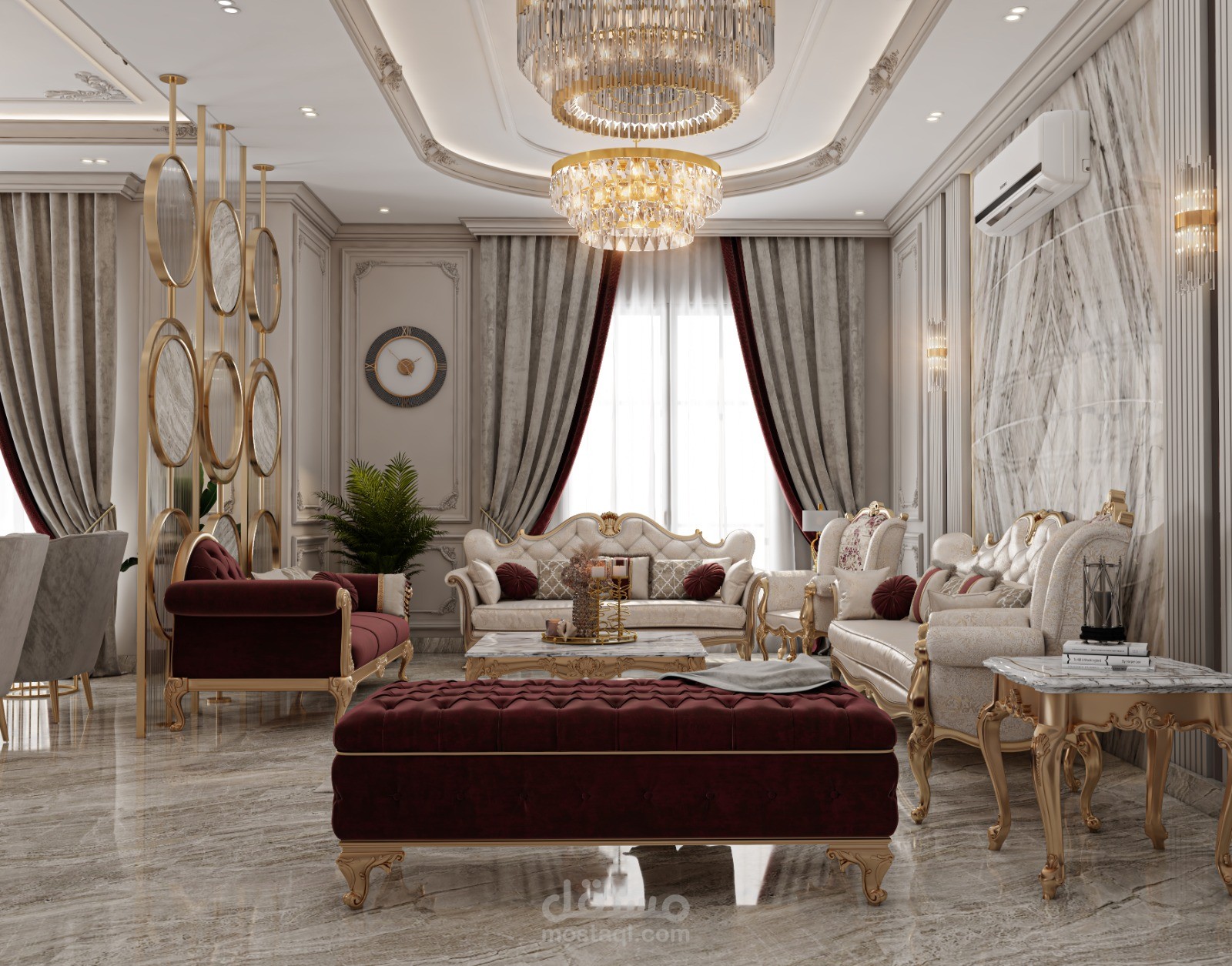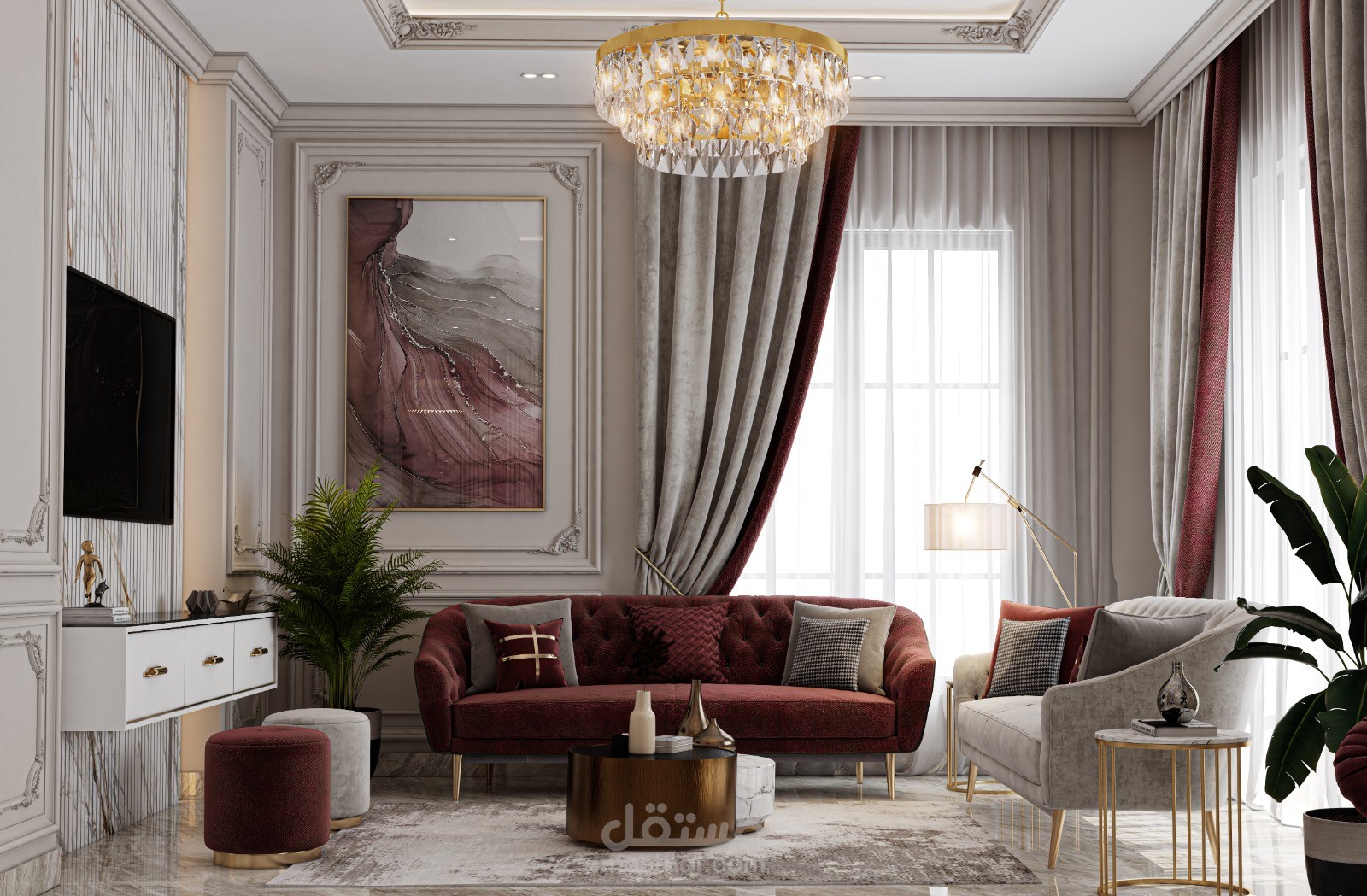 تصميم استقبال نيوكلاسيك فخم باثاث يوحى بالرقى والوان هادئة