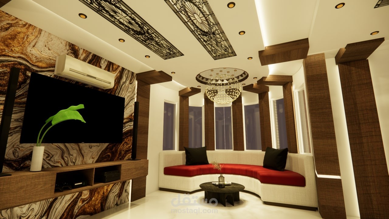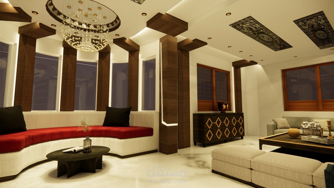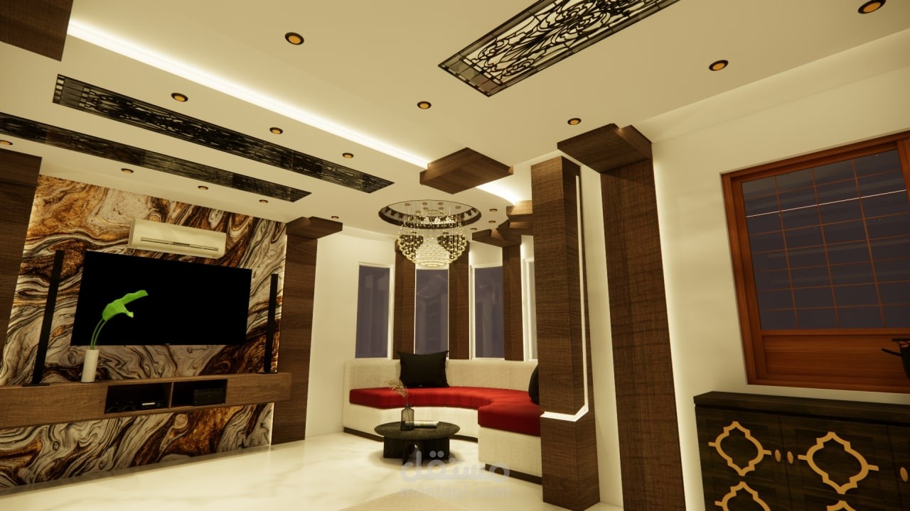 تصميم ثلاثي الأبعاد (3D): تصميم غرفة جلوس بنمط حديث باستخدام تقنيات ثلاثية الأبعاد لإعطاء رؤية واقعية لتفاصيل المشروع.
