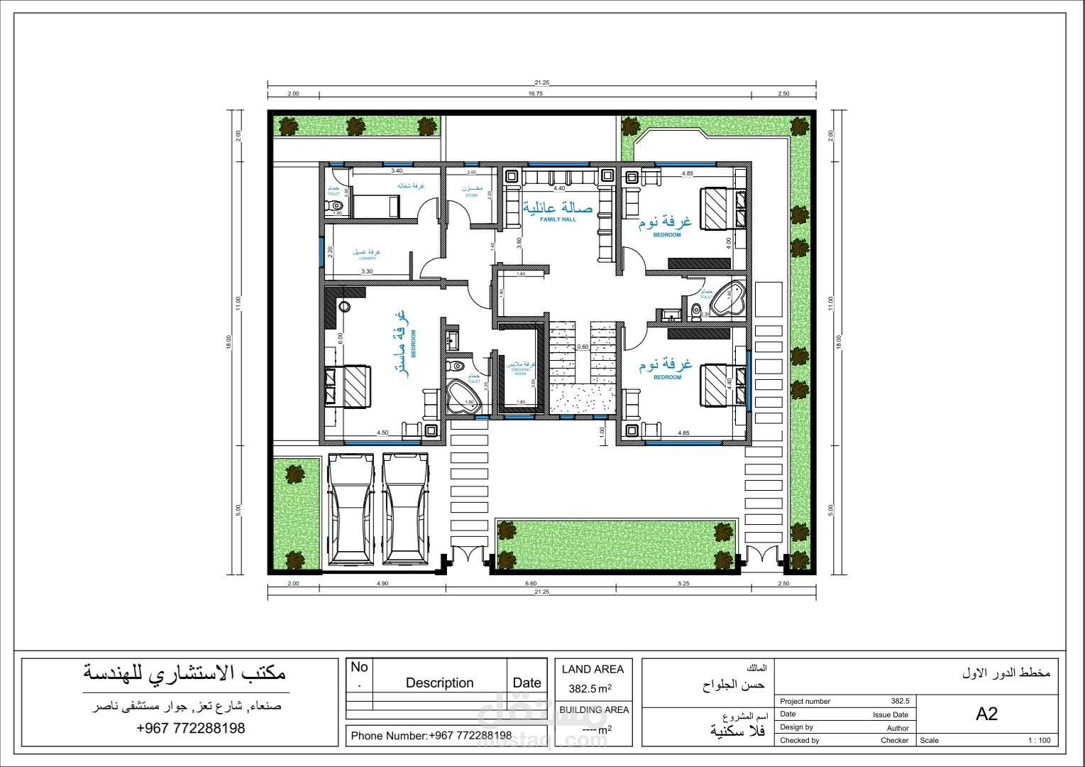 تصميم فلا في مساحة ارض 382 في المملكة السعودية الاحساء وفق الكود السعودي مع تحقيق متطلبات المالك بعمل صالة مطله على حديقة من الشرق والغرب