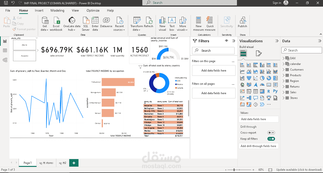 لوحة تحكم تحكي عن تفاصيل عمليات البيع و الربح الكلي لي كل سنة مالية ,تم حسب فيها معدل الدخل السنوي لكل متجر ,بالاضافة الي حساب مجموع المبيعات الكلي ,ثم قمت بحساب معدل دخل كل وظيفة و معرفة أكثر وظيفة ساهمت في عملية تحسين الربح لدي الشركة و ثم اخيرا معرفة أكثر دولة ساهمة في معدل الربح الكلي .