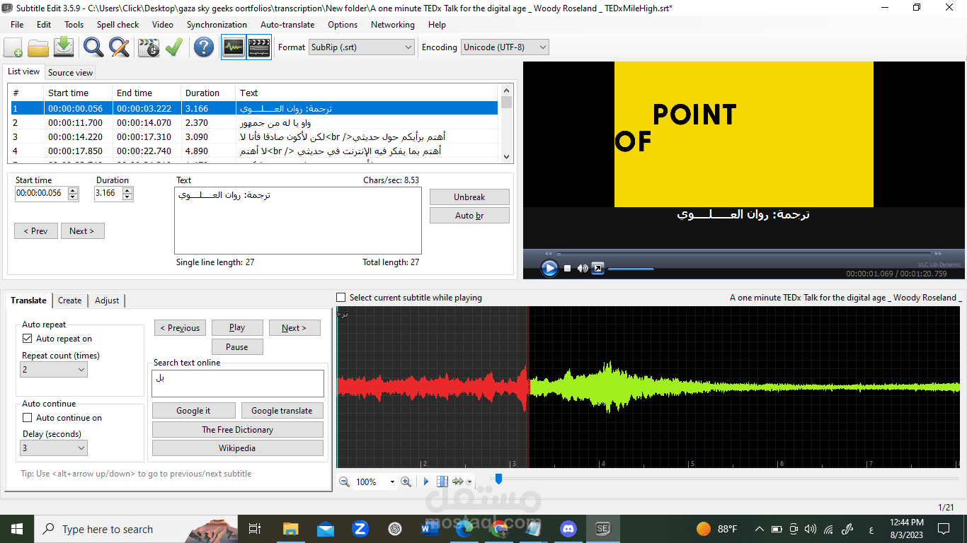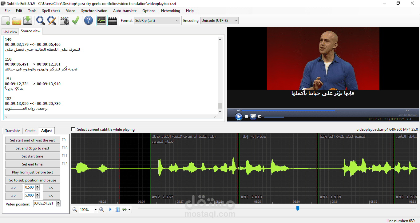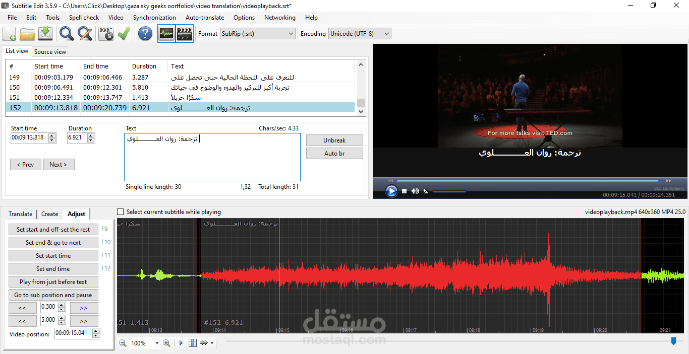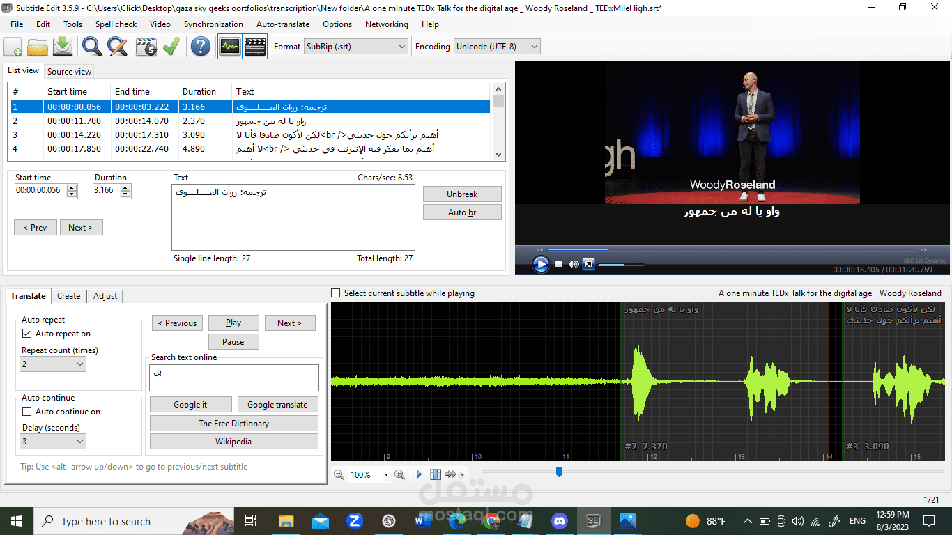 4- اضفت الترجمة على برنامج subtitle edit لتدقيق الثواني لتفادي أي خلل في الترجمة المرئية