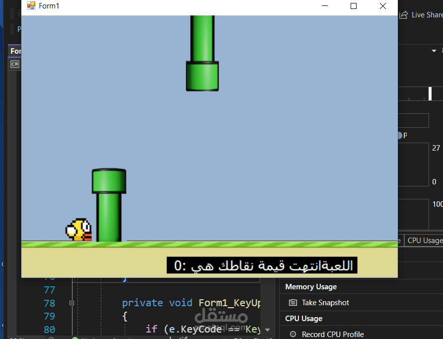 لعبة عن شخصية تقوم بتحريكها لاعلى و اسفل لتفادي التصادم و يحسب لك نقاط و ان اصطدمت بالحواجز فسوف تنتهي اللعبة