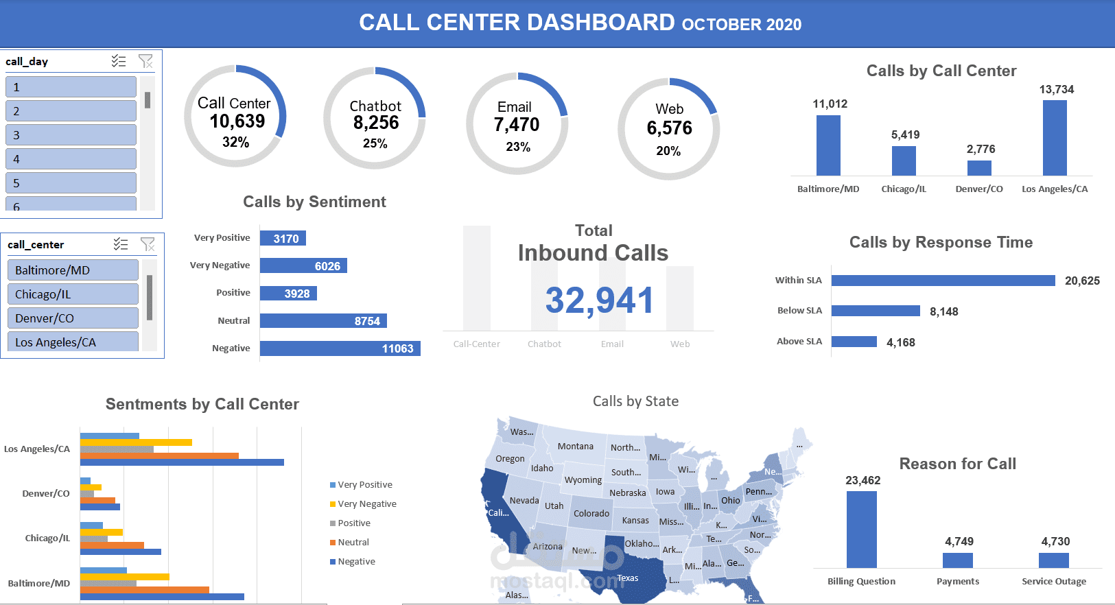 This is a call center dashboard created with data from October 2020. It has over 30,000 rows of data.