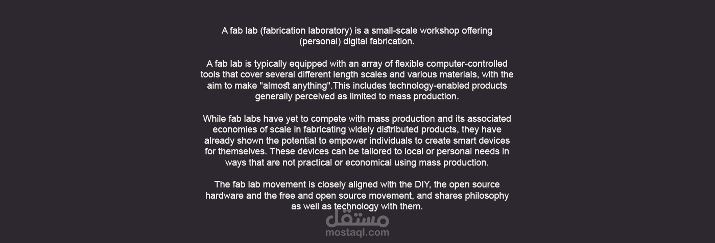 A fab lab (fabrication laboratory) is a small-scale workshop offering (personal) digital fabrication. A fab lab is typically equipped with an array of flexible computer-controlled tools that cover several different length scales and various materials, with the aim to make "almost anything". This includes technology-enabled products generally perceived as limited to mass production. While fab labs have yet to compete with mass production and its associated economies of scale in fabricating widely distributed products, they have already shown the potential to empower individuals to create smart devices for themselves. These devices can be tailored to local or personal needs in ways that are not practical or economical using mass production. The fab lab movement is closely aligned with the DIY, the open source hardware and the free and open source movement, and shares philosophy as well as technology with them.