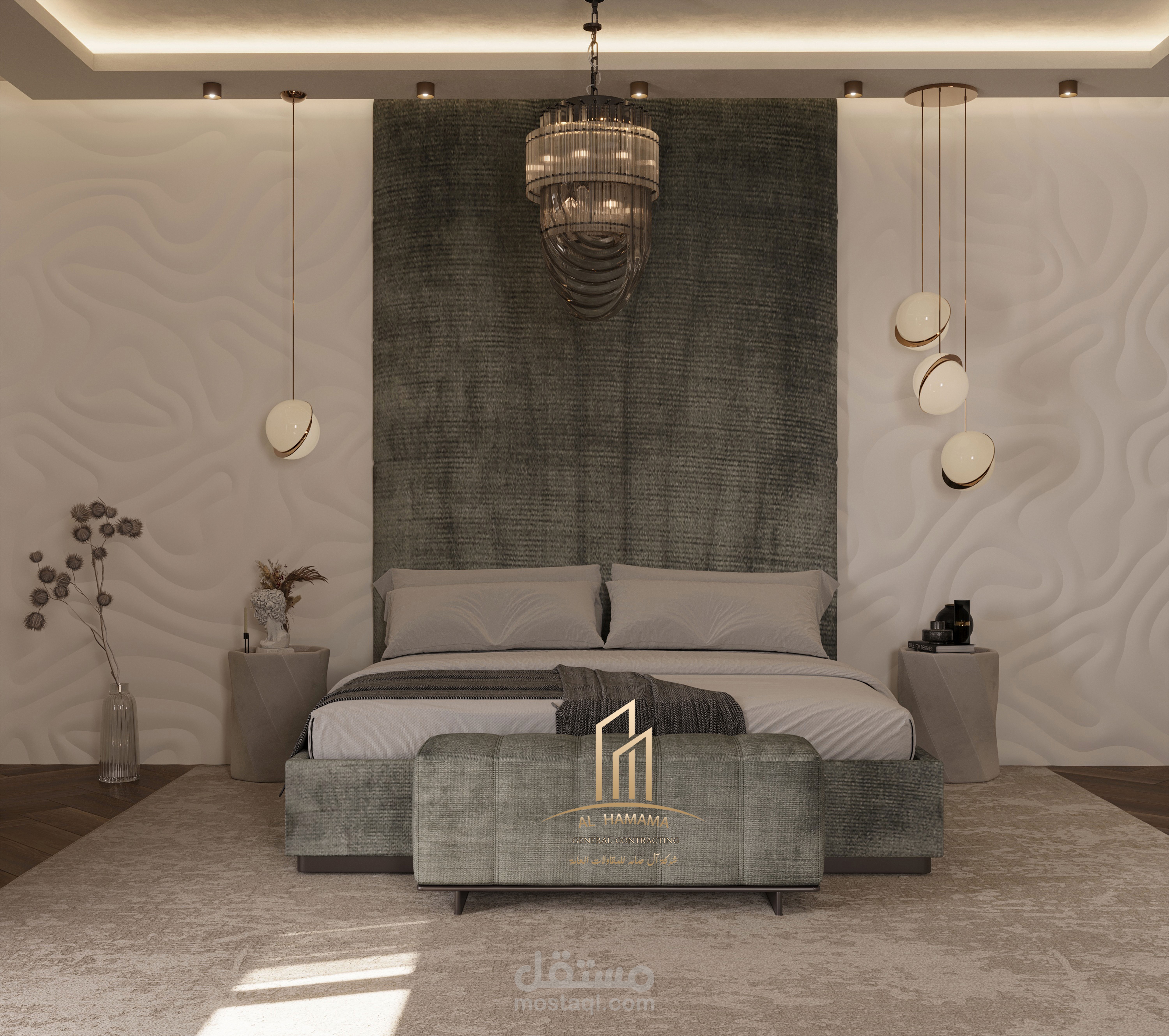 تصميم غرفة نوم رئيسية مع غرفة ملابس وحمام