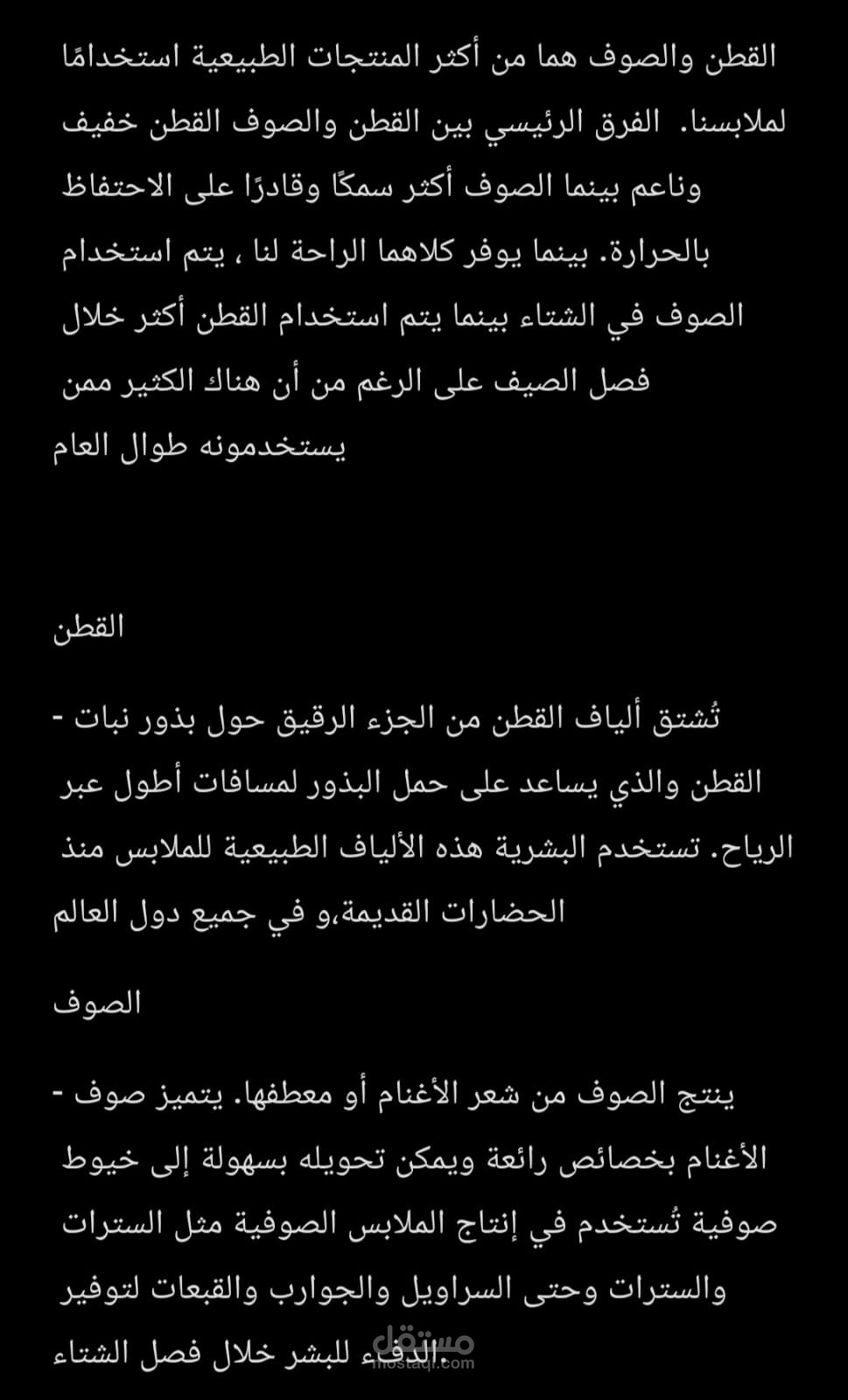 -ينتج الصوف من شعر الأغنام أو معطفها. يتميز صوف الأغنام بخصائص رائعة ويمكن تحويله بسهولة إلى خيوط صوفية تُستخدم في إنتاج الملابس الصوفية مثل السترات والسترات وحتى السراويل والجوارب والقبعات لتوفير الدفء للبشر خلال فصل الشتاء.