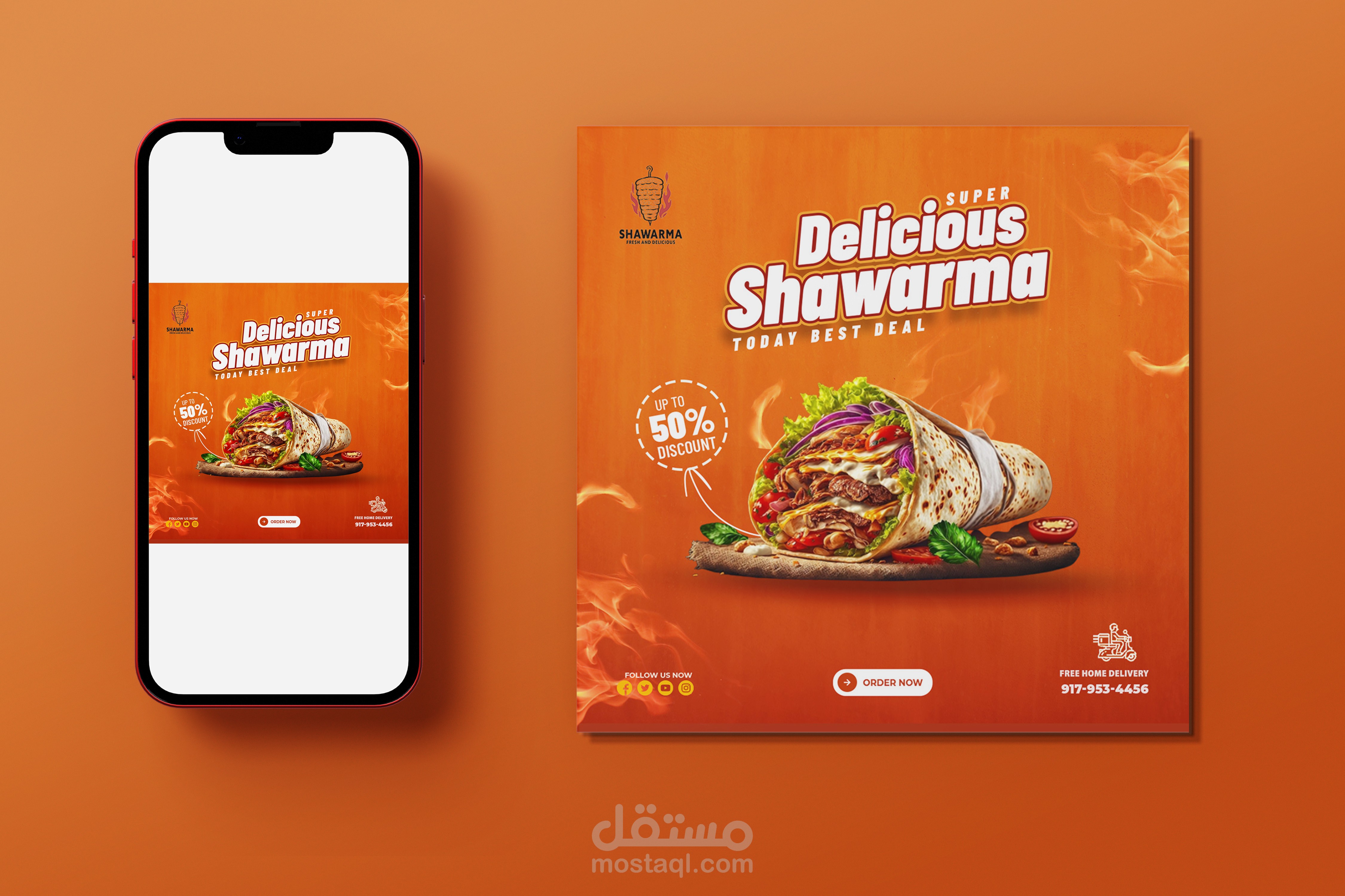 تم تصميم وتنفيذ منشورات فيس بوك وانستقرام جذابة لصالح مطعم شاورما ، تعكس هذه المنشورات العلامة التجارية وتعزز الدعاية الاعلانية لمنتجاته.