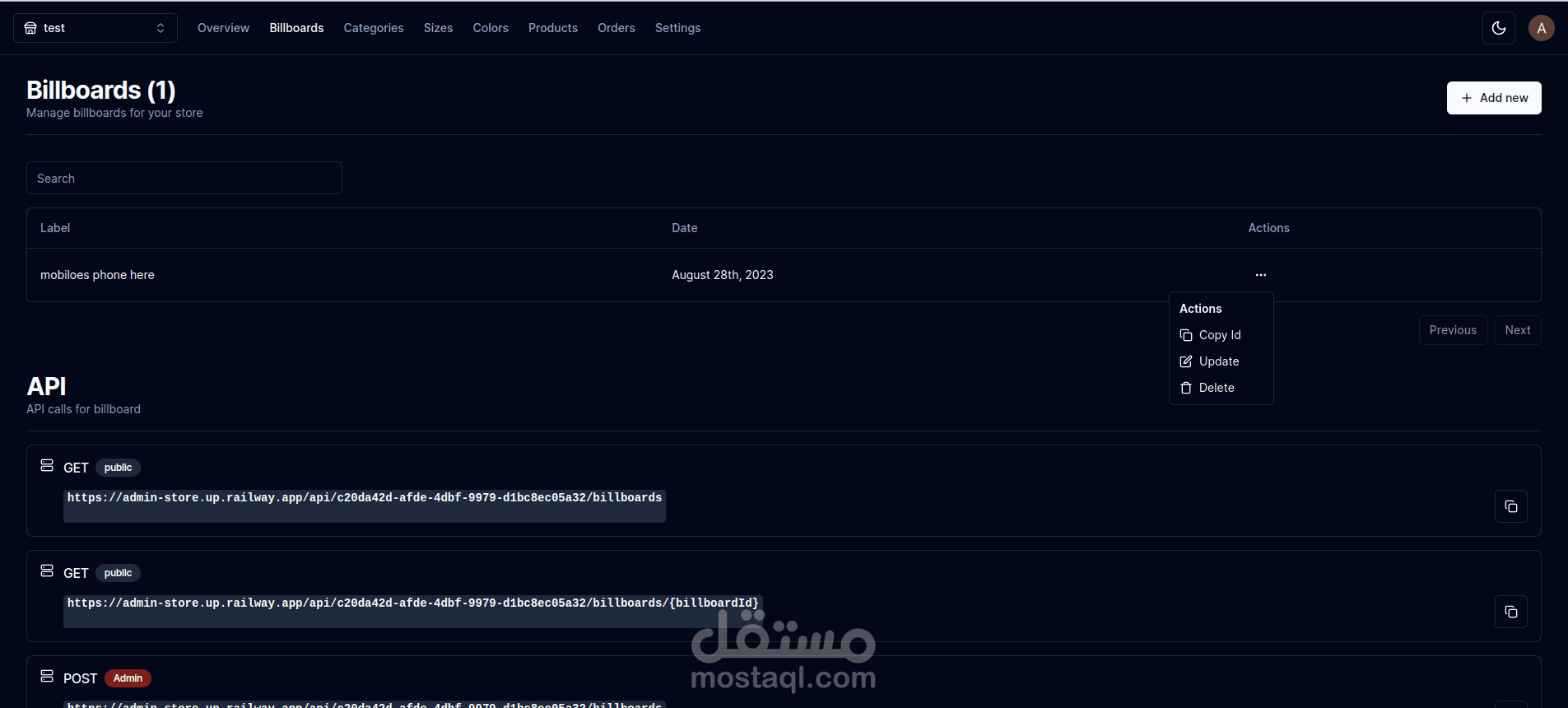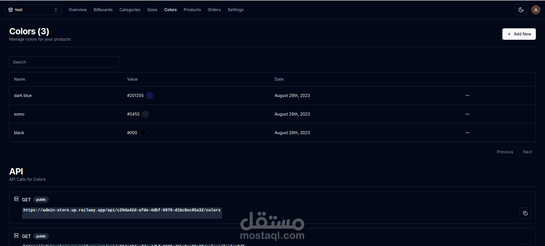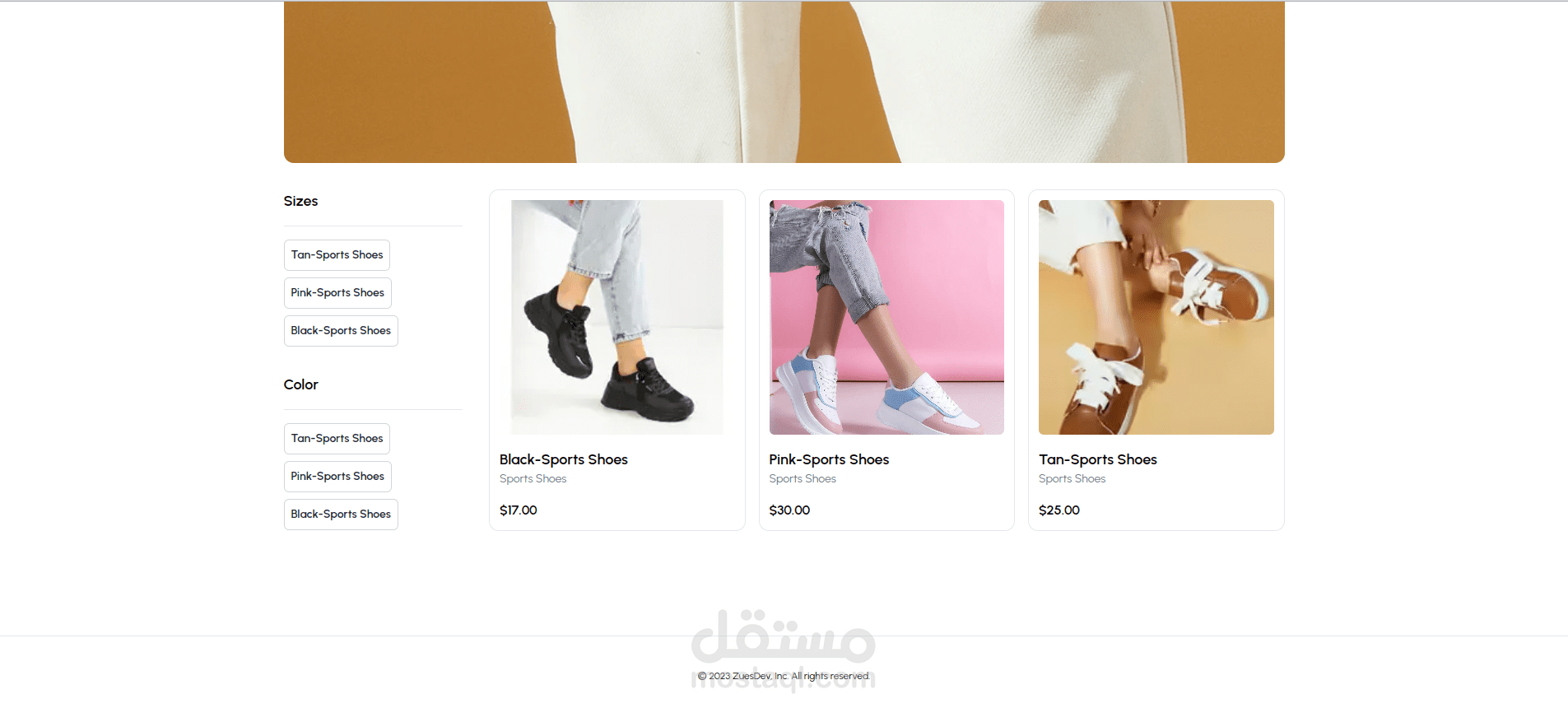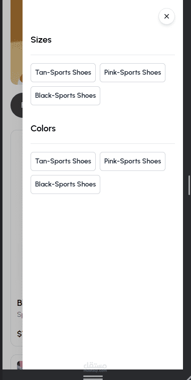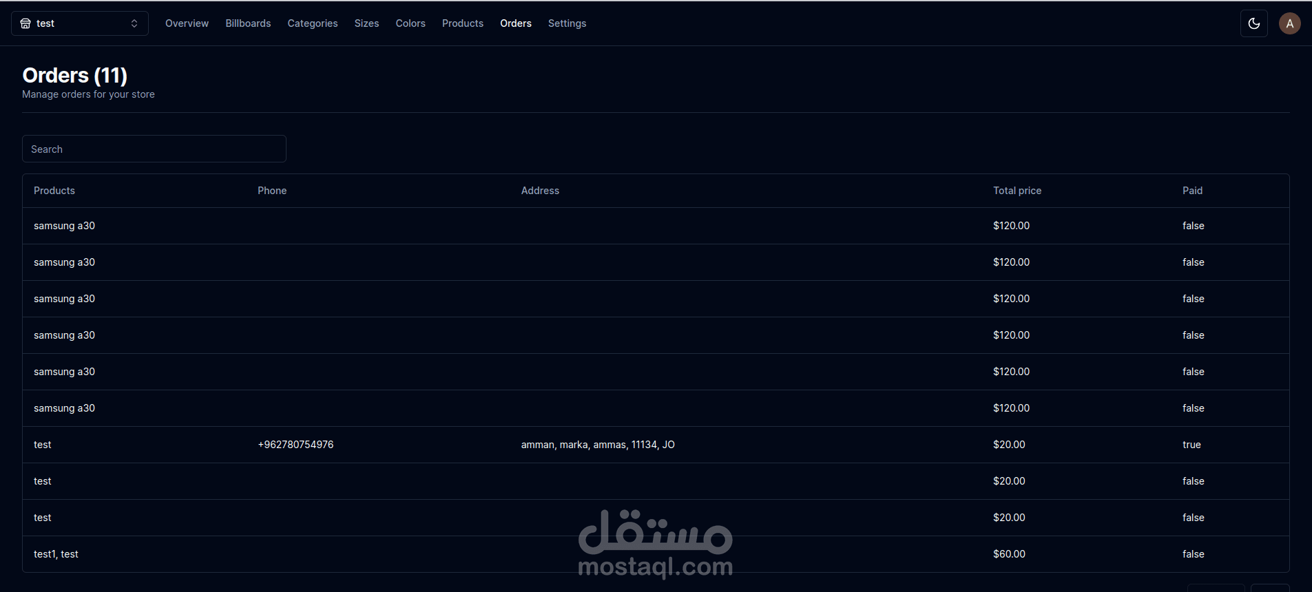 يحتوي الجدول على عناصر المنتج والفئة ولوحة الإعلانات والألوان والحجم