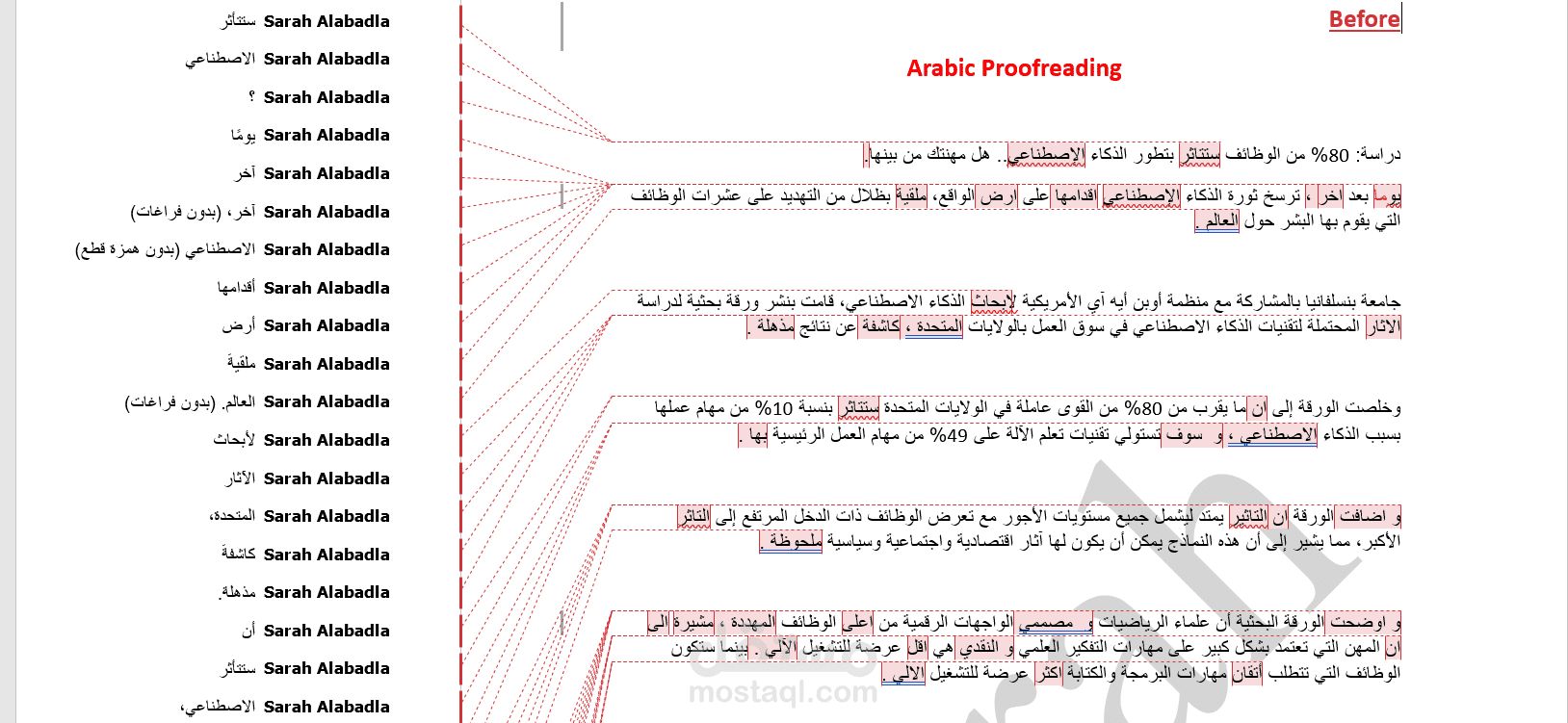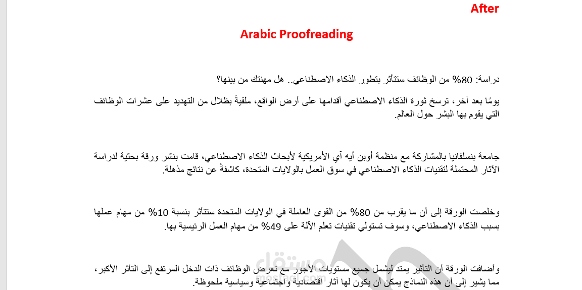 1-تصحيح الأخطاء الإملائية: فحص النص للعثور على الأخطاء الإملائية مثل الهجاء الخاطئ وتعديل علامات الترقيم وتصحيحها.