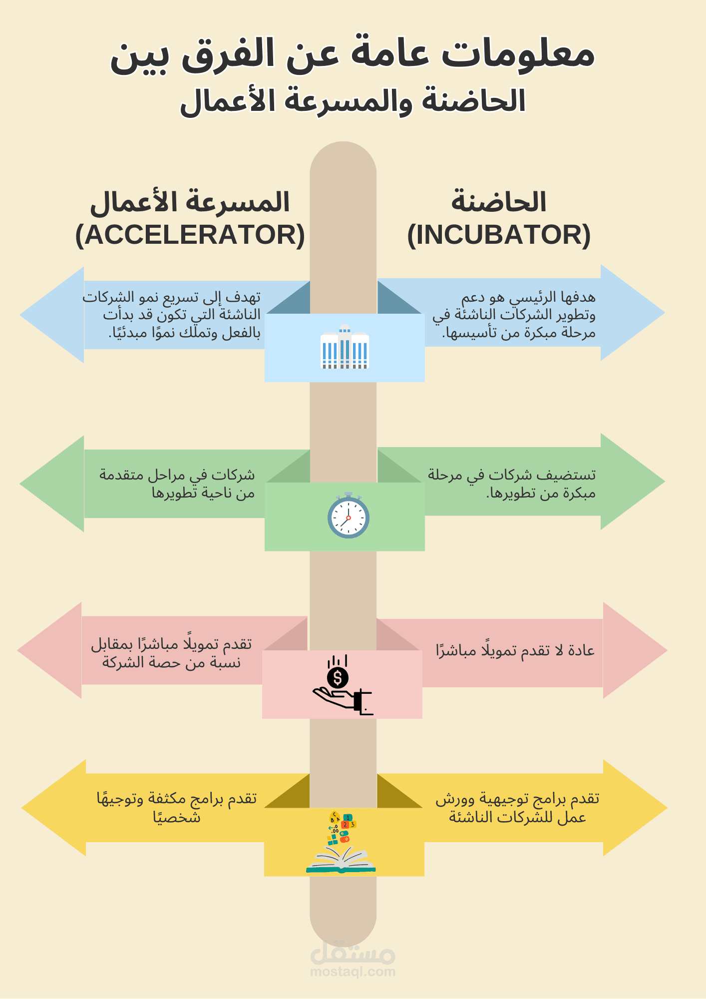 انفوجراف عن معلومات عامة عن الفرق بين الحاضنة والمسرعة الأعمال