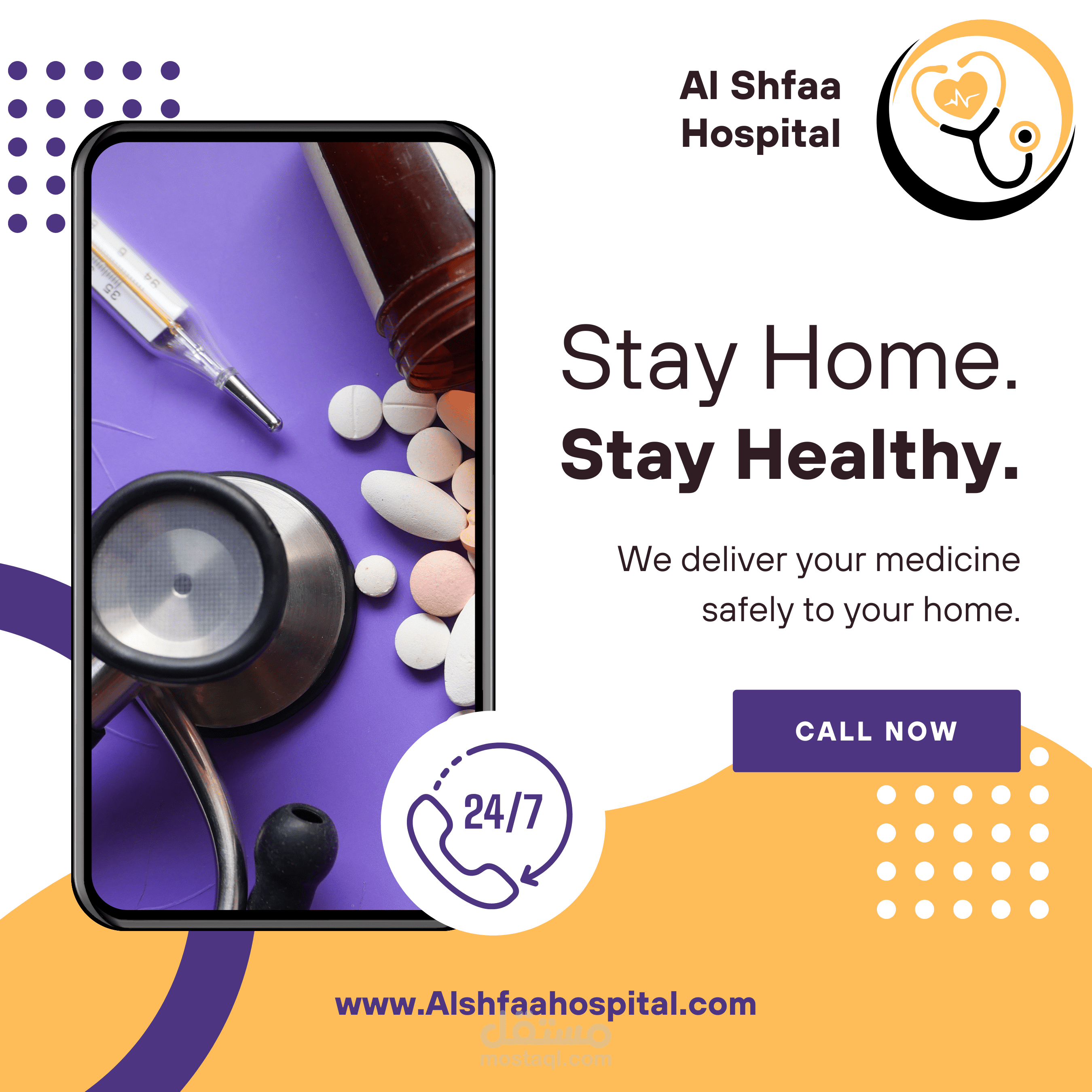منشور اعلاني عبر وسائل التواصل الاجتماعي لمستشفي للتسويق عن خدمة توصيل الادوية و طلب دكتور دون الذهاب الي المستشفي اثناء انتشار فيروس كورونا
