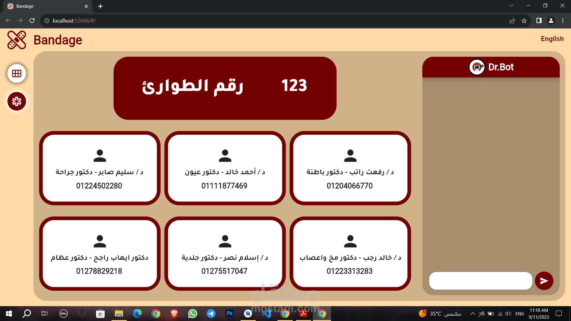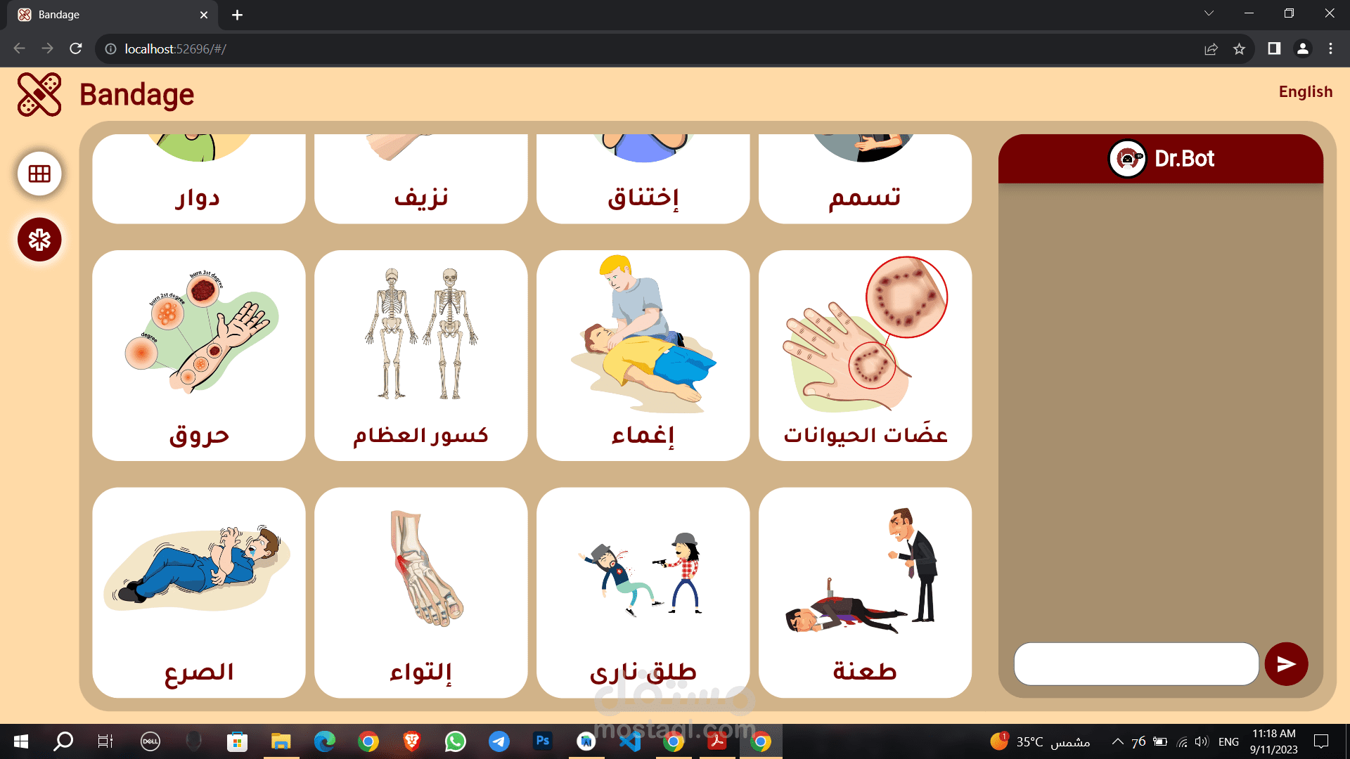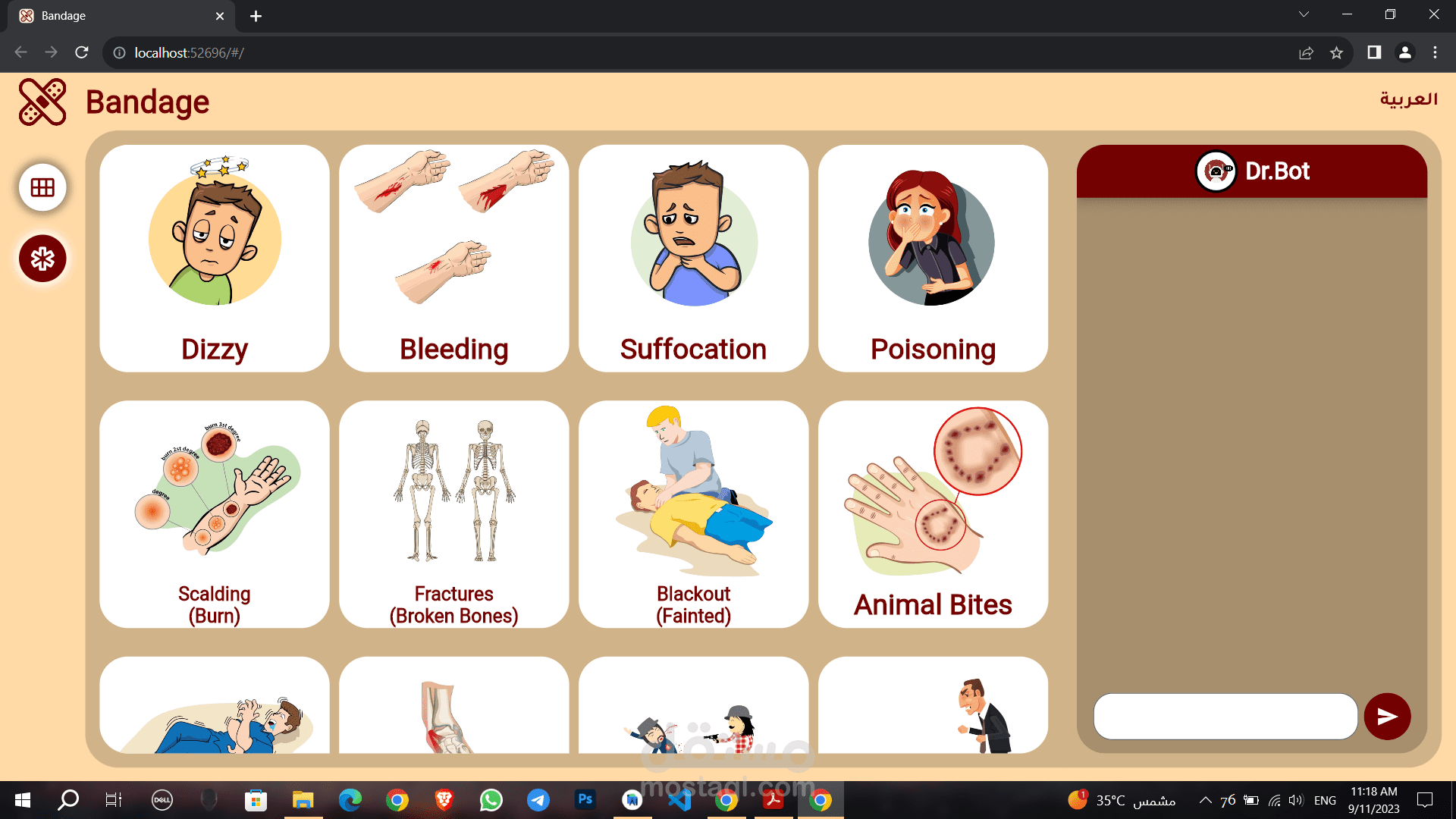 An application for first aid called "Bandage" that assists non-specialists in providing proper and correct help to others. The features of the application include artificial intelligence chat, location detection to find nearby hospitals or facilities, and contact information for specialized doctors in various fields, available in both English and Arabic languages. It does not rely on the internet to open it