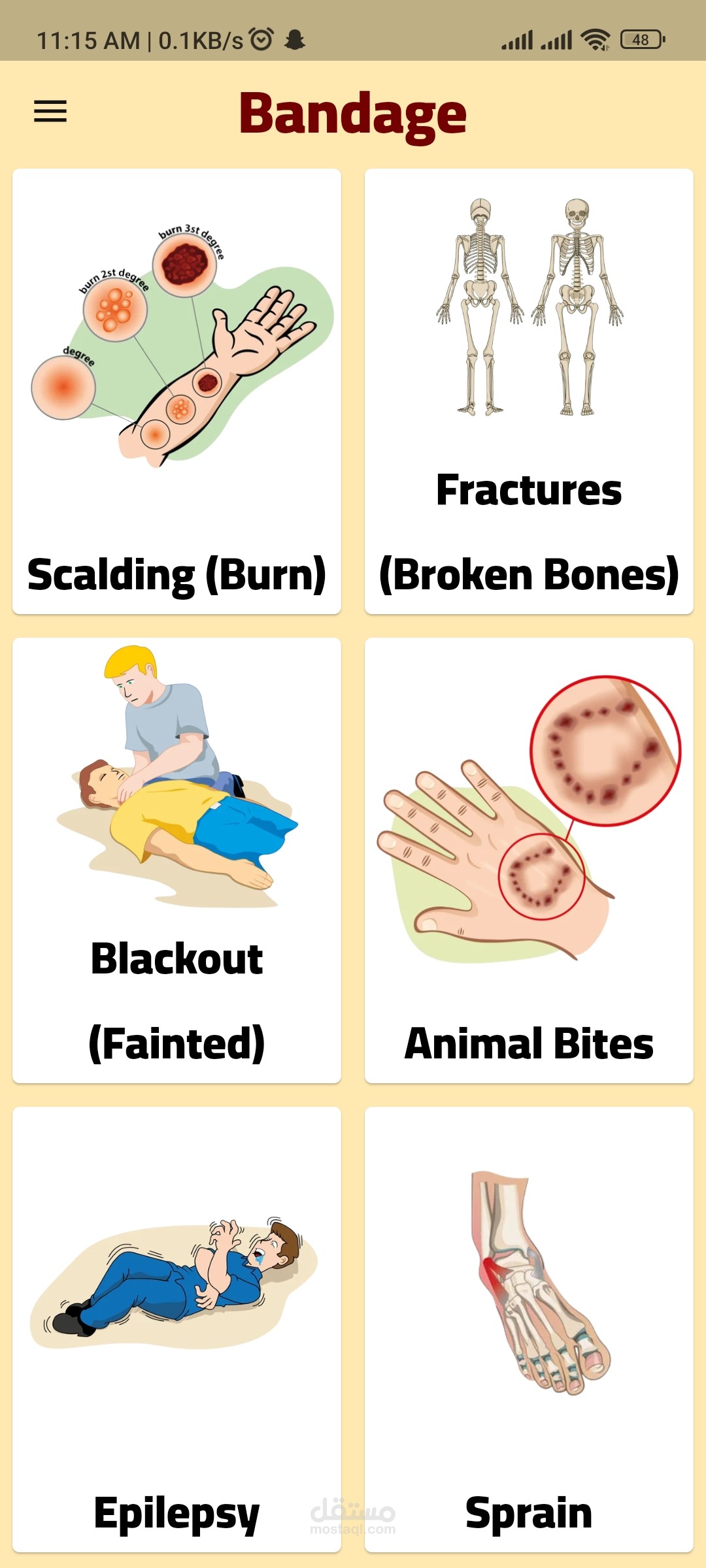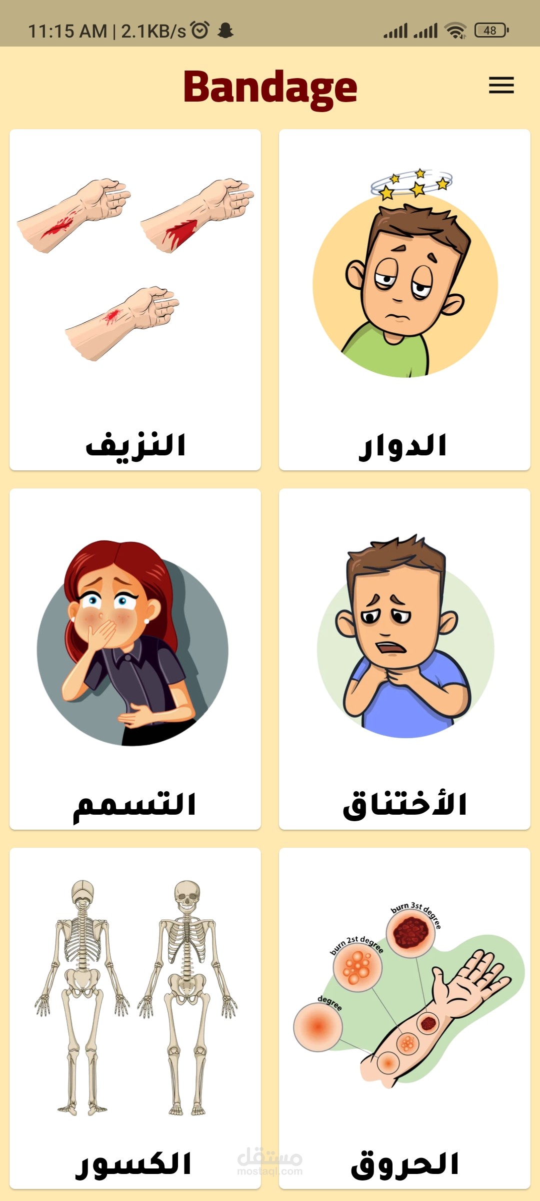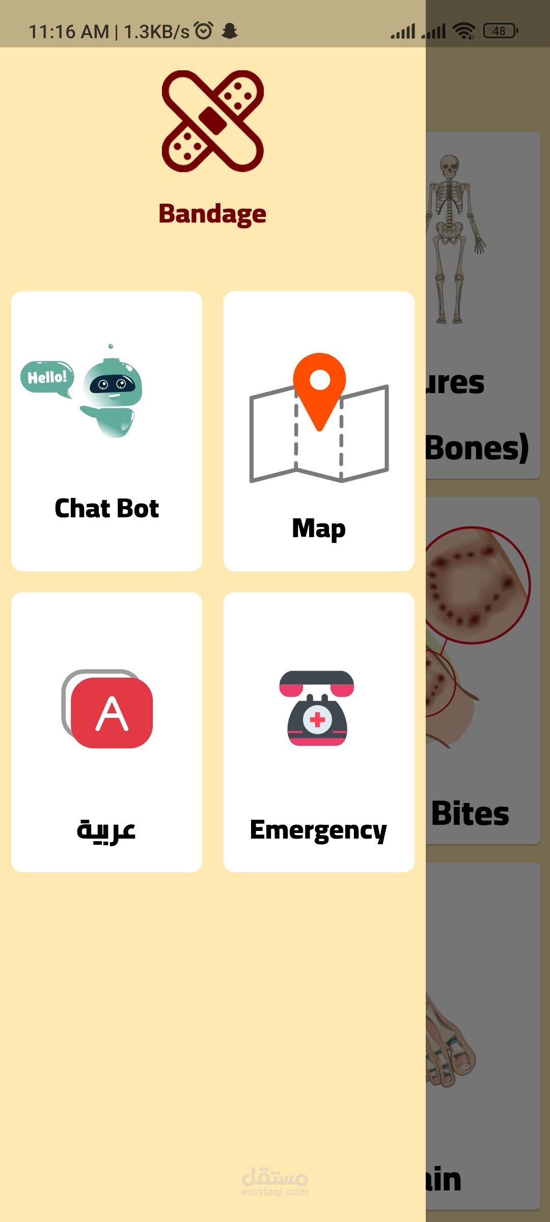 An application for first aid called "Bandage" that assists non-specialists in providing proper and correct help to others. The features of the application include artificial intelligence chat, location detection to find nearby hospitals or facilities, and contact information for specialized doctors in various fields, available in both English and Arabic languages. It does not rely on the internet to open it