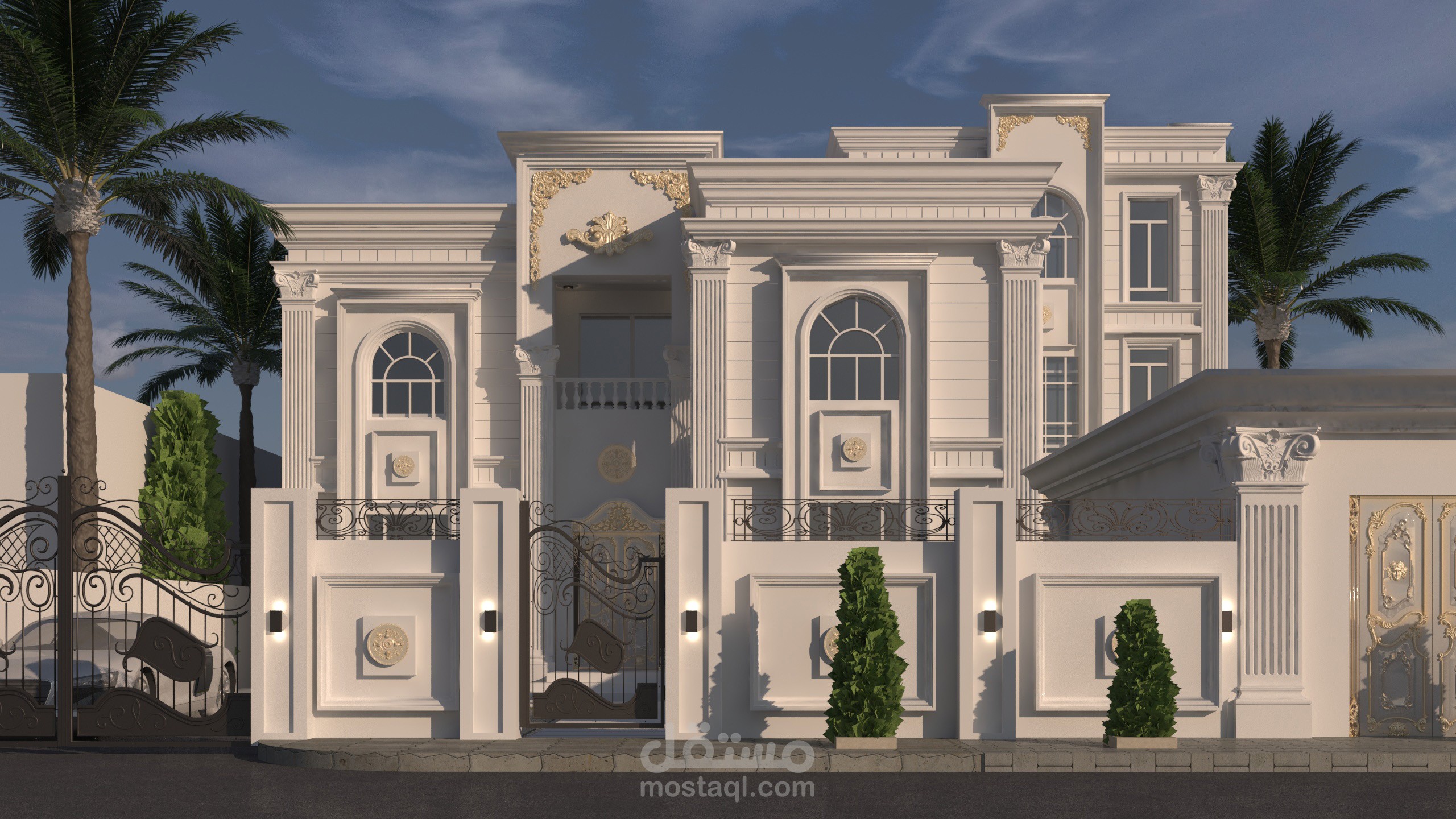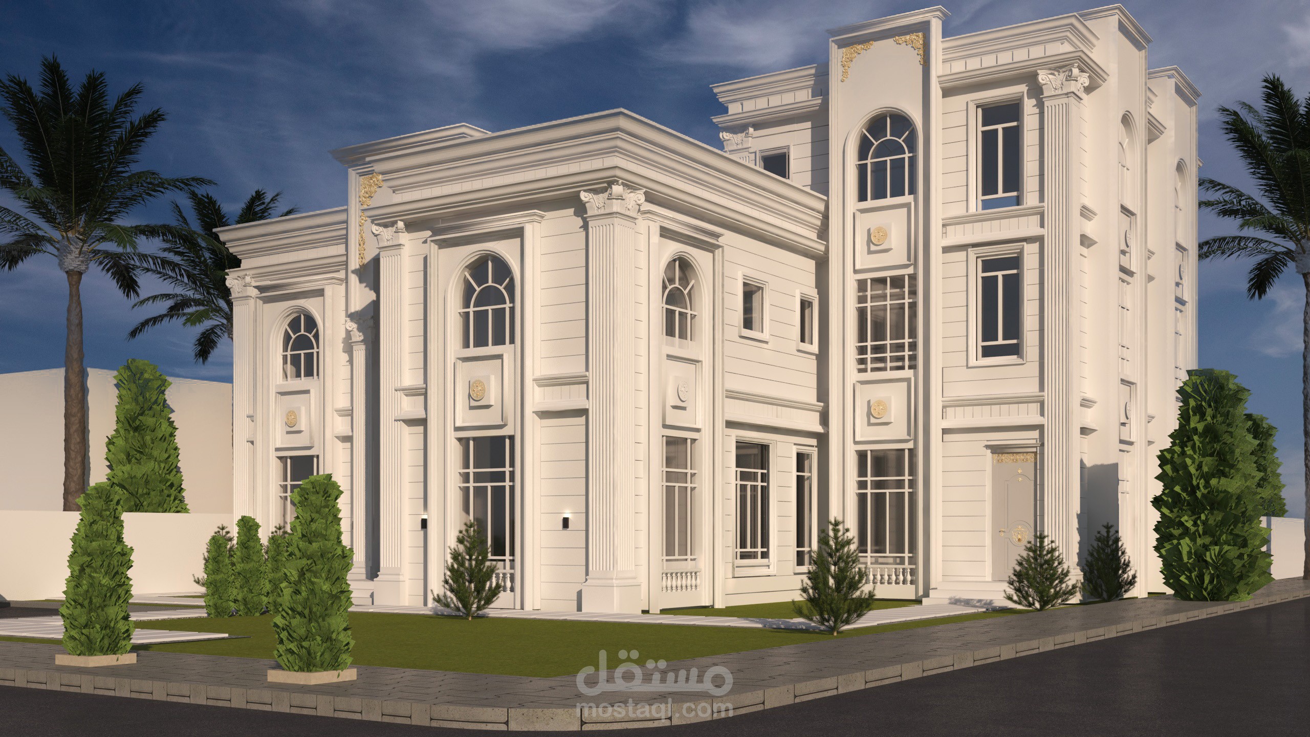 فيلا كلاسيكية في السعودية تم تصميم المساقط على ارض فارغة و تصميم واجهاتها الاربعة