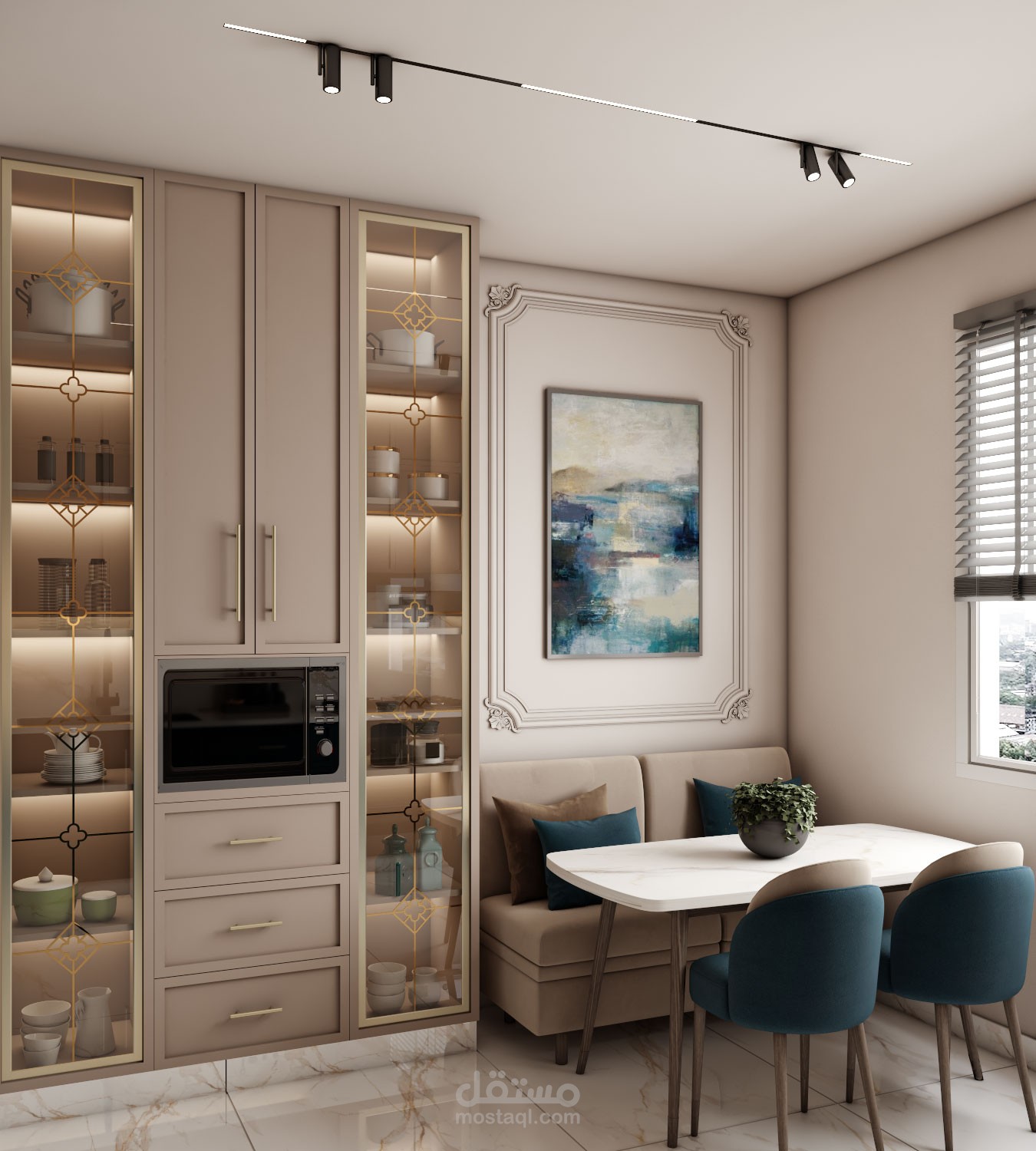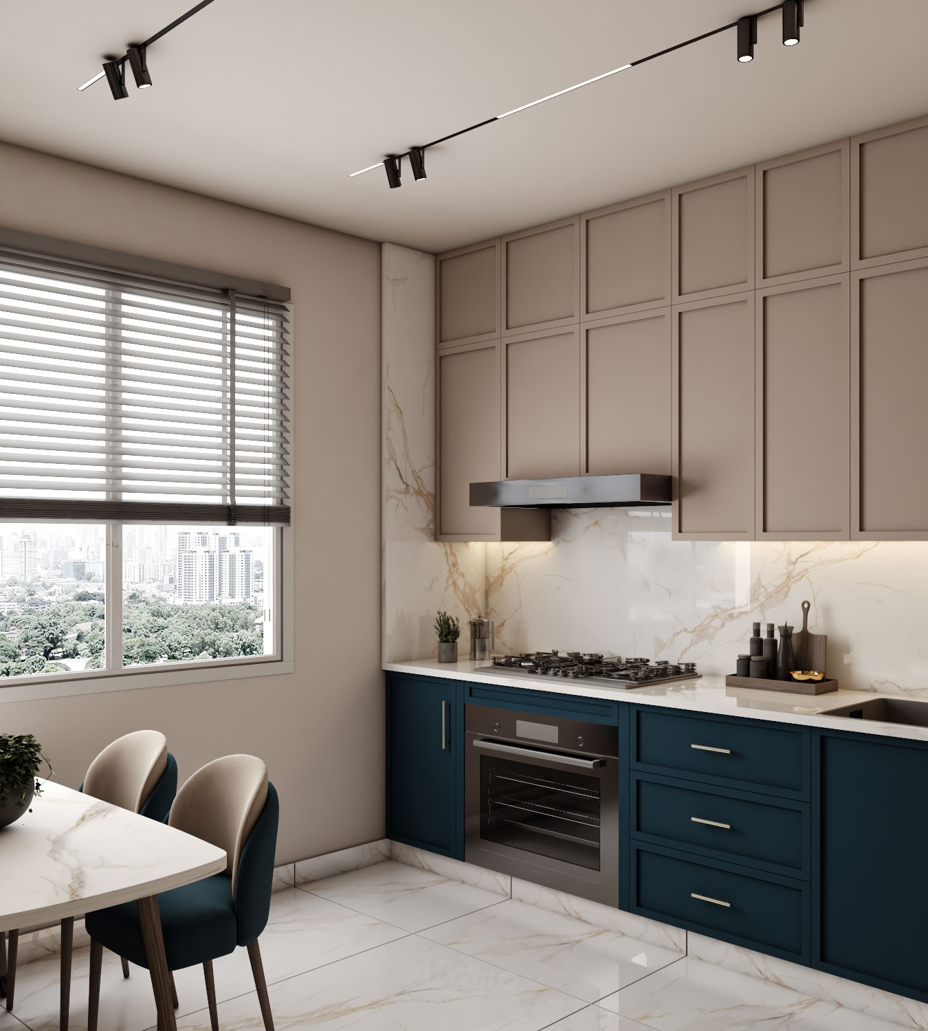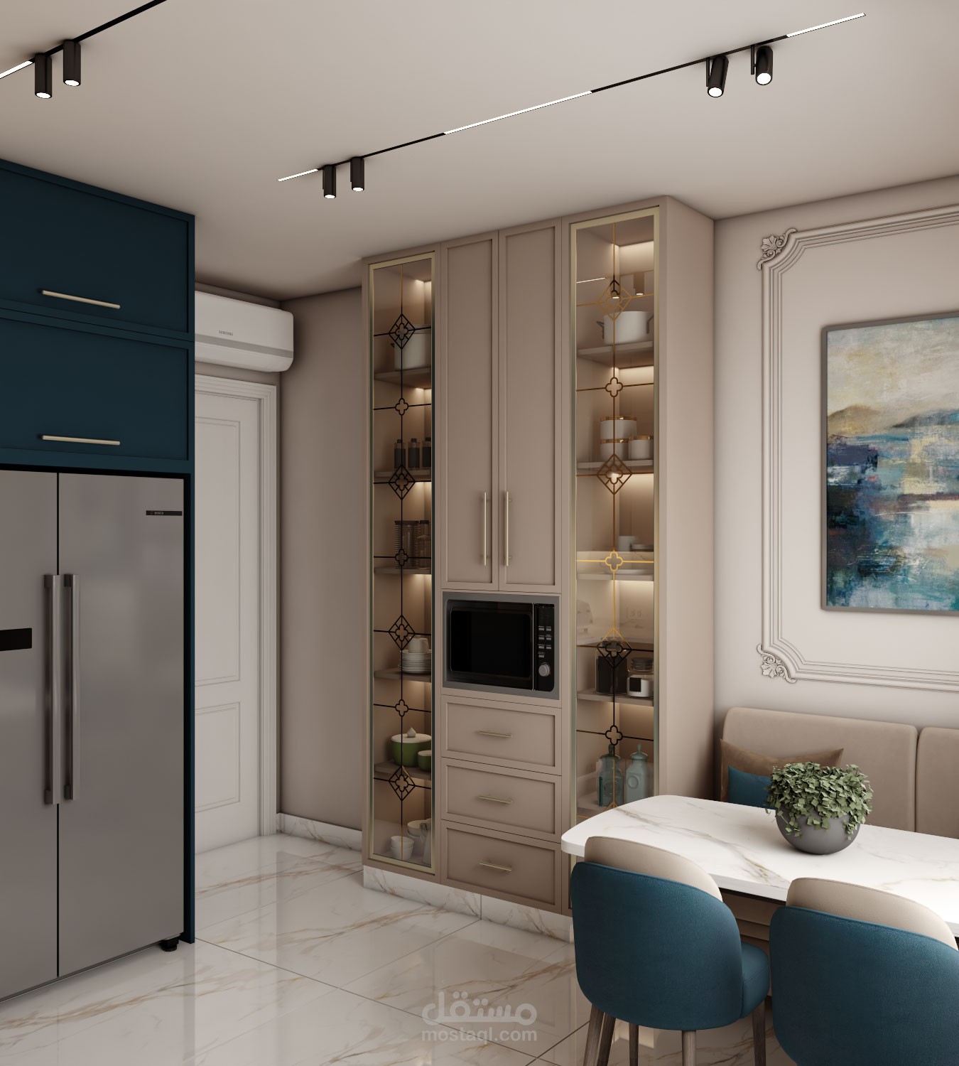 تم تصميم هذا المطبخ ليقدم تجربة طهي وعيش متكاملة حيث تتناغم الألوان العصرية مثل الأزرق الداكن والبيج الدافئ مع تشطيبات رخامية أنيقة تمنح المساحة طابعاً فاخراً وهادئاً