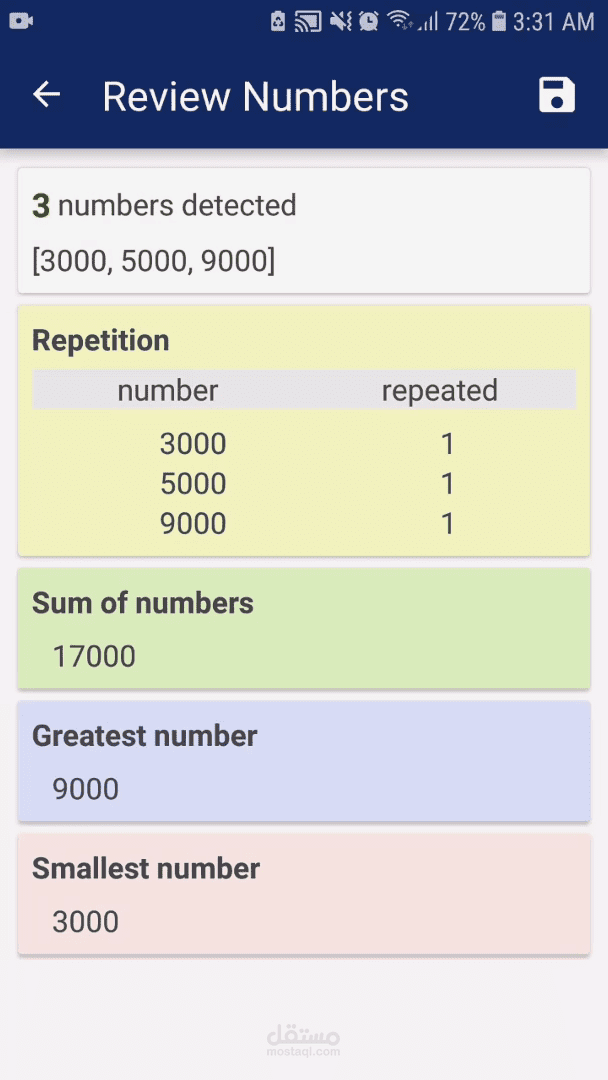 التطبيق أيضاً يستطيع عمل مسح ضوئي لمجموعة من الأرقام ثم يعرض الآتي