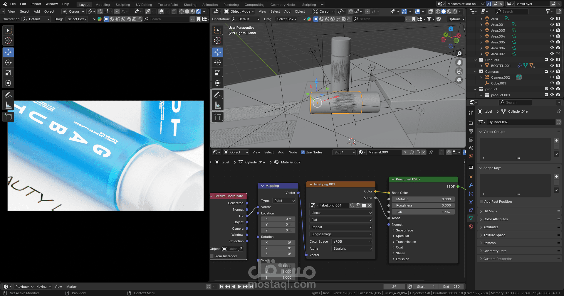 تم إنشاء خامات مخصصة للزجاجة والغطاء باستخدام Principled BSDF للحصول على انعكاسات وانكسارات واقعية.