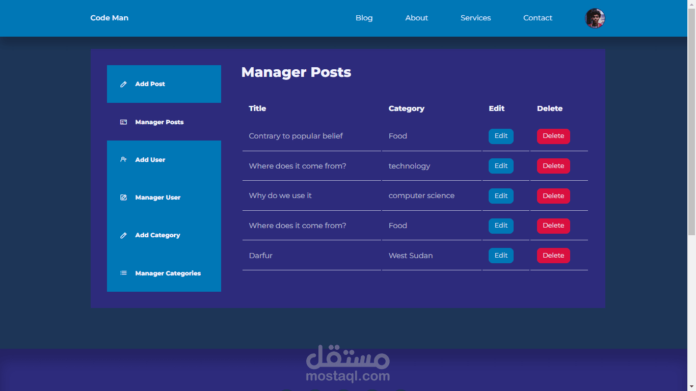 تطبيق مدونة CRUD يعمل بكامل طاقته باستخدام لوحة التحكم/لوحة التحكم باستخدام PHP وMySQL. يتميز هذا المشروع بنظام تسجيل المستخدم وتسجيل الدخول مع التحكم في الوصول، وإنشاء المنشورات، وتحديث المنشورات، وحذف المنشورات، وإضافة مستخدمين، وتحديث المستخدمين، وحذف المستخدمين، وإنشاء فئات، وتحديث الفئات، وحذف الفئات، والمزيد!