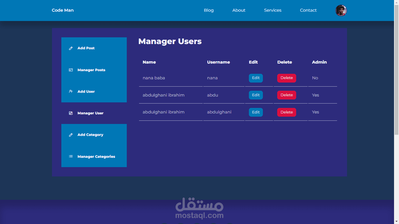 يمكن للمسؤول أن يفعل كل ما يمكن للمؤلف أن يفعله، وأكثر من ذلك. سيتمكن المسؤول من (إضافة/تحرير/حذف) المستخدمين (المسؤول/المؤلف)، وإدارة (إضافة/تحرير/حذف) الفئات.