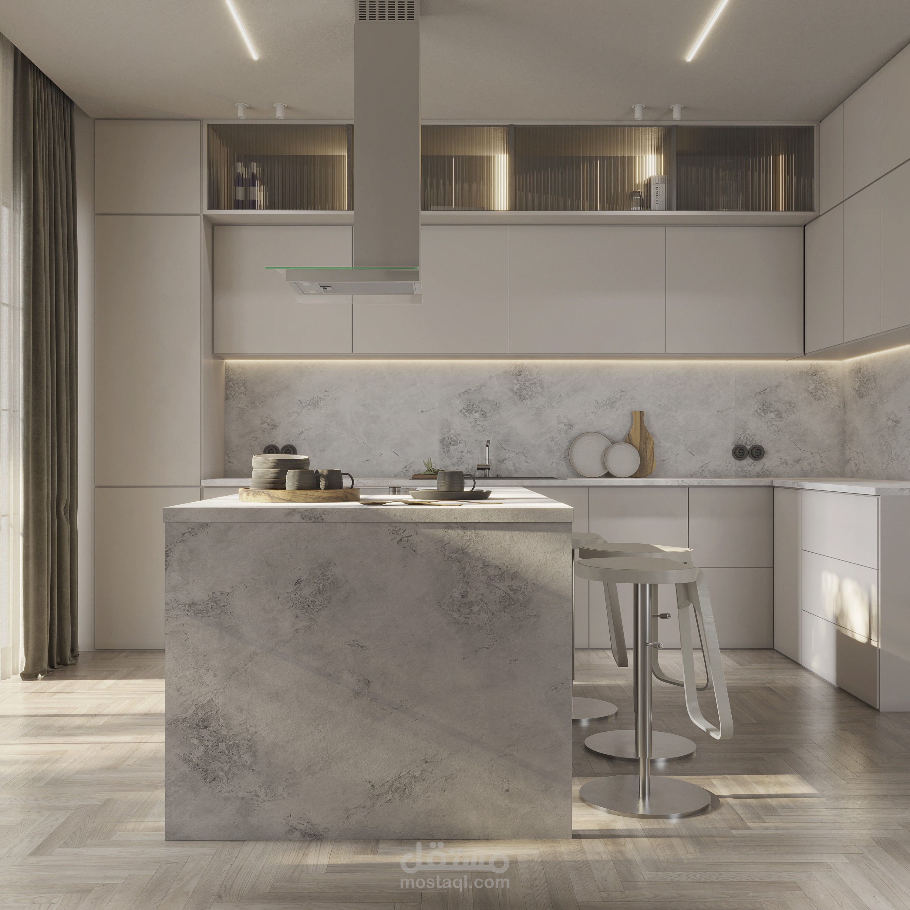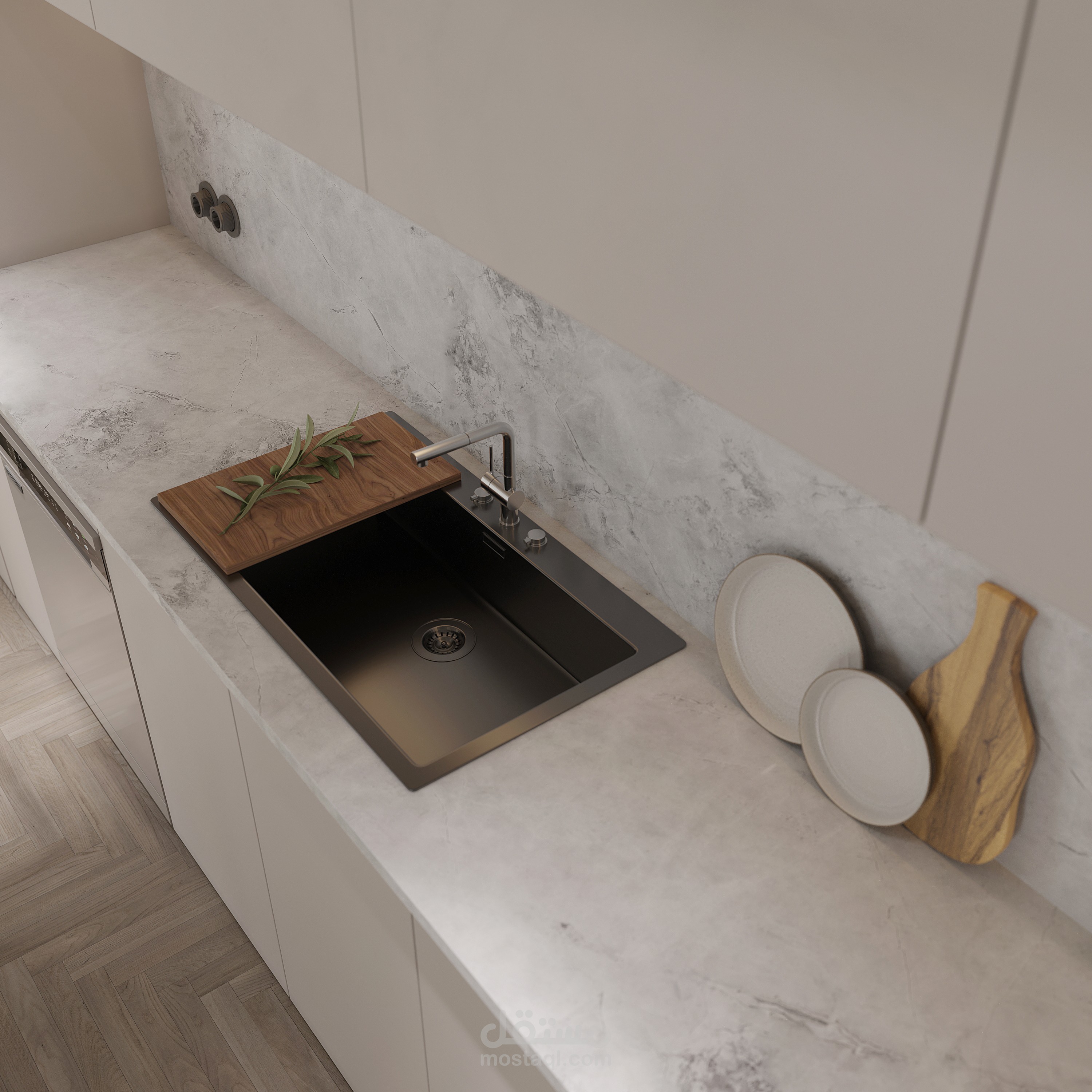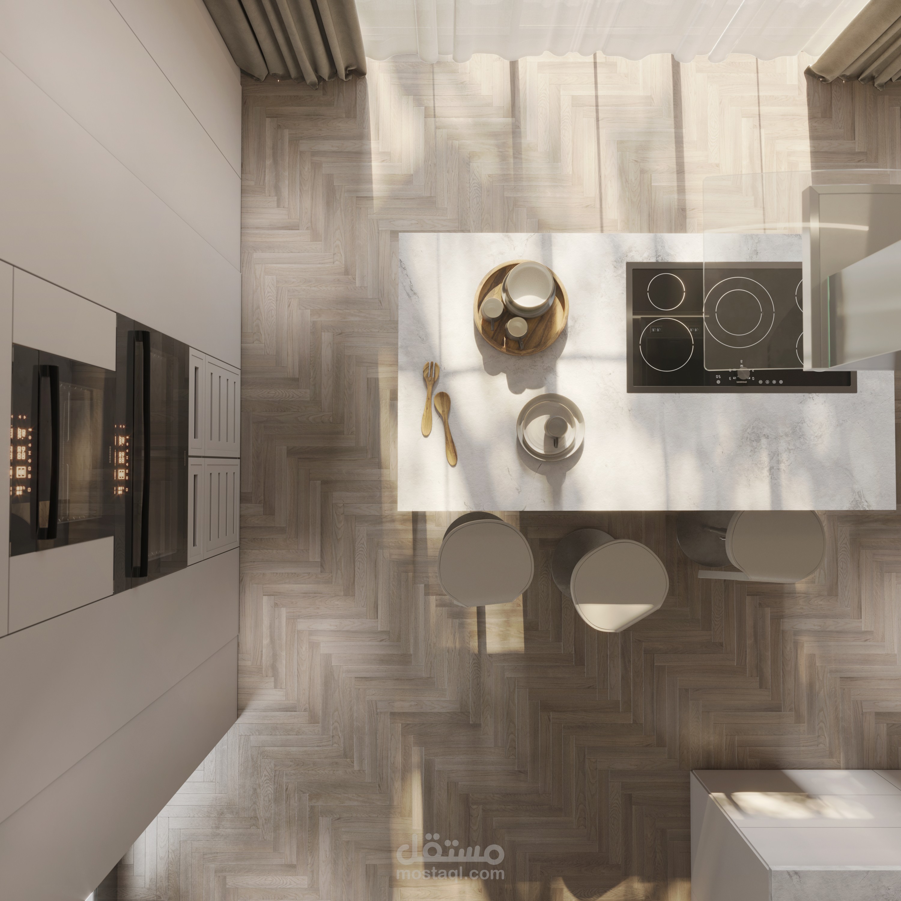 تم اعتماد اسلوب البساطة والرقي واختيار الوان وخامات طبيبعبه جدا والتي تساهم في انبعاث الراحة والسكون والبساطة , وتم وضع جميع الاجهزة في اماكنها الافضل للاستخدام لتوفير اقصى سهولة للاستخدام وأكثر راحه ..