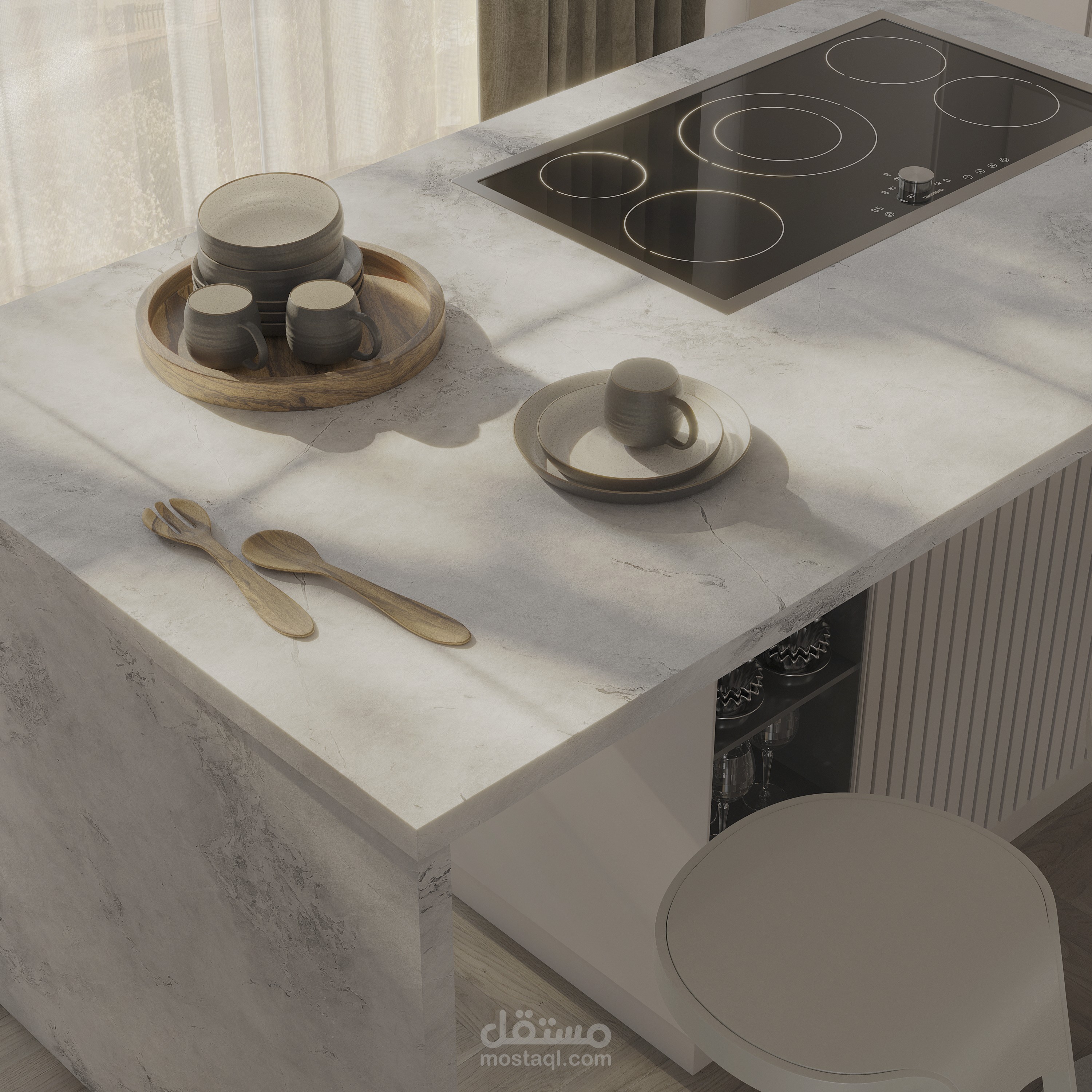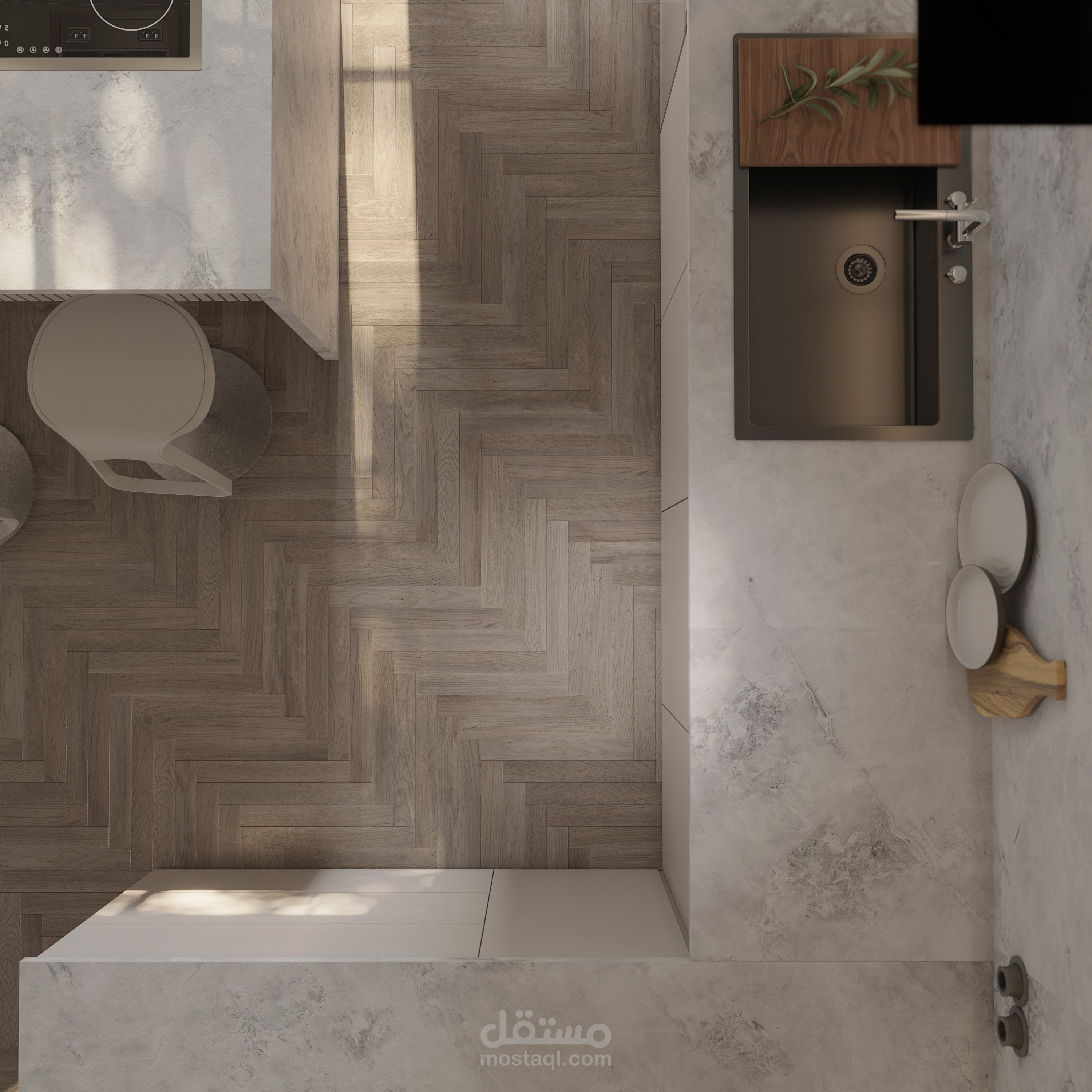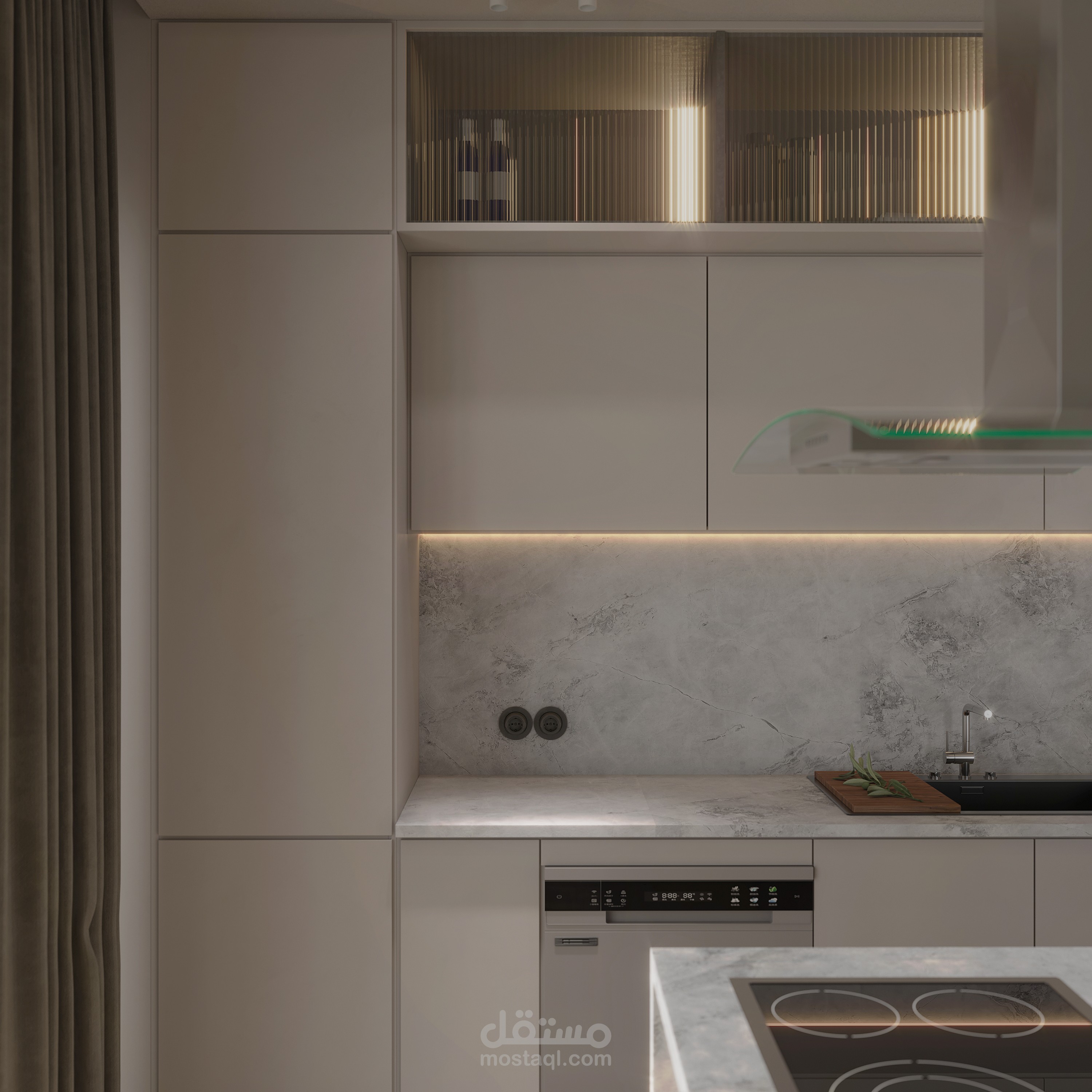 تم اعتماد اسلوب البساطة والرقي واختيار الوان وخامات طبيبعبه جدا والتي تساهم في انبعاث الراحة والسكون والبساطة , وتم وضع جميع الاجهزة في اماكنها الافضل للاستخدام لتوفير اقصى سهولة للاستخدام وأكثر راحه ..