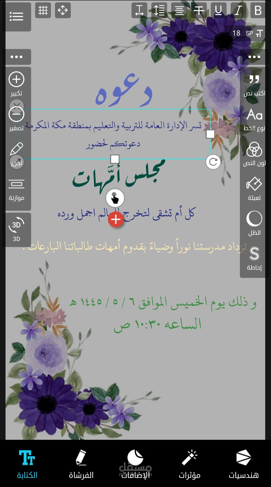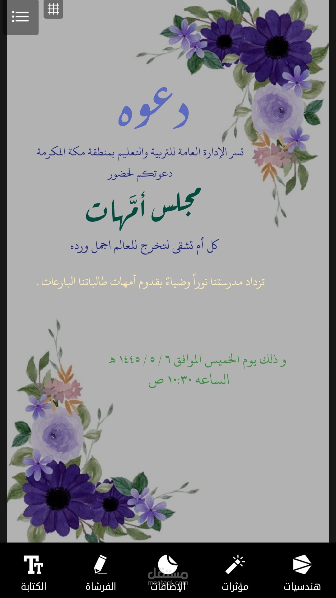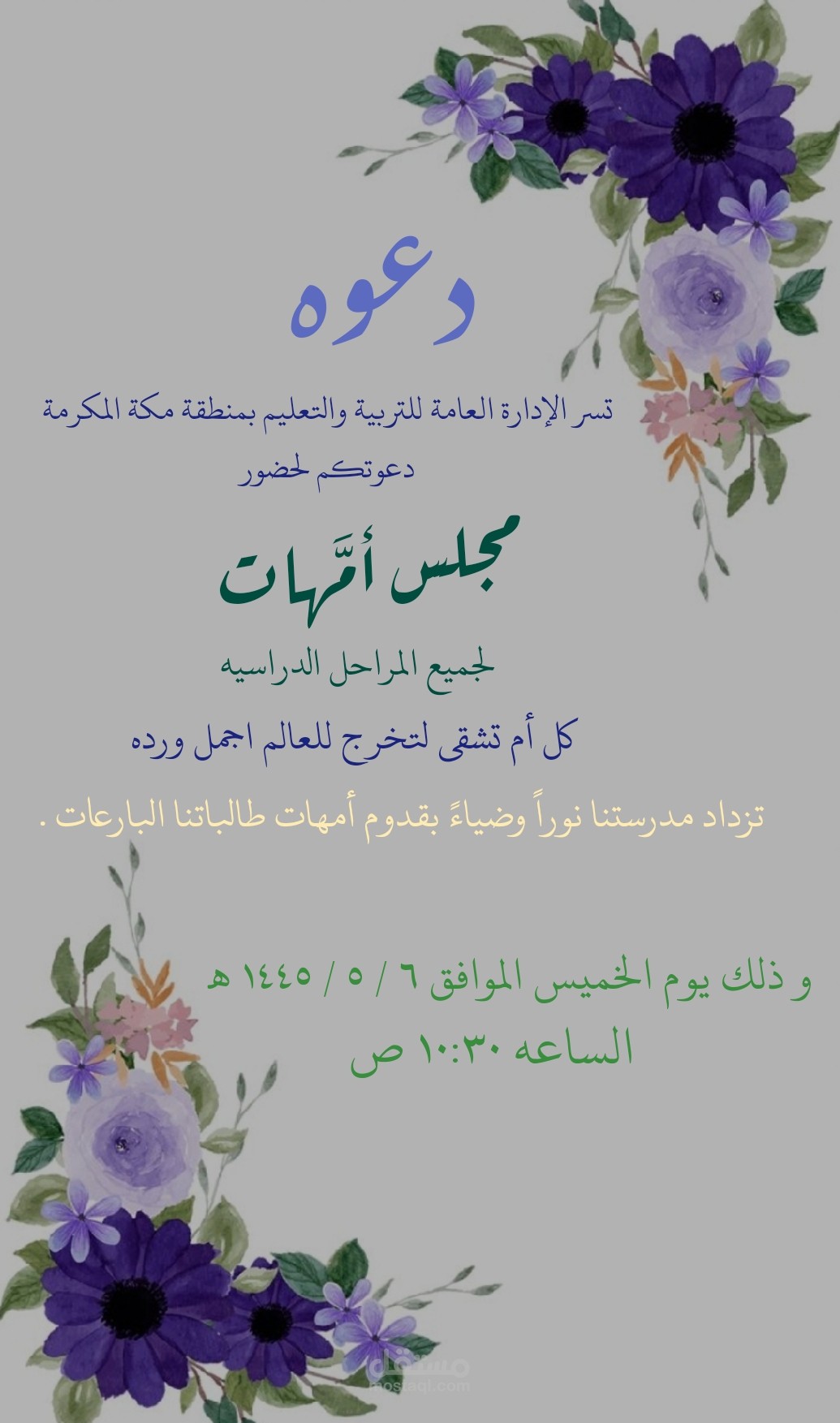 تصميم دعوه مدرسيه لحضور مجلس امهات للطالبات في جميع المراحل الدراسيه بخلفية ورود بنفسجية اللون والوان الخطوط المتناسقه مع الخلفيه المختاره ، تم عمله بسرعه مذهله خلال ٢٥ دقيقه فقط .