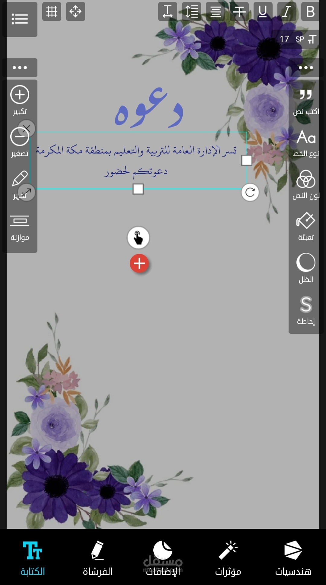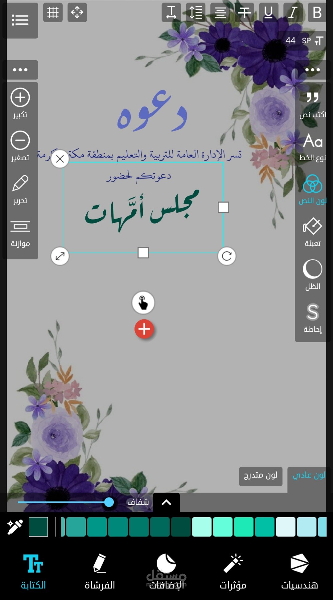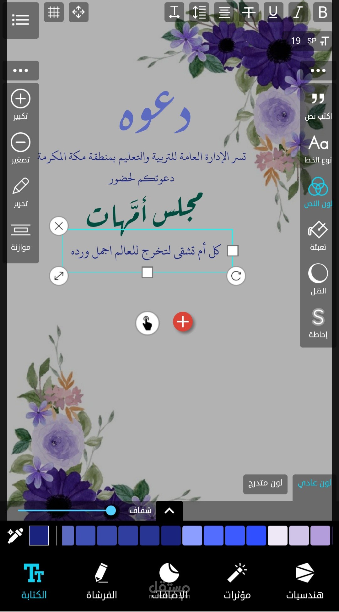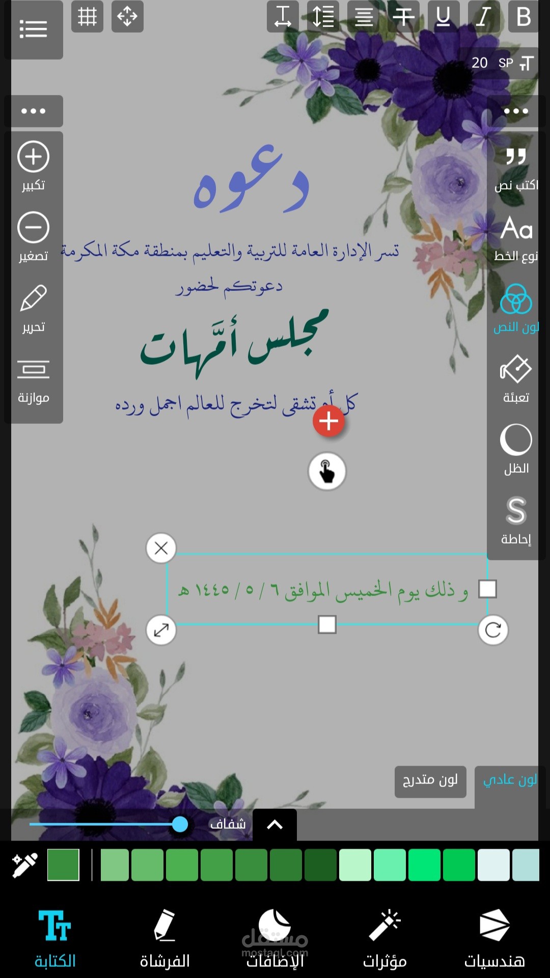 تصميم دعوه مدرسيه لحضور مجلس امهات للطالبات في جميع المراحل الدراسيه بخلفية ورود بنفسجية اللون والوان الخطوط المتناسقه مع الخلفيه المختاره ، تم عمله بسرعه مذهله خلال ٢٥ دقيقه فقط .