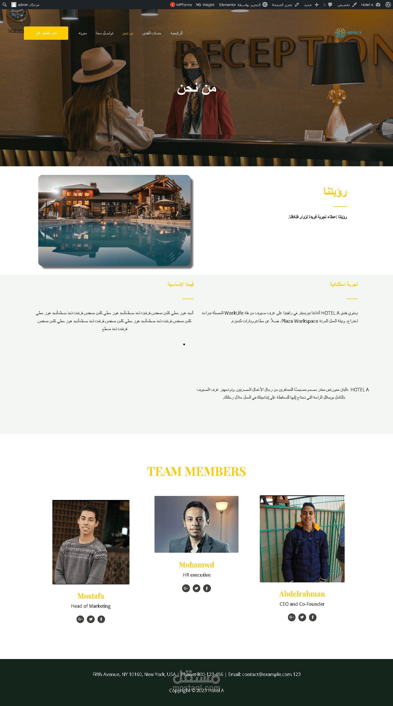 "قمت بتصميم موقع ويب رائع لفندق باستخدام تكنولوجيا متقدمة. استخدمت WordPress كمنصة أساسية لإدارة المحتوى وبناء الصفحات بسهولة وسلاسة. بالإضافة إلى ذلك، استفدت من إضافة Elementor لتحسين واجهة المستخدم وإنشاء تجربة تصفح فريدة وجذابة.