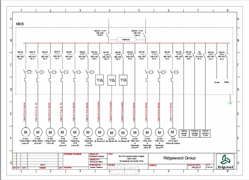 Design Single Line Diagram for waste water treatment plant capacity 1200 m3/d after review all Electrical load for all electrical equipment