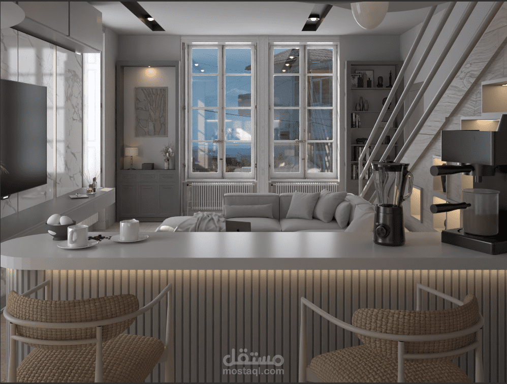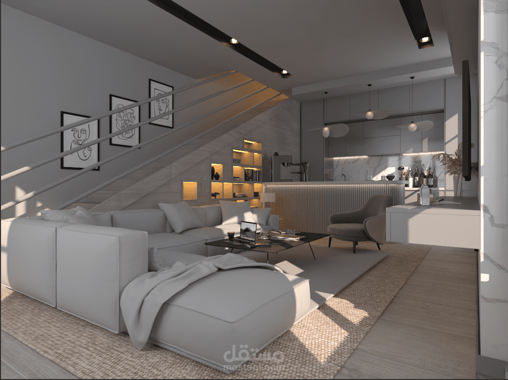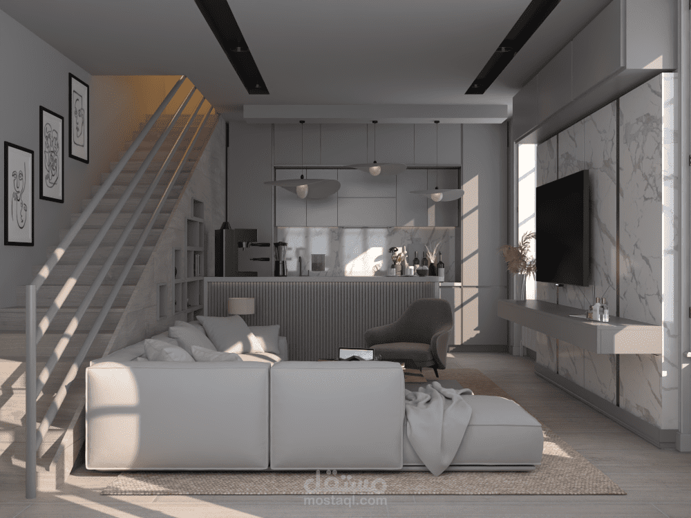 تصميم داخلي لمنزل يضم فراغ المعيشة مع مطبخ مفتوح بالاضافة الى مطلع الدرج للطابق الأول.