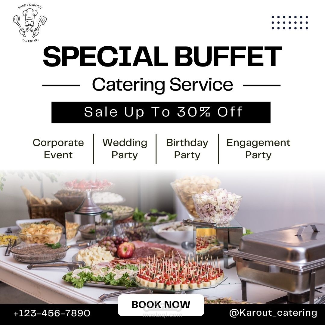 Showcase the variety and quality of catering services offered. Highlight the specialties and unique selling points of the catering business. Promote upcoming events or special catering packages. Develop a concept that aligns with the brand identity and the type of catering services offered, whether it's upscale, casual, themed, etc. Consider the target audience and tailor the design to appeal to their preferences and interests.