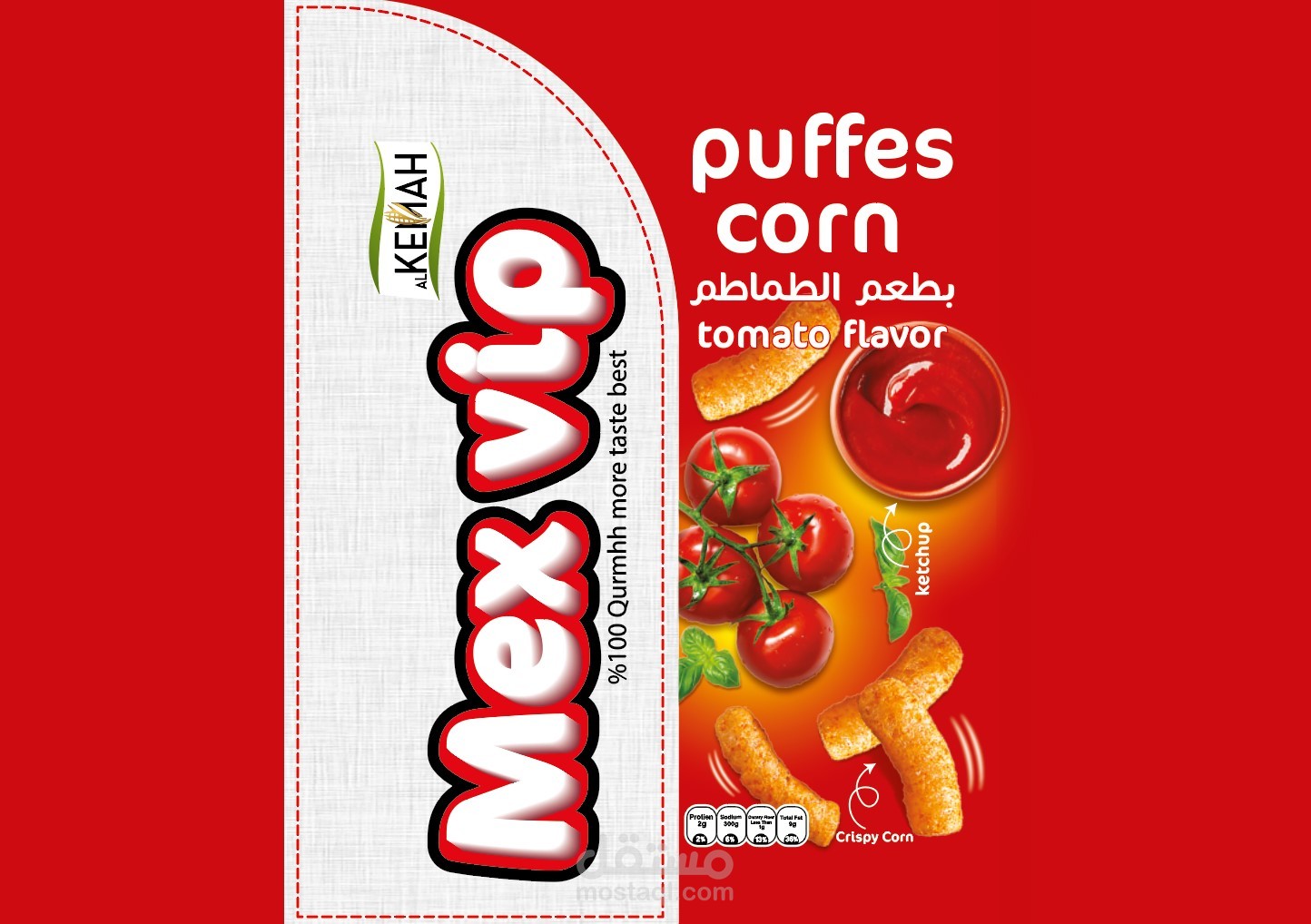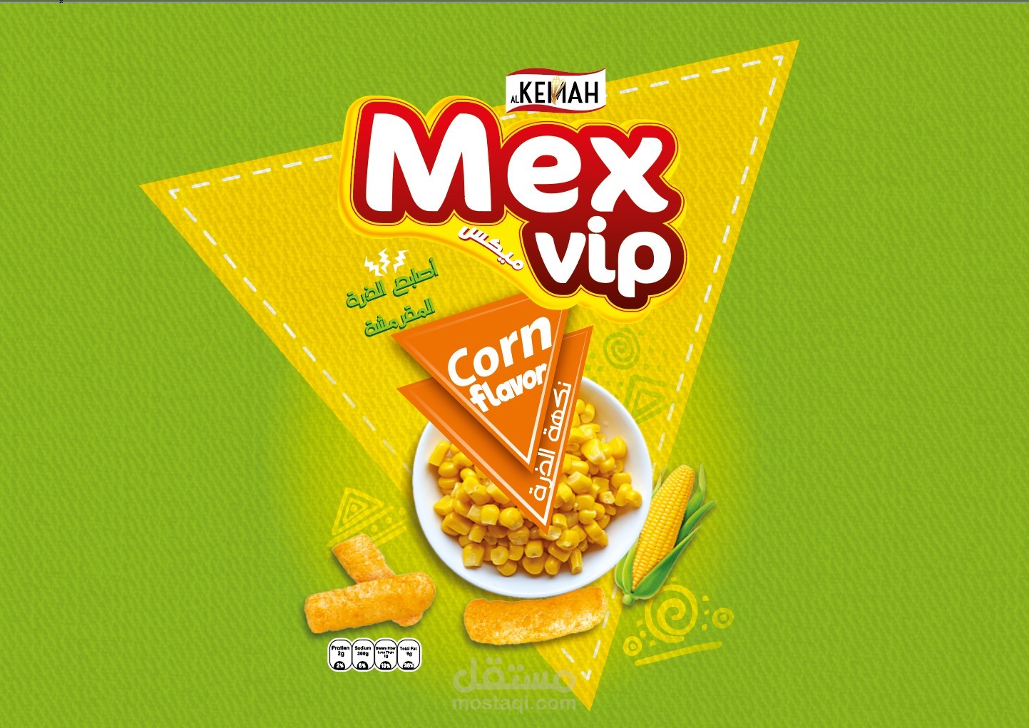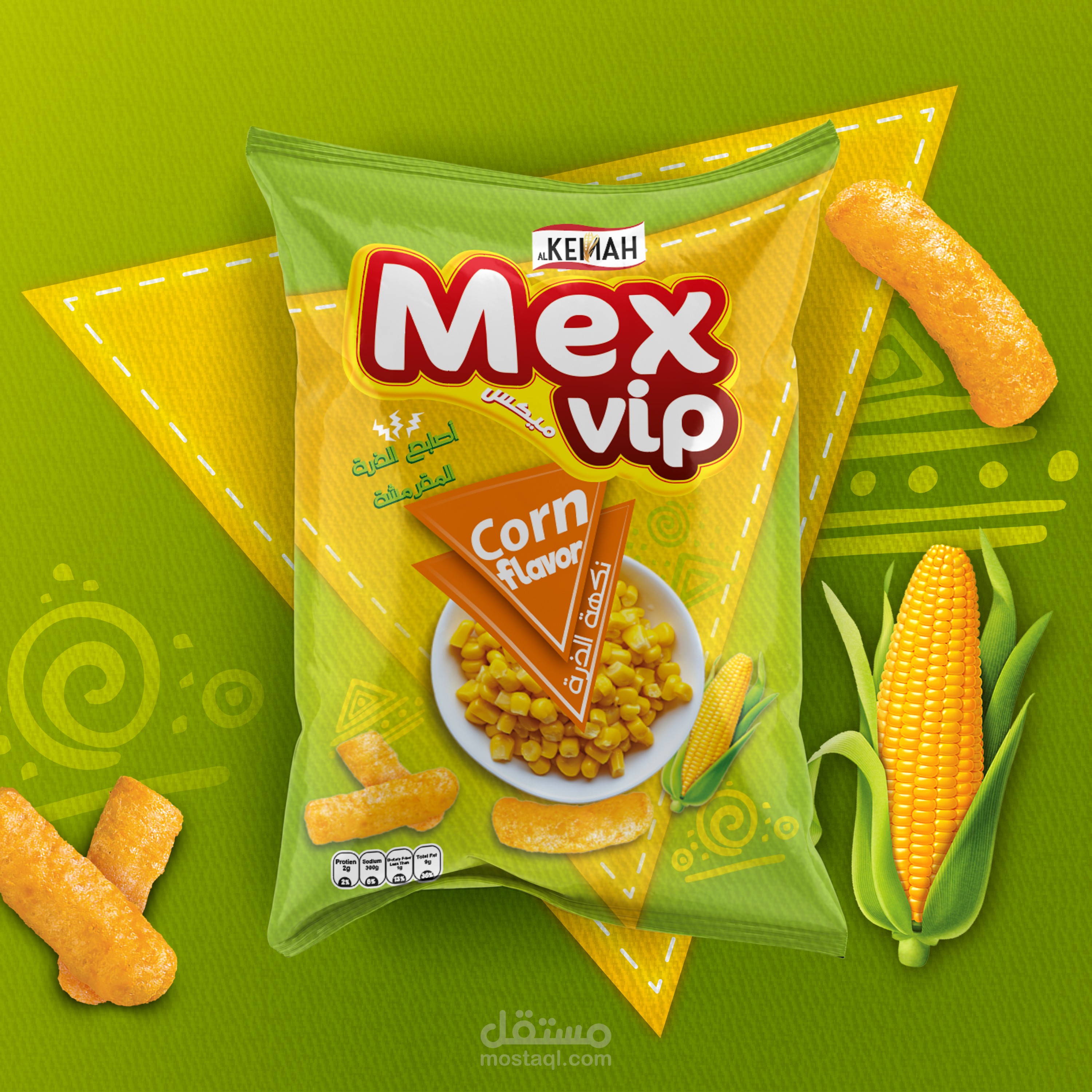 Chips Mix VIP, 3 Flavors, ketchup, corn and noodles. I used a group of eye-catching colors that suggest fresh natural colors to indicate the use of natural ingredients similar to the Flavors. I used a group of symbols and elements that bring happiness to the soul and activity.