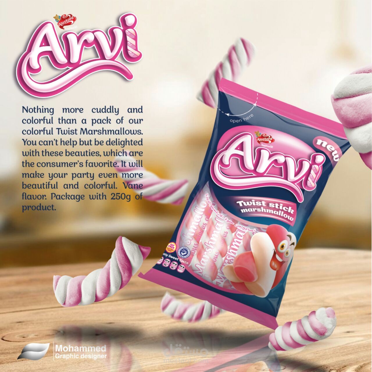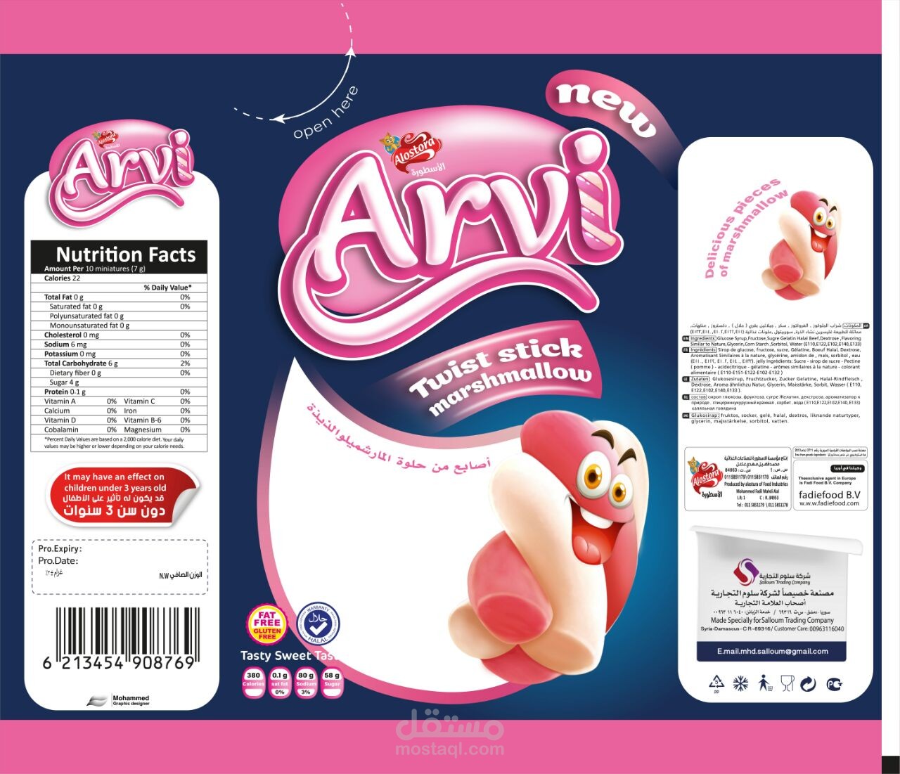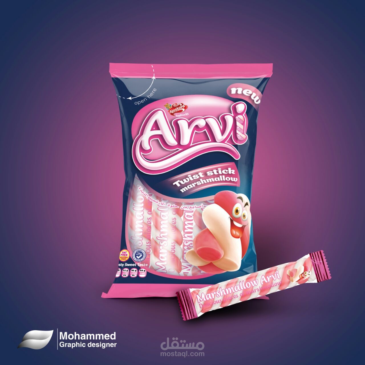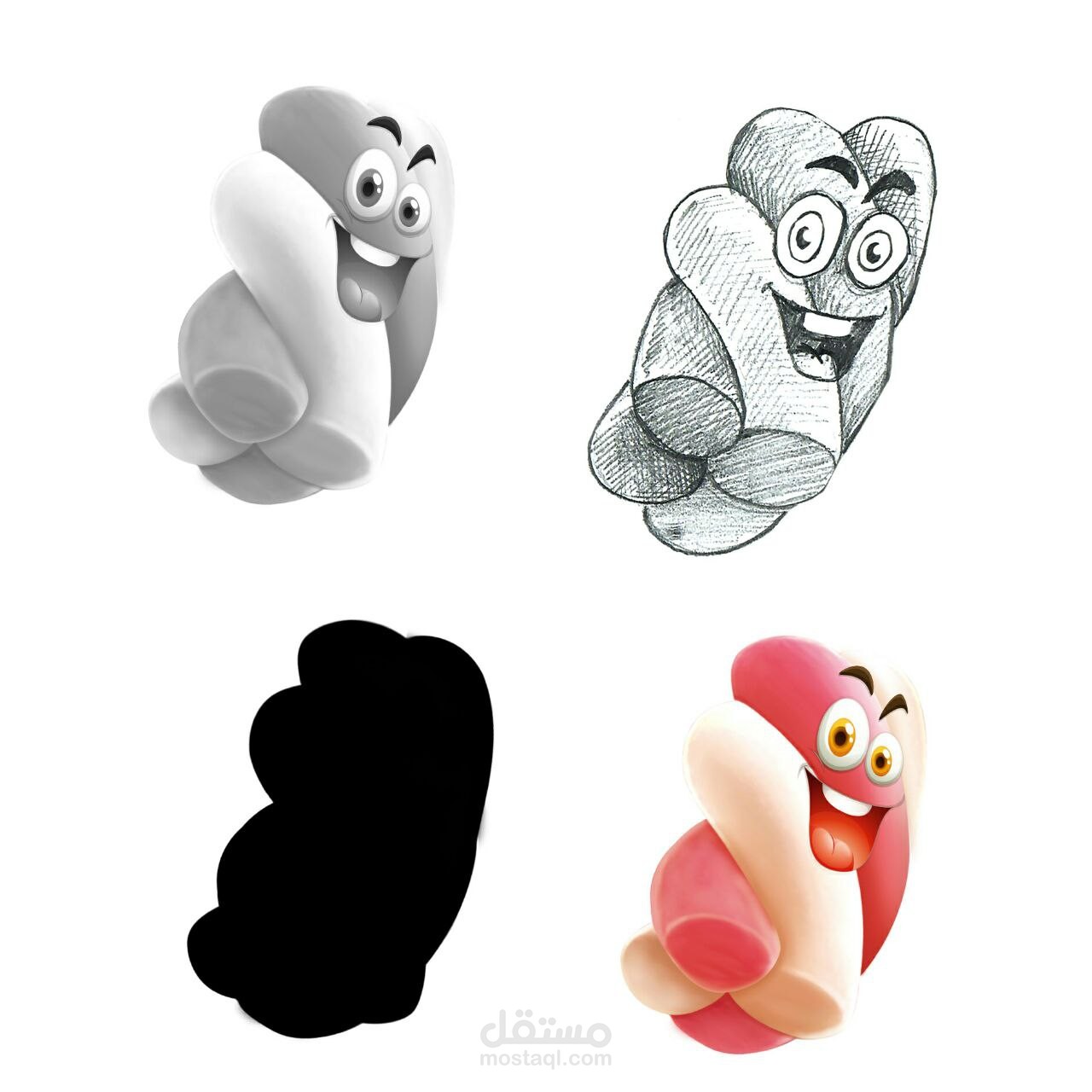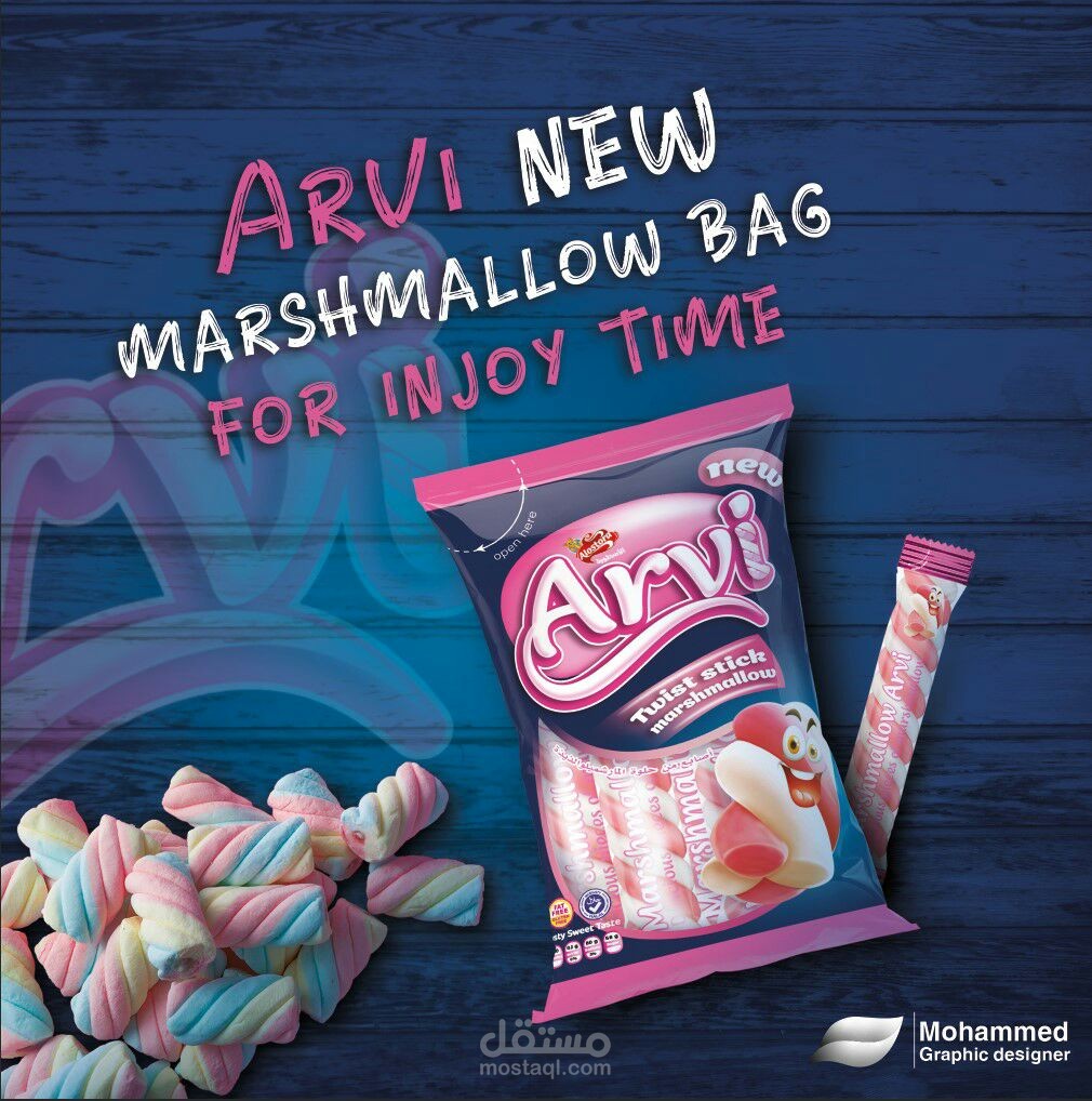 Design a marshmallow bag with a drawing of a cartoon character in the shape of a marshmallow and design of social media posters