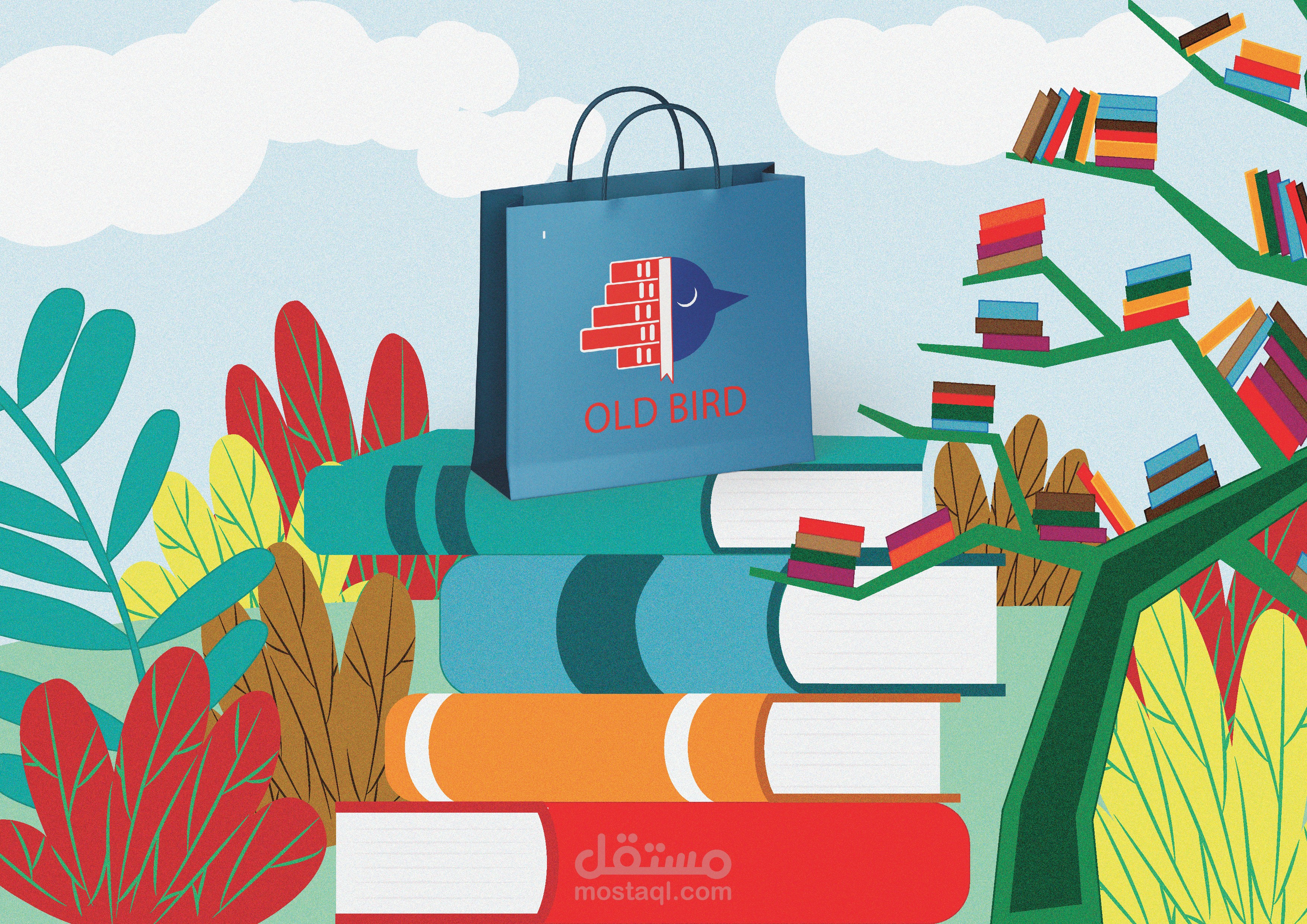 هذا رسم illustration توضيحي للوجو old bird يوضح طبيعه اللوجو المتمثله في الكتب فهو لوجو مكتبه