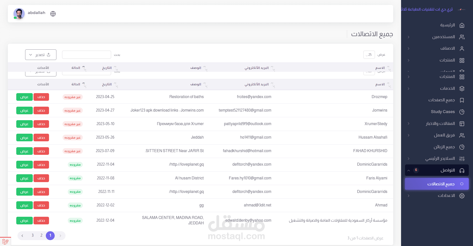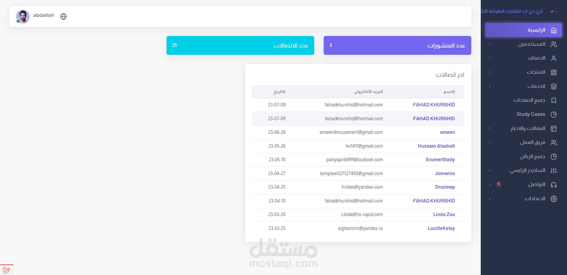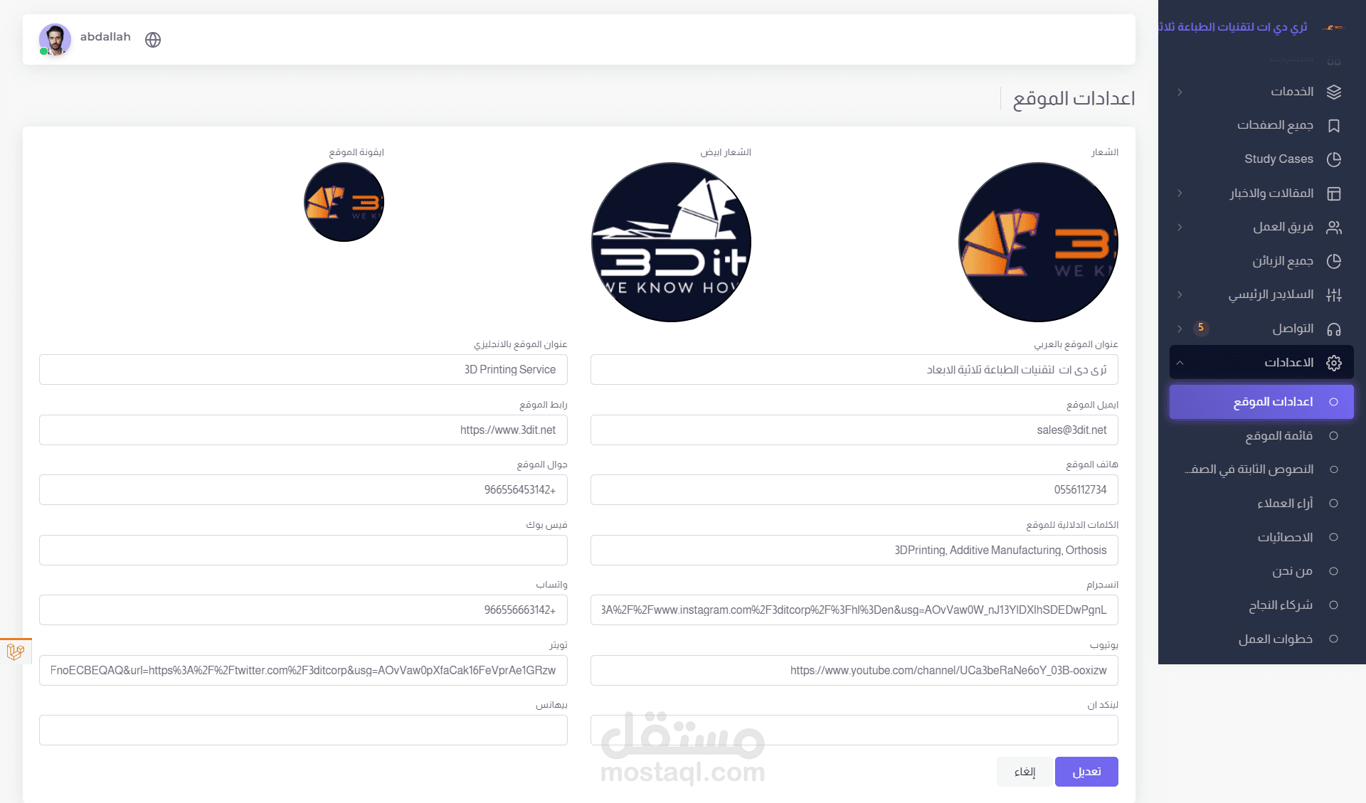 * إدارة محتوى الموقع بكل سهولة، بما في ذلك إضافة وتعديل وحذف لكل الجداول في لوحة التحكم مع إظهار رسائل الاخطاء ورسائل التأكيد عند حذف اي كائن في النظام .