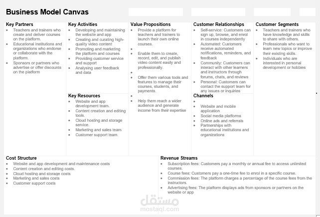 تصميم نموذج عمل Business Model Canvas مبنيًا على فكرتك و احتياجاتك، حيث نلقي الضوء على جميع جوانب مشروعك بشكل مفصل. اساعدك في تحديد جمهورك المستهدف وكيفية الوصول إليهم، ونقوم بتحليل المنافسين وتحديد الشركاء الرئيسيين. بالإضافة إلى ذلك، سنساعدك في تحديد الموارد الأساسية وتقدير التكاليف والإيرادات المتوقعة.