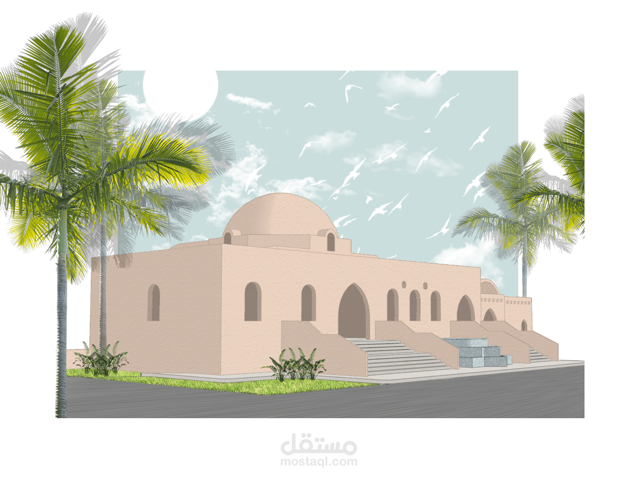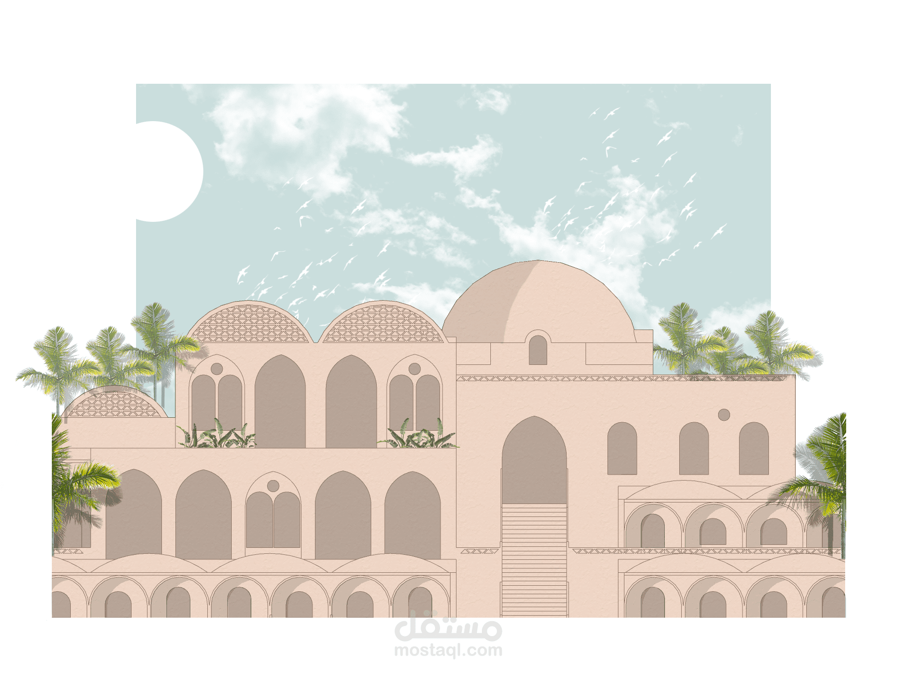this a render of my project done using sketch up for the 3d model and Photoshop for the artistic render to give a feeling of cutout renders and artistic feeling to the image.